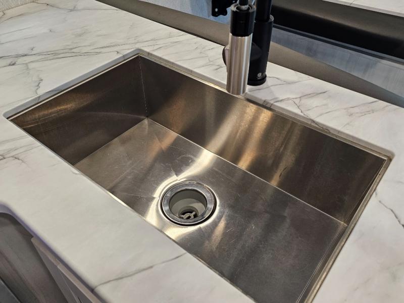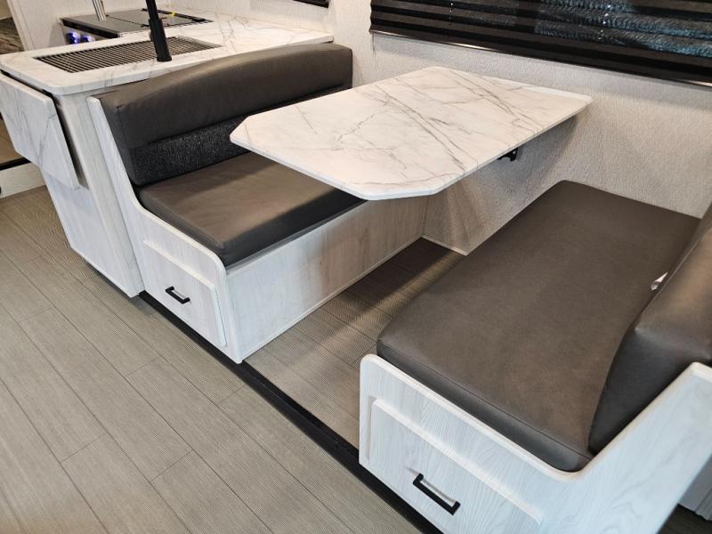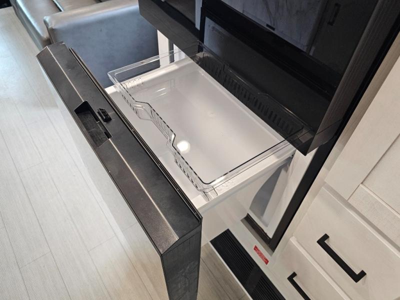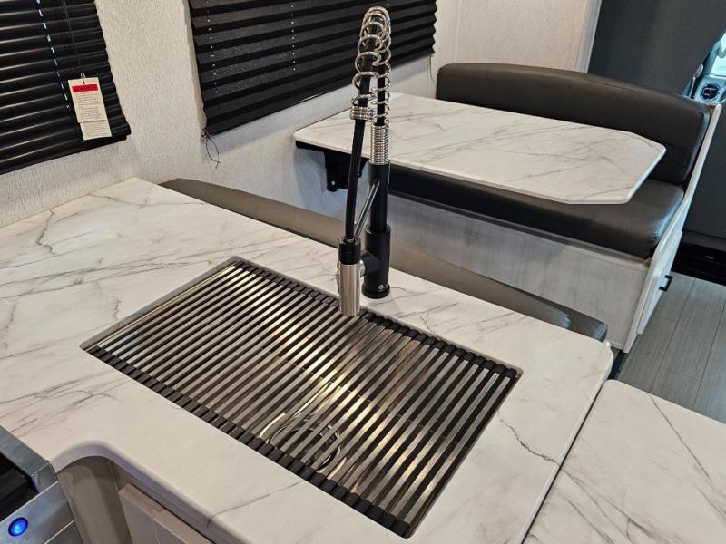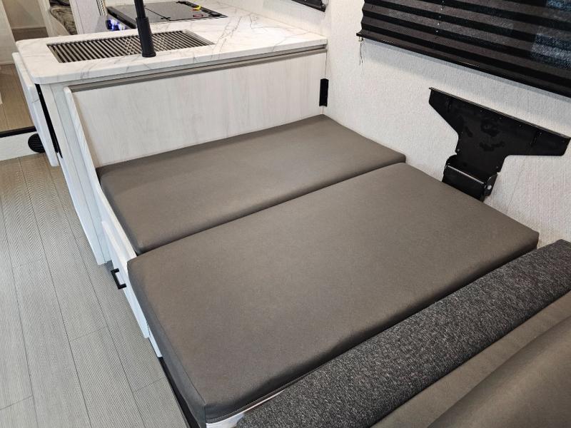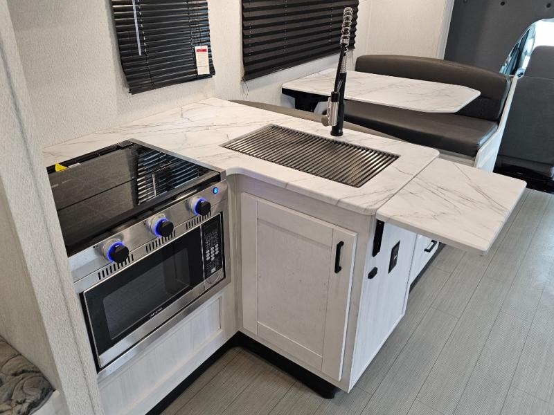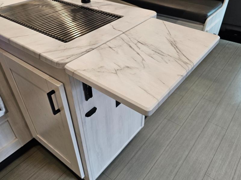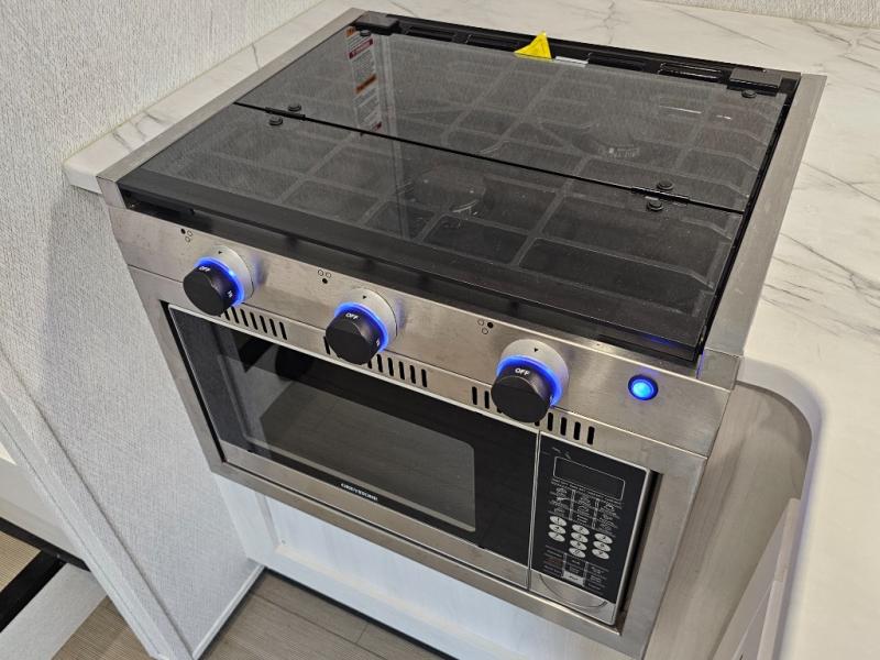 Fully equipped with a microwave, 3-burner cooktop, and 12V 6 cu. ft. refrigerator.