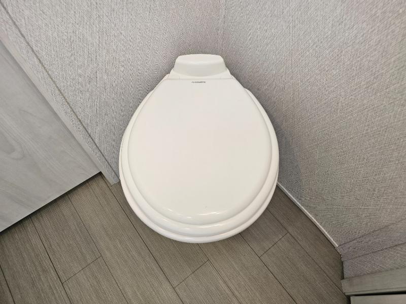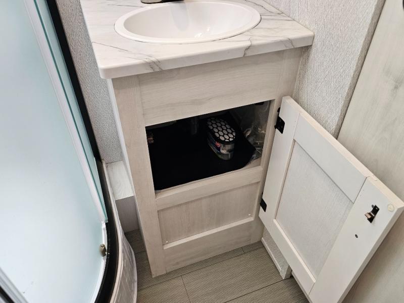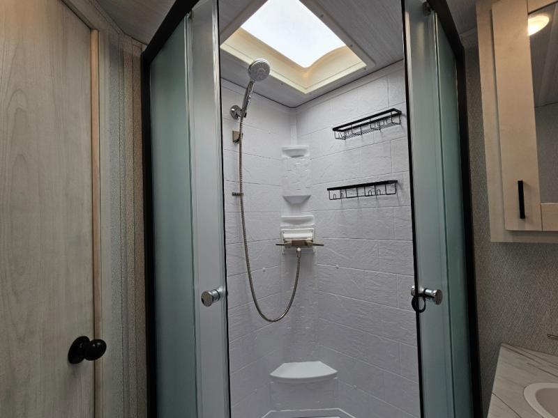 Includes a full shower, toilet, sink, and medicine cabinet for convenience.