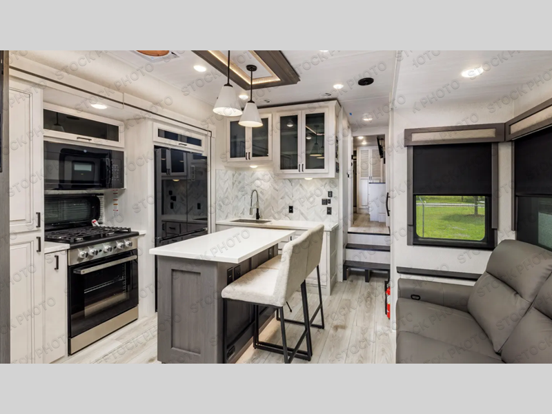 Your friends and family will be begging you to take them with you camping in this feature-packed fifth wheel! Once your toys are unloaded from the separate garage, you can enjoy the 3-seasons door with tinted sliding windows and the rear deck system with an awning and steps. Your guests can sleep here at night since there is a drop-down queen bed, two happijac sofas, plus a loft with a ladder and a 28" x 70" mat. There is even a half bath here for convenience! The main living area will be a favorite place to visit together with its large sofa, 50" TV with a fireplace, and spacious kitchen island with two stools and countertop extensions. The chef of your group will also love the additional counter space and deep-seated stainless steel farmhouse sink, the GE Profile free-standing gas range and convection microwave/air fryer, plus the 16 cu. ft. 12V French door refrigerator with a double drawer freezer. Everyone can take turns cleaning up in the full bath towards the front, and you are sure to enjoy the front private bedroom all to yourselves. Here, you'll find a king bed slide out with bedside shelves and underbed storage, a dresser with a 32" TV, plus a front wardrobe and a wardrobe with washer/dryer prep!
