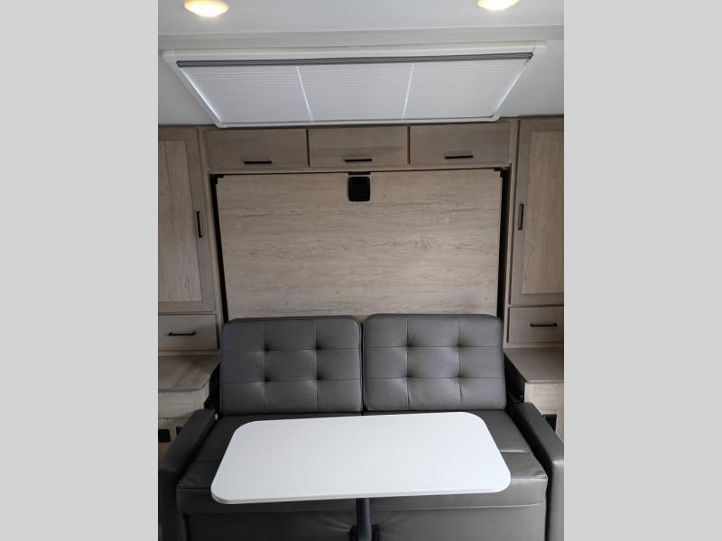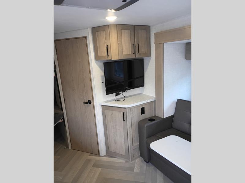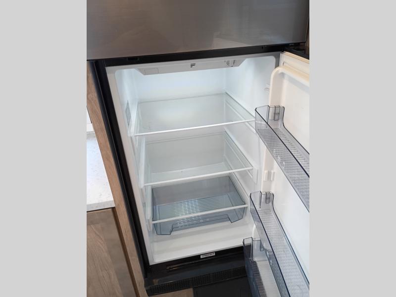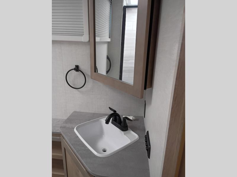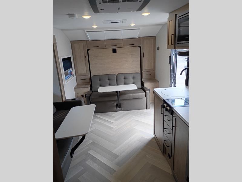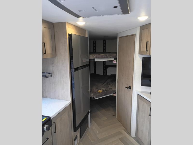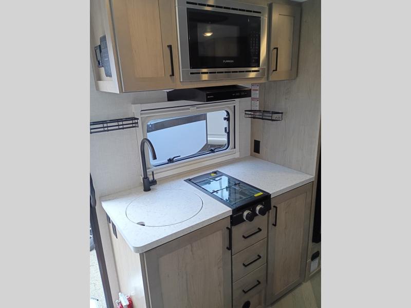 You're going to love everything about this travel trailer that can comfortably sleep three to six people each night, depending on your bunk configurations. There is a spacious storage locker that can be used for hiking gear, plus a kayak/bike storage door for quick and easy packing. The Embertrack system lets you convert the benches to twin bunks, double-size bunks, a desk, or remove them altogether for more storage space. You will enjoy the queen-size Murphy bed up front, along with the "stargazer" skylight for nighttime views, along with dual nightstands and dual wardrobes to keep your clothes tidy. And in the morning you can relax on the jack-knife sofa with a removable table once the bed is put away. This trailer also includes a full kitchen with a 12V refrigerator, an air fryer convection microwave oven, a dual burner cooktop, and a stainless steel sink for easy clean-up.