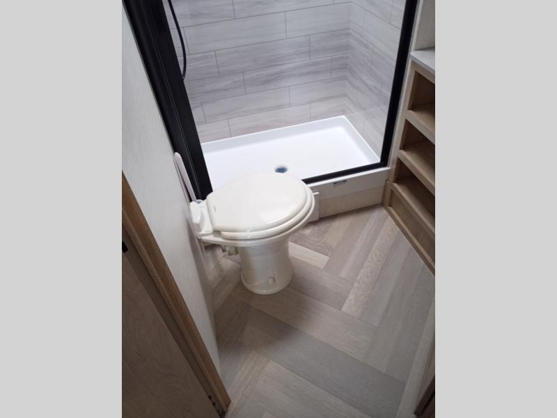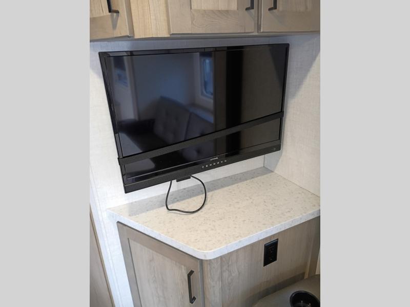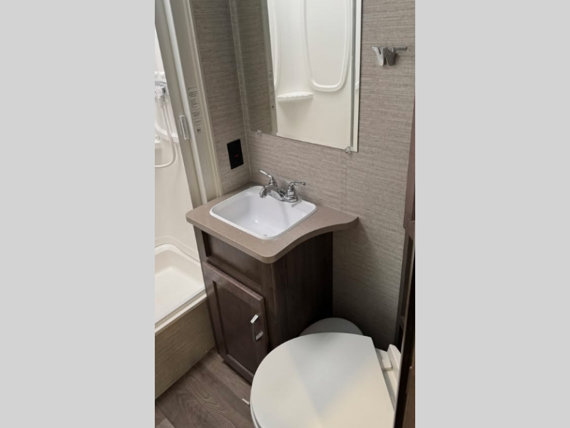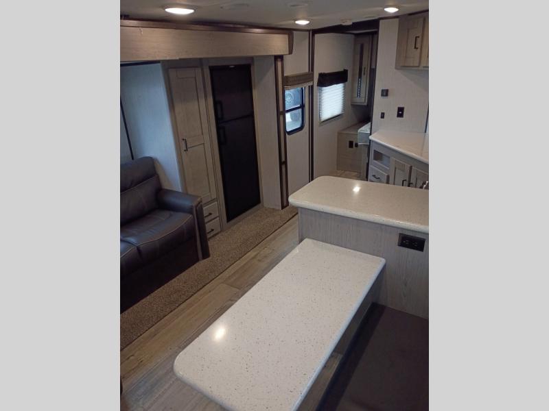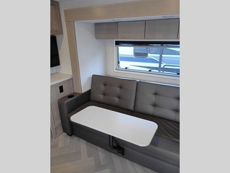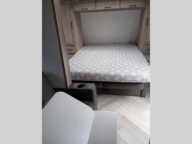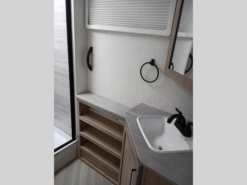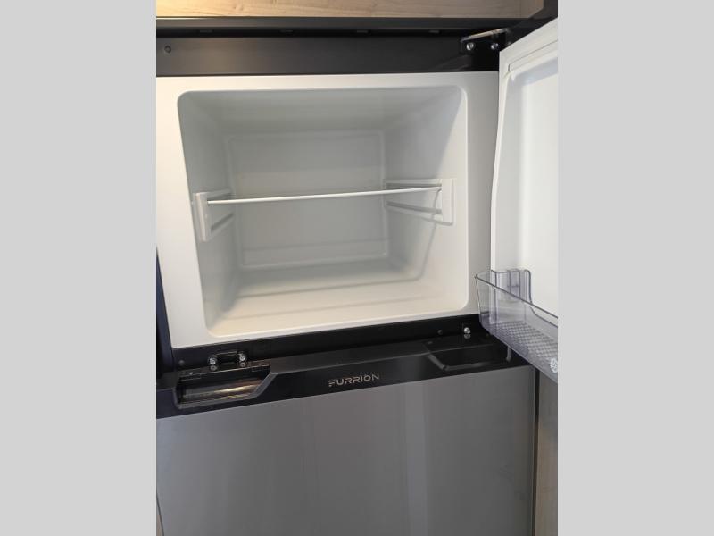 You're going to love everything about this travel trailer that can comfortably sleep three to six people each night, depending on your bunk configurations. There is a spacious storage locker that can be used for hiking gear, plus a kayak/bike storage door for quick and easy packing. The Embertrack system lets you convert the benches to twin bunks, double-size bunks, a desk, or remove them altogether for more storage space. You will enjoy the queen-size Murphy bed up front, along with the "stargazer" skylight for nighttime views, along with dual nightstands and dual wardrobes to keep your clothes tidy. And in the morning you can relax on the jack-knife sofa with a removable table once the bed is put away. This trailer also includes a full kitchen with a 12V refrigerator, an air fryer convection microwave oven, a dual burner cooktop, and a stainless steel sink for easy clean-up.