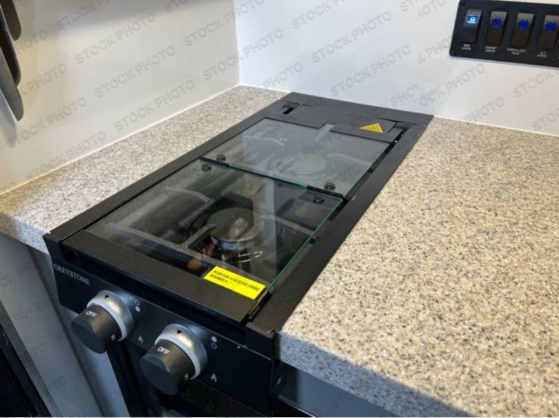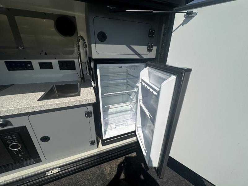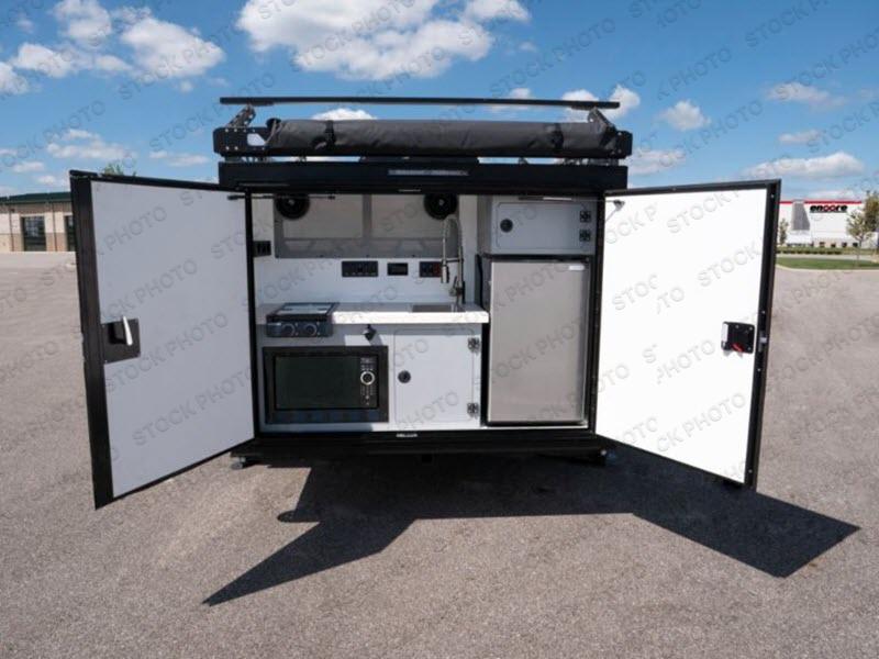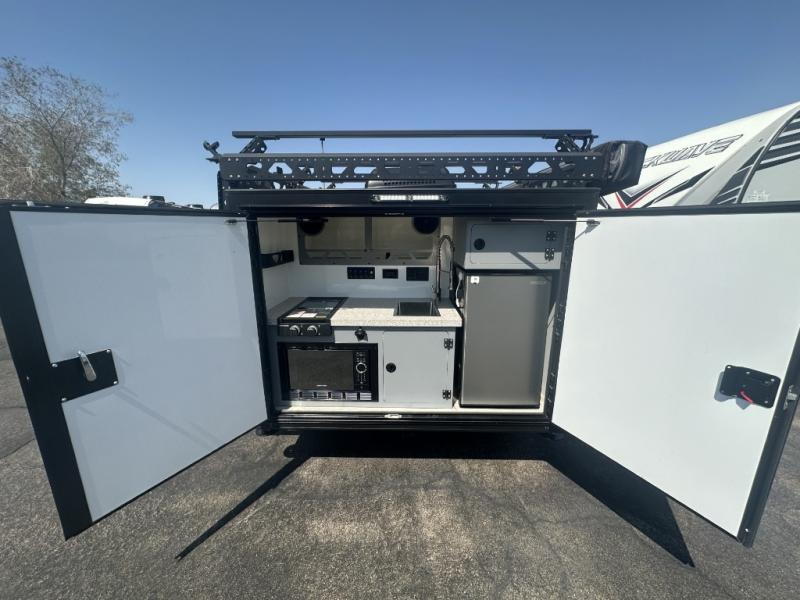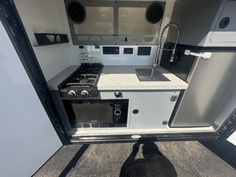 You will be so excited to test out this ROG travel trailer for yourself! The interior has great storage solutions with a front and rear recessed overhead cabinets, a storage closet with two shelves, and two storage nets for more gear. There are four LED ceiling lights to keep the interior bright, and you will appreciate two LED reading lights as you rest on the 60" x 80" futon/mattress. The rear outdoor kitchen has convenient amenities to help you eat well while you're away. You'll find a two-burner stove with cast-iron grates, a flush-mount microwave oven, a solid-surface countertop, and commercial-style faucet, plus a 12V 3.3-cubic foot refrigerator to keep your perishables nice and cold.