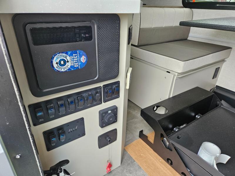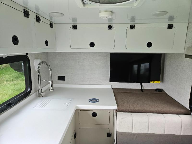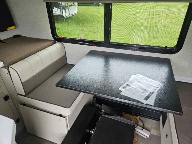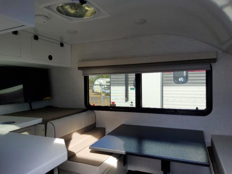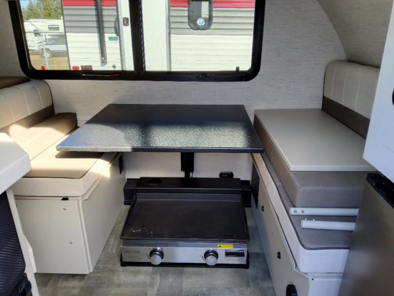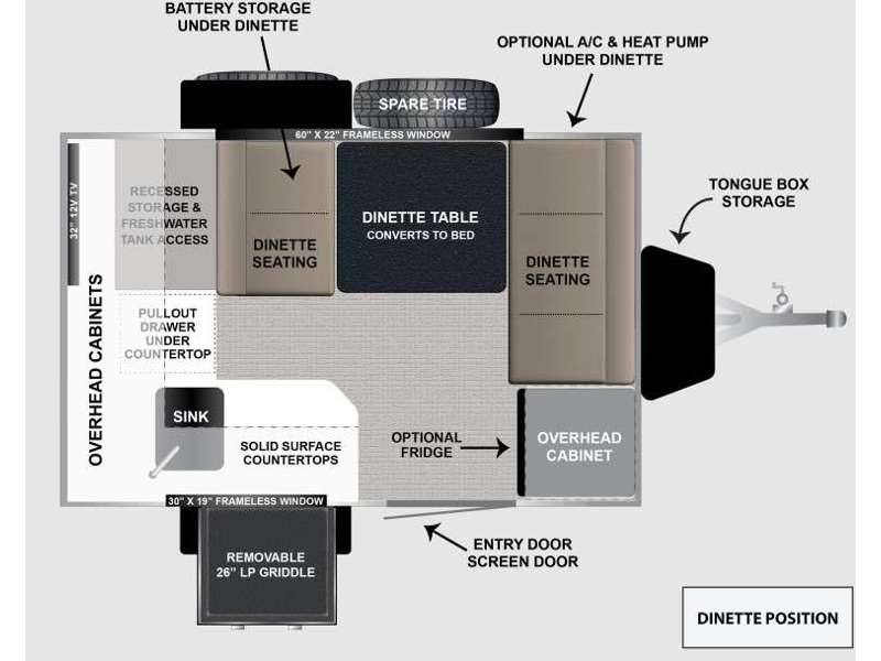 You and your spouse will enjoy the woods in this teardrop trailer! The convertible dinette transforms into an 80" x 48" bed so you can get a good night's rest after an adventurous day. The 12V power roof vent helps to circulate the air flow and the 21 gallon on-demand water system provides hot water quick. There are plenty of overhead aluminum cabinets throughout to keep your items out of the way. The entry door comes with a window and shade for added privacy or sunlight. Crank up the tunes with the Bluetooth stereo and stay connected with the TV/satellite/cable/HDMI prep. With 12V LED lighting, you will be able to see clearly day or night! Add the optional off-road package if you enjoy a little boondocking off the beaten path!
