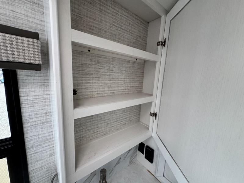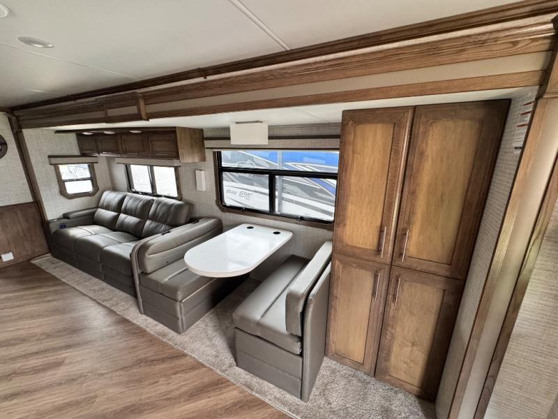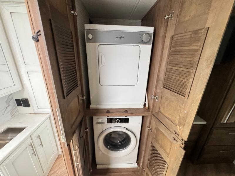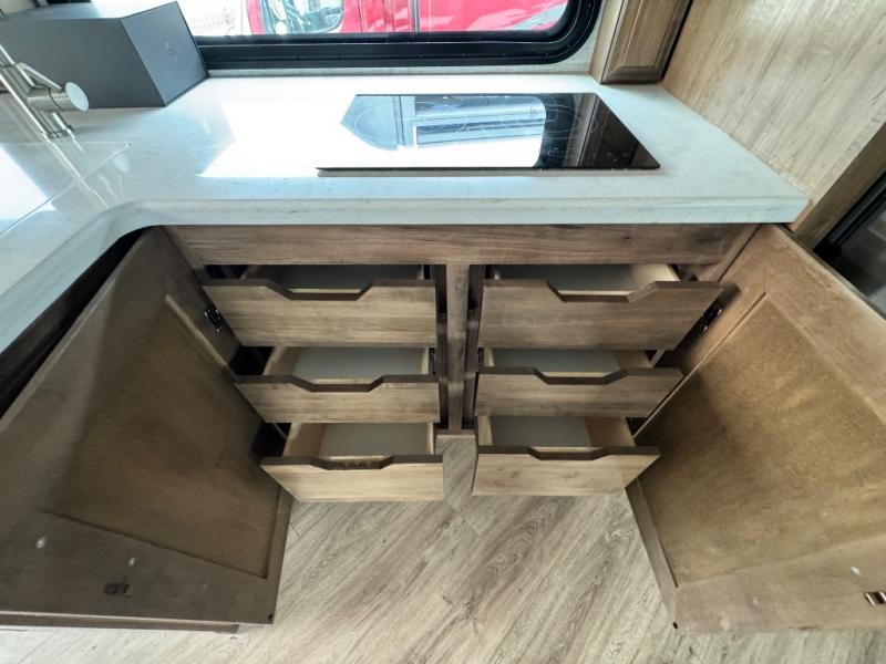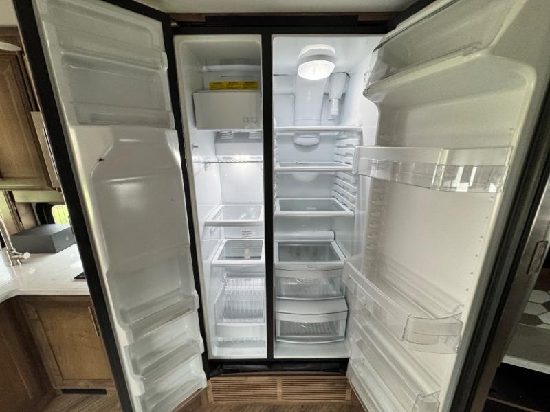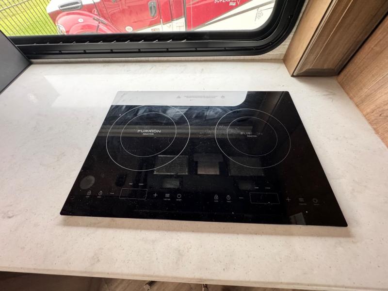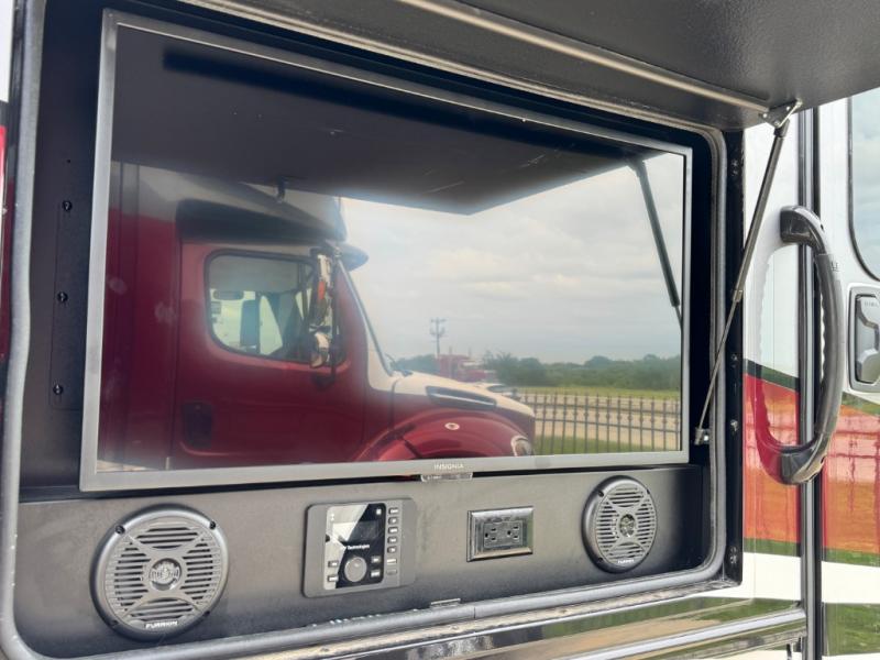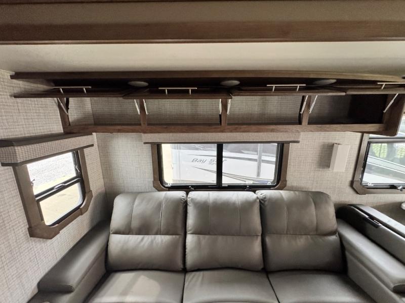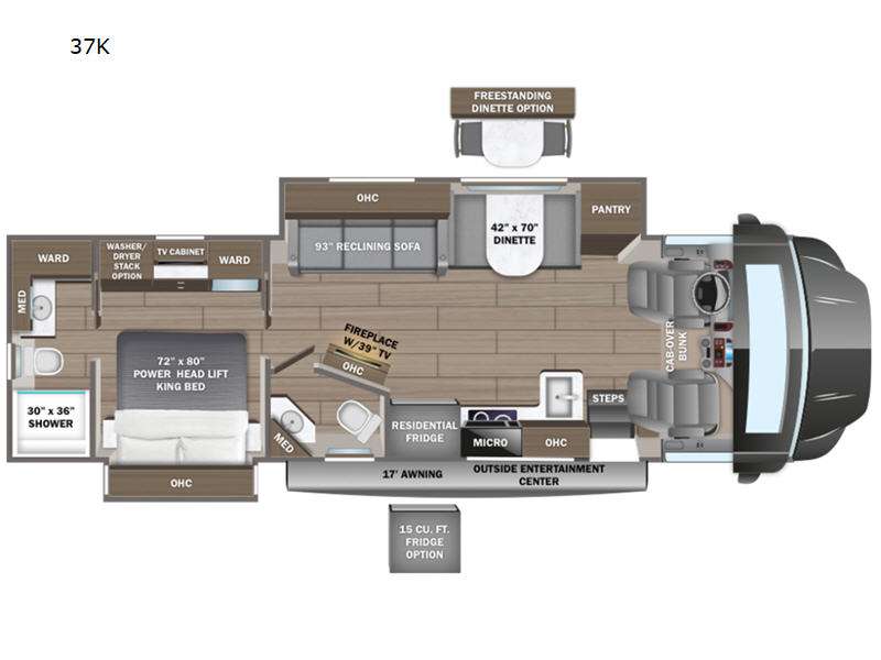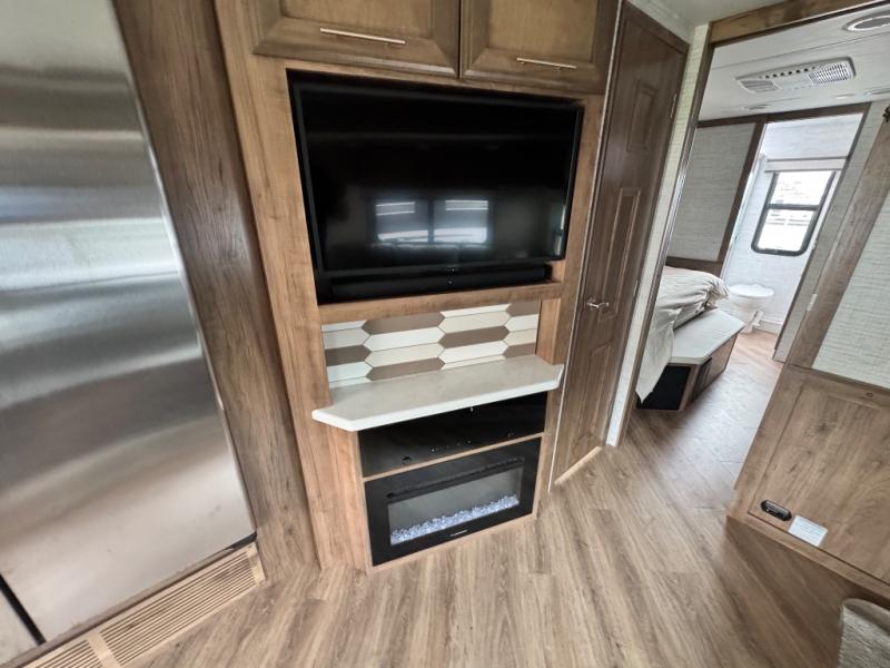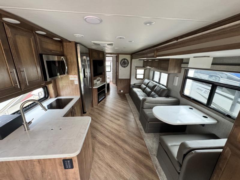 Get ready for fun adventures in this double slide out coach! Once you arrive at your destination, set up the 17' power awning with LED lights and watch the big game on the exterior LED Smart TV. You'll find plenty of seating spaces in the main living area on the 93" reclining sofa or at the booth dinette, plus there is a fireplace here and an LED HD Smart TV. The kitchen is any chef's dream with its residential refrigerator, two burner induction cooktop, and residential-size convection microwave. This model also includes a bath and a half that will come in handy when traveling with friends and family, and don't overlook the master bedroom with a power head lift king bed slide, large wardrobes, and an LED Smart TV!