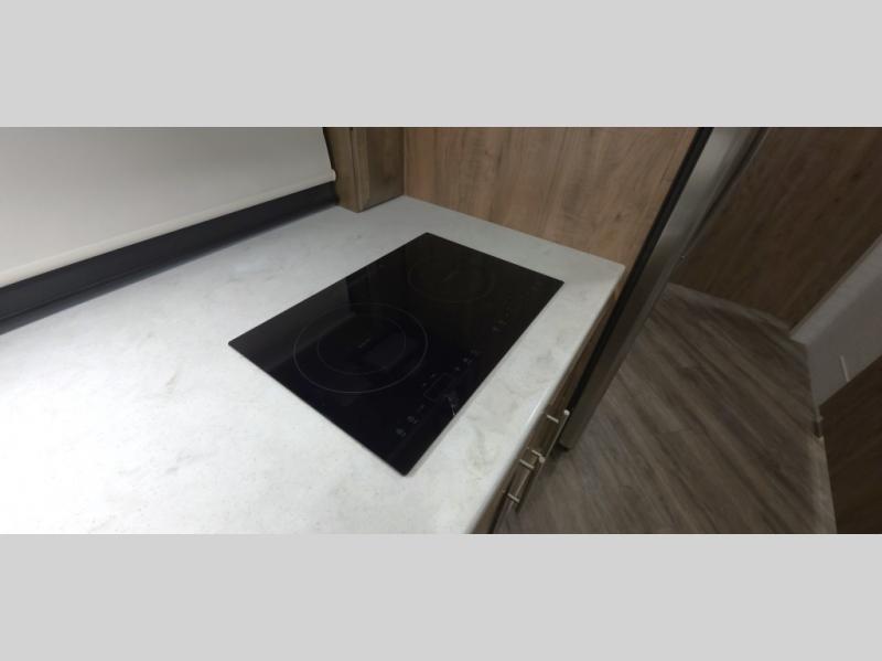 Fully equipped kitchen with convection microwave, induction cooktop, and residential refrigerator