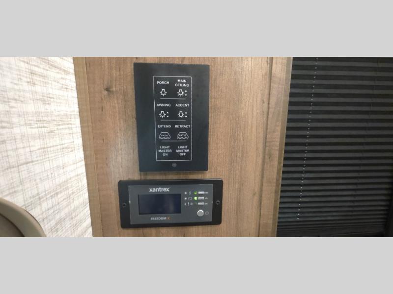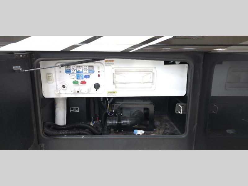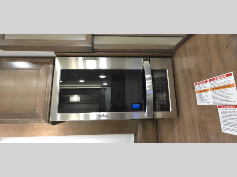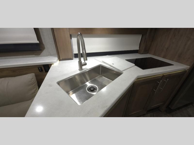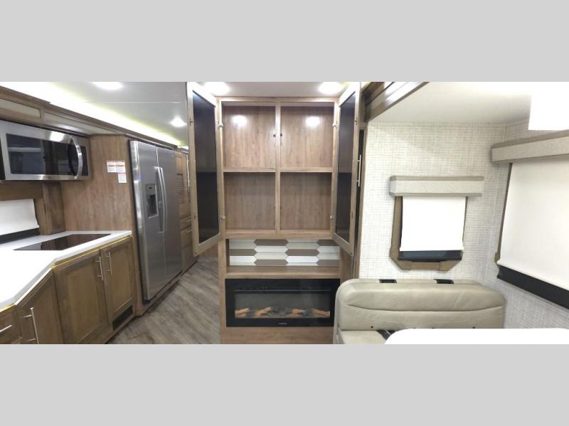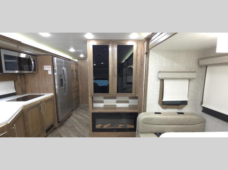 Premium finishes such as vinyl plank flooring, solid-surface countertops with LED lighting, and an electric fireplace elevate the interior, while conveniences like a water filtration system, in-motion satellite dish, and automatic hydraulic leveling jacks make every trip easier and more enjoyable.