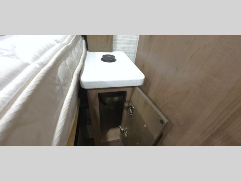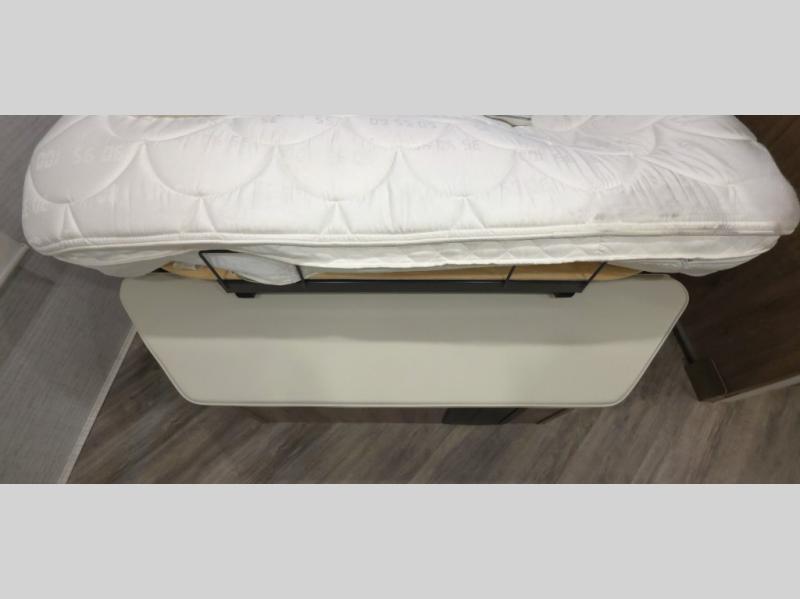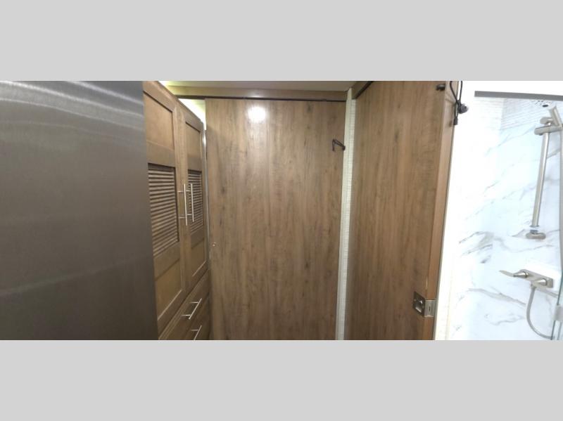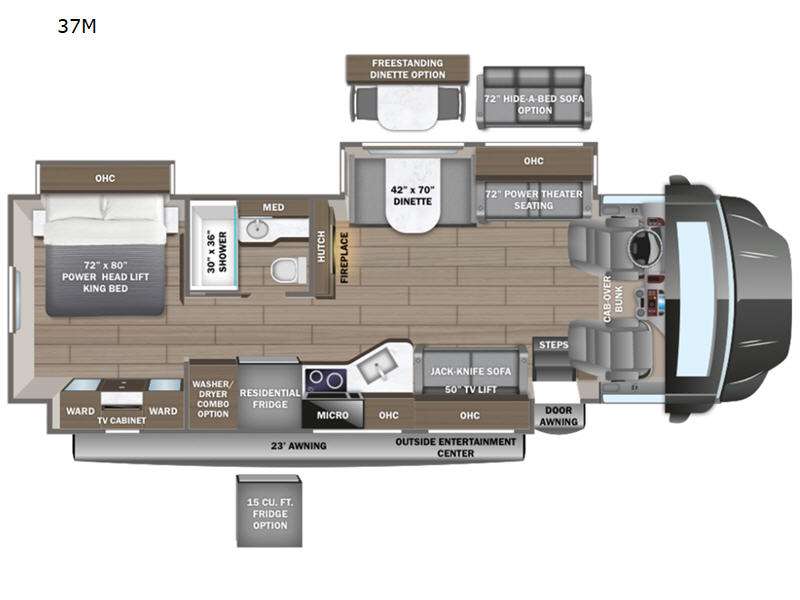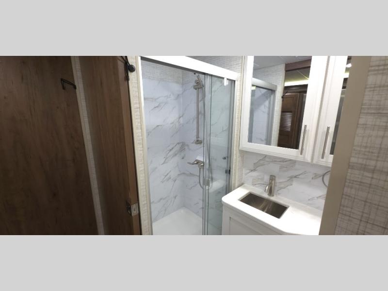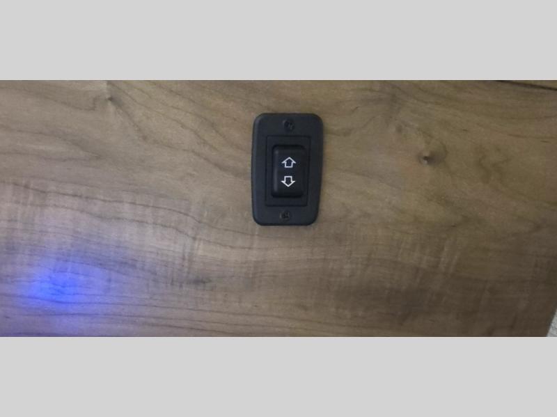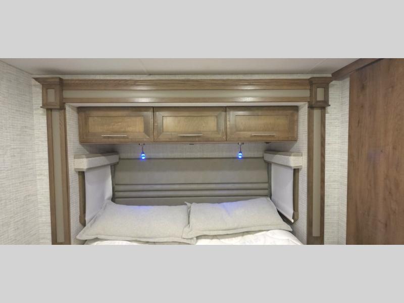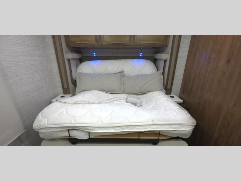 In the rear bedroom, the power head lift king bed allows you to sit up comfortably to read or watch TV, while the private setting ensures restful nights wherever your travels take you. The cab-over bunk adds flexibility for guests or extra storage, making this coach adaptable to your lifestyle.