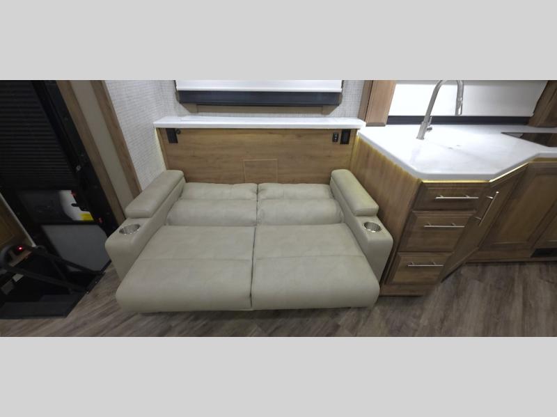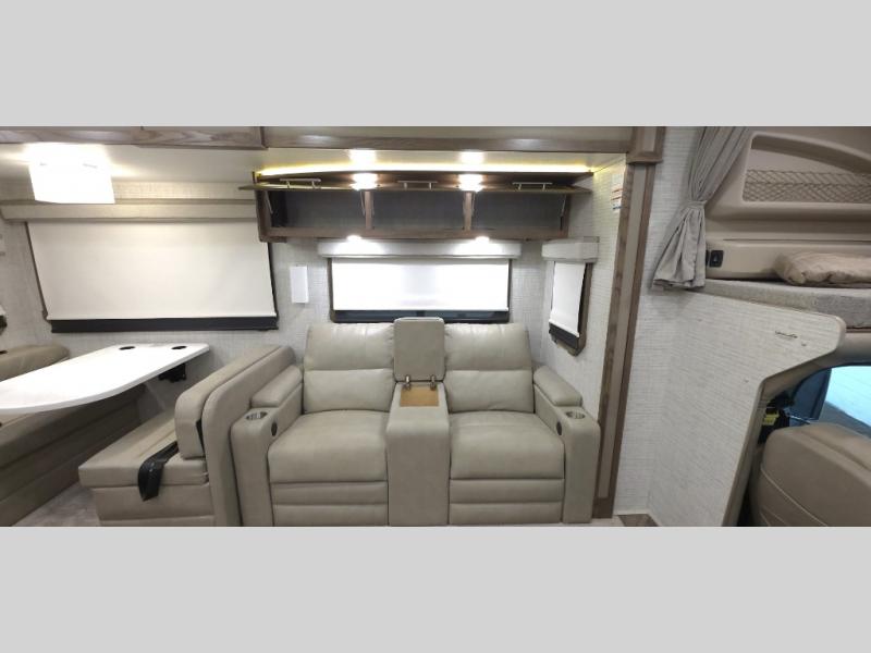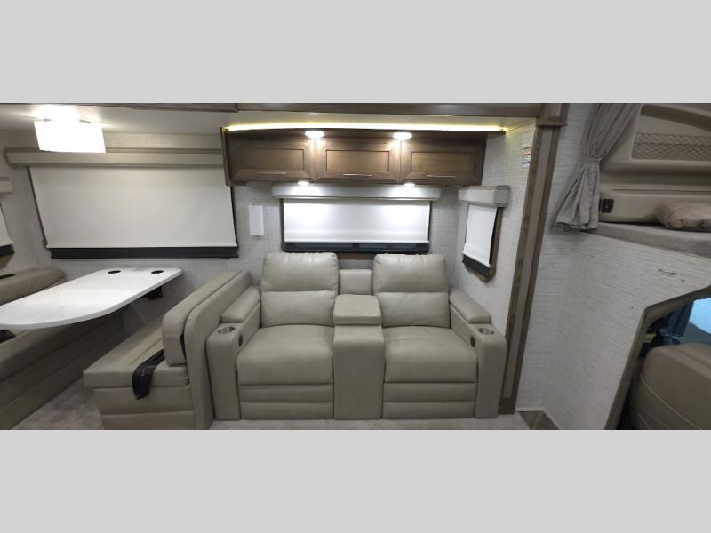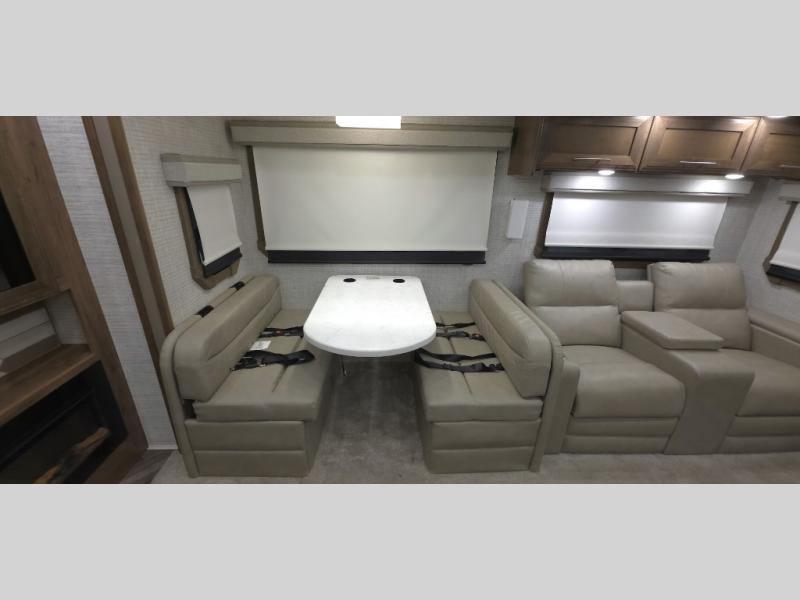 Comfortable living area with power theater seating, sofa, and booth dinette