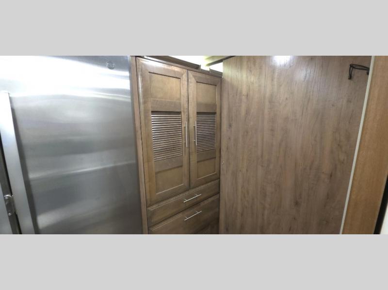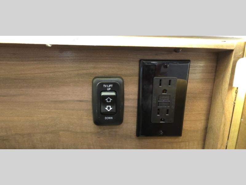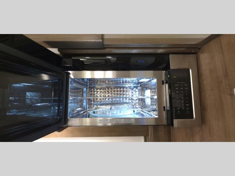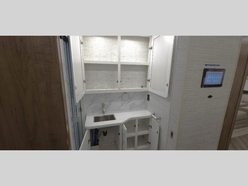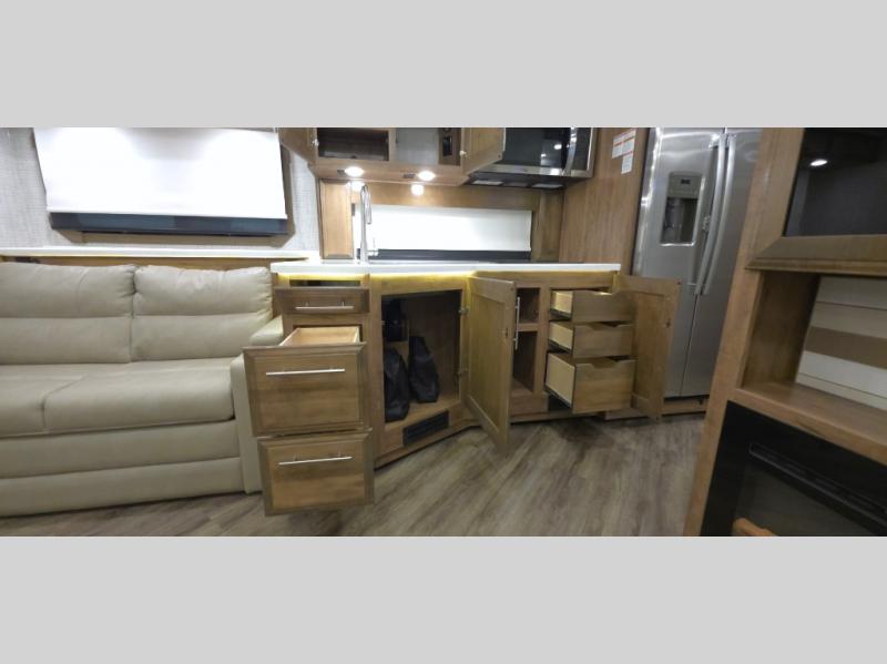 The interior layout is designed for both relaxation and functionality. The full-wall slide opens up the living space, creating a comfortable environment to entertain or unwind. Enjoy movie nights in the living area with the TV lift and fireplace or head outside to take advantage of the exterior entertainment setup. The kitchen is ideal for travelers who enjoy cooking on the road, offering modern appliances and generous storage, including a hutch for added convenience.
