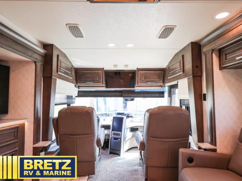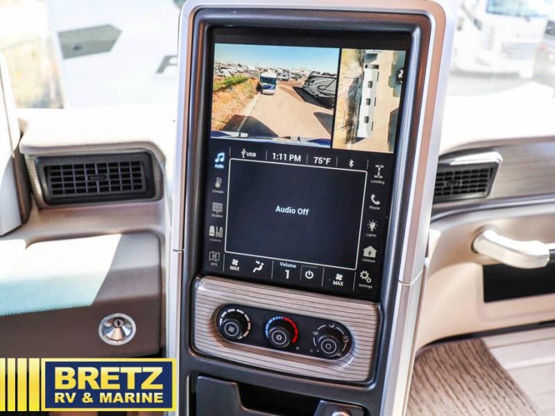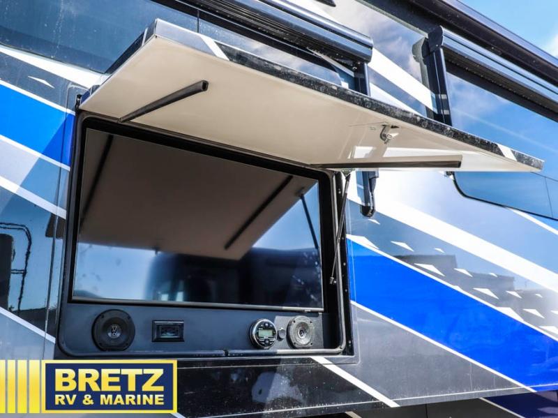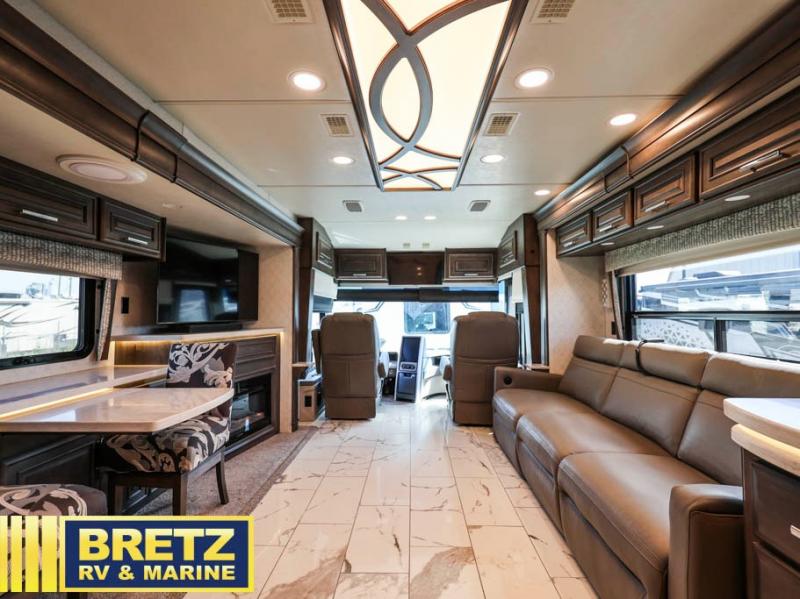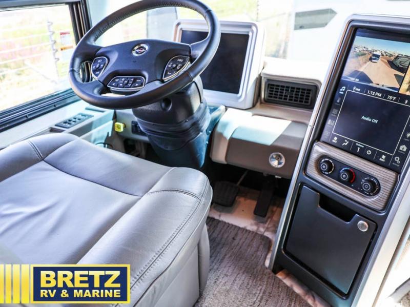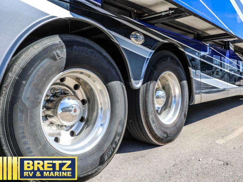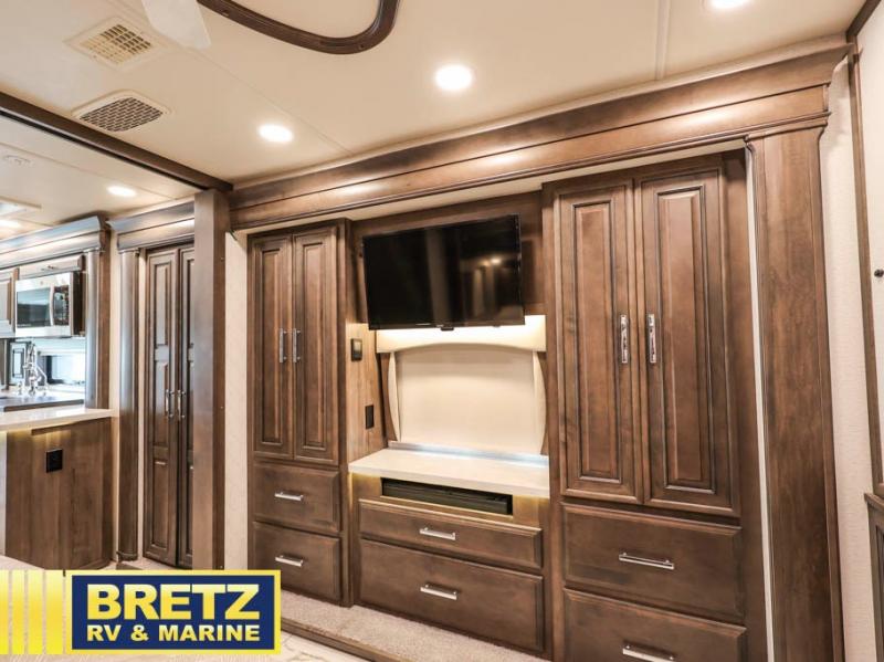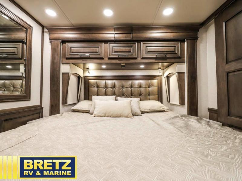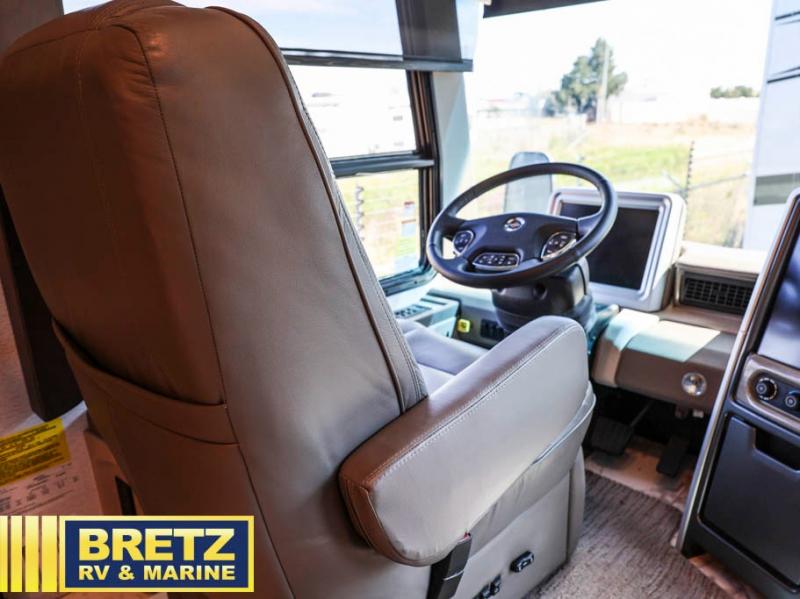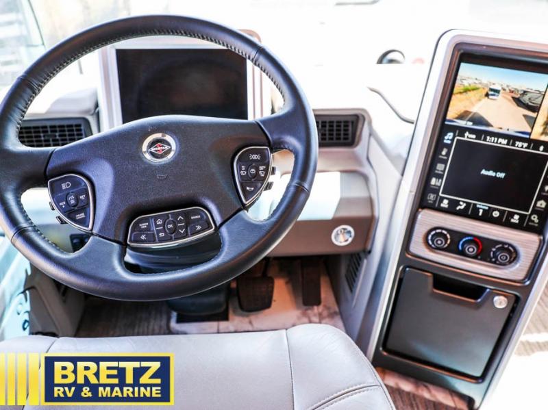 With any Anthem Class A diesel motorhome by Entegra Coach, setting up camp has never been easier with the 15-inch digital dash displaying an integrated 360-degree surround view system with fourteen smart radar sensors and six HD cameras plus the Valid air leveling system. Each roof is constructed with arched aluminum trusses filled with batt insulation and reflective Flexfoil topped with plywood decking then one-piece fiberglass, exterior walls with Aluma-Tru welded tubular aluminum studs, insulated front and rear caps, and X-Bridge bracing welded into the chassis frame. The interior provides the Firefly multiplex system with 10-inch VegaTouch touchscreen for complete integration of the coach controls with remote monitoring and control from the available mobile app, a decorative ceiling feature with integrated accent lighting, powered solar day and blackout night shades, a central vacuum system, and Aire-Secure travel locks for all pocket doors to mention a few luxury, stylish and convenient features. So why not experience the best trip each and every time, choose an Anthem today!