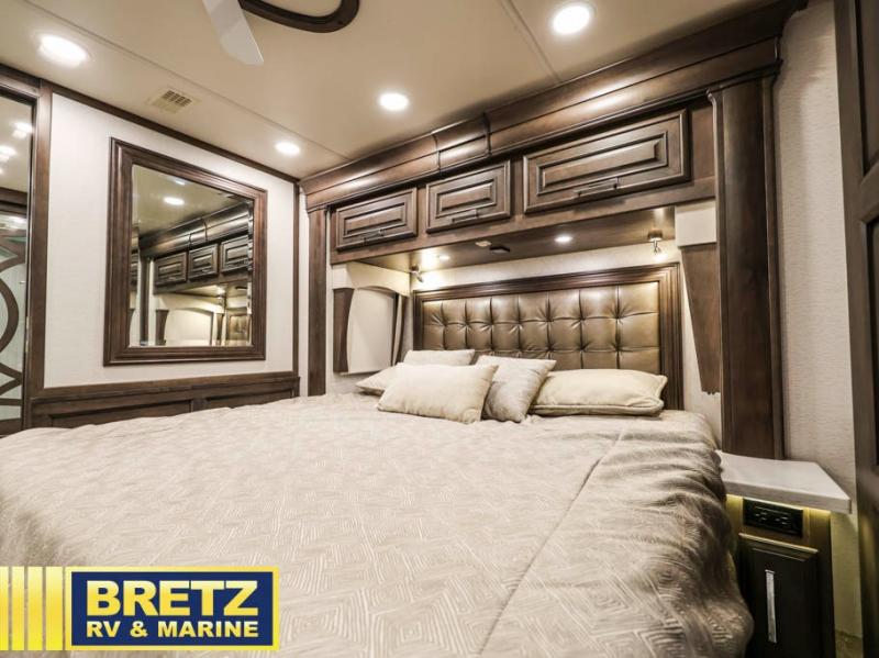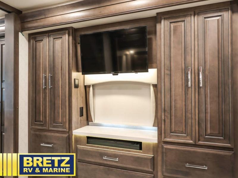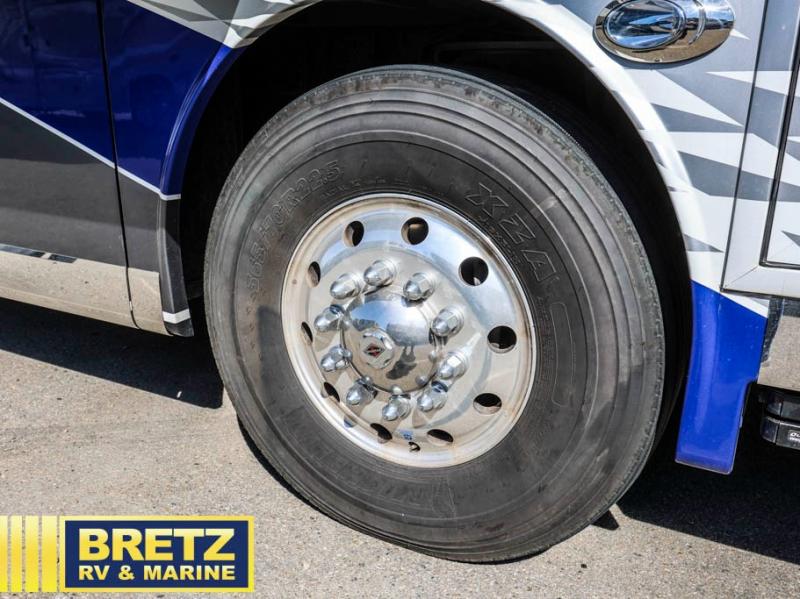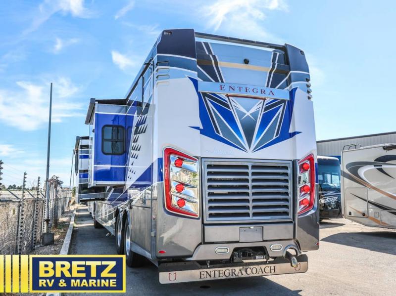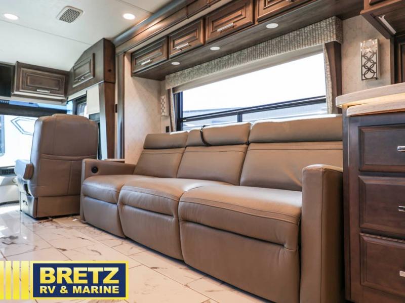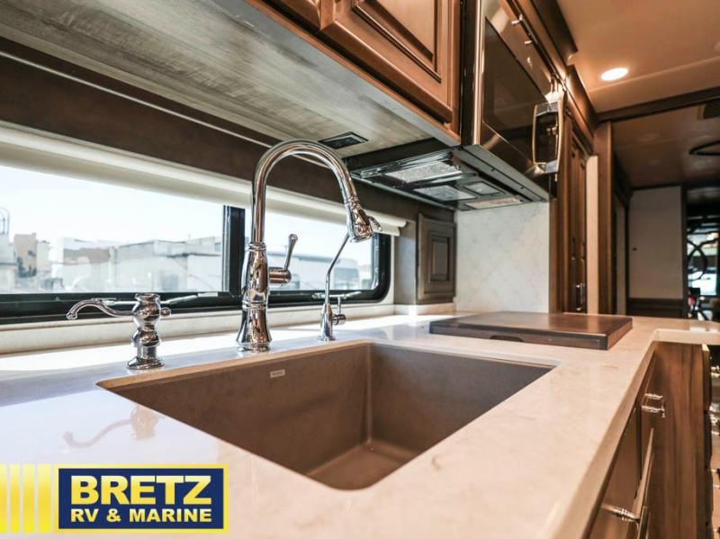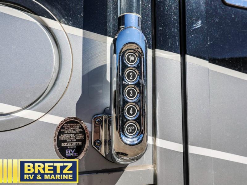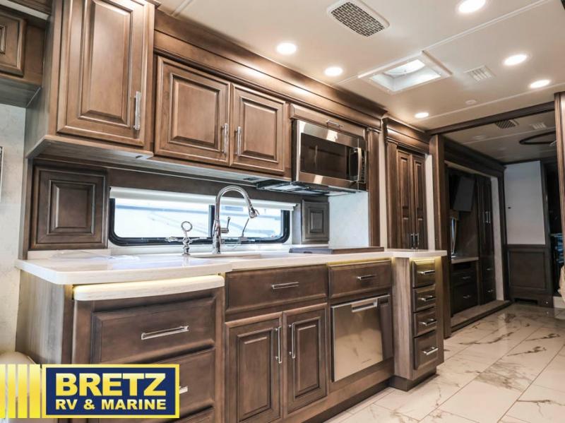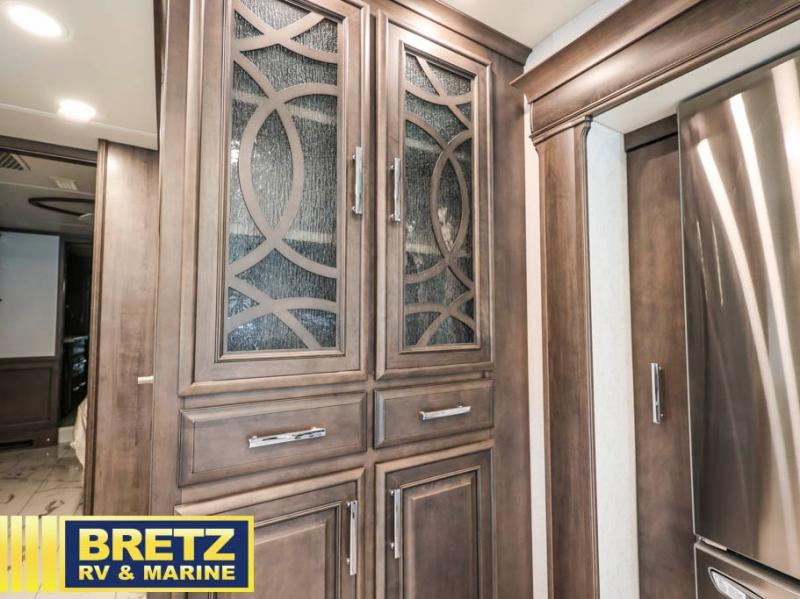 With any Anthem Class A diesel motorhome by Entegra Coach, setting up camp has never been easier with the 15-inch digital dash displaying an integrated 360-degree surround view system with fourteen smart radar sensors and six HD cameras plus the Valid air leveling system. Each roof is constructed with arched aluminum trusses filled with batt insulation and reflective Flexfoil topped with plywood decking then one-piece fiberglass, exterior walls with Aluma-Tru welded tubular aluminum studs, insulated front and rear caps, and X-Bridge bracing welded into the chassis frame. The interior provides the Firefly multiplex system with 10-inch VegaTouch touchscreen for complete integration of the coach controls with remote monitoring and control from the available mobile app, a decorative ceiling feature with integrated accent lighting, powered solar day and blackout night shades, a central vacuum system, and Aire-Secure travel locks for all pocket doors to mention a few luxury, stylish and convenient features. So why not experience the best trip each and every time, choose an Anthem today!