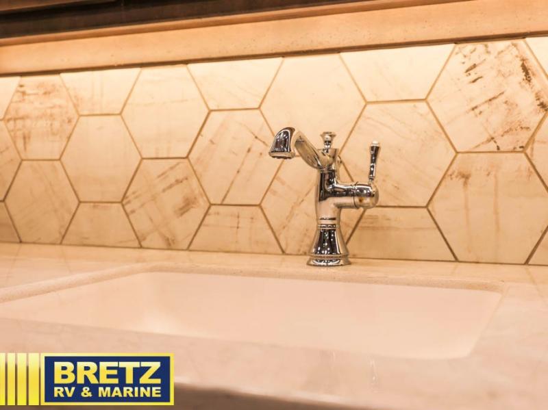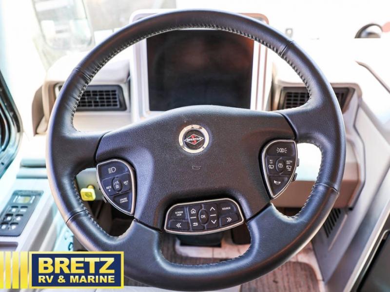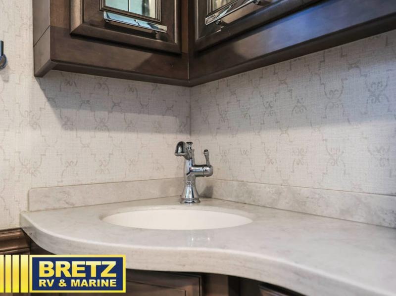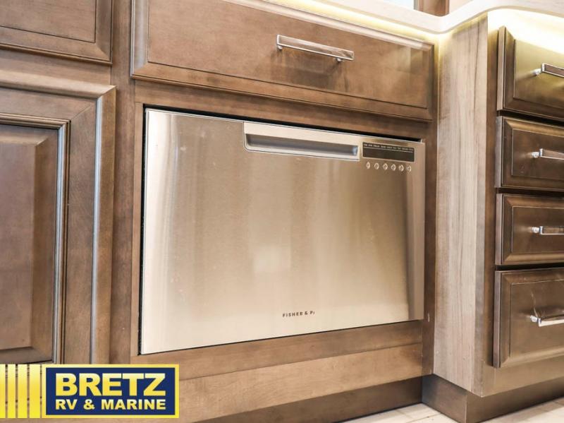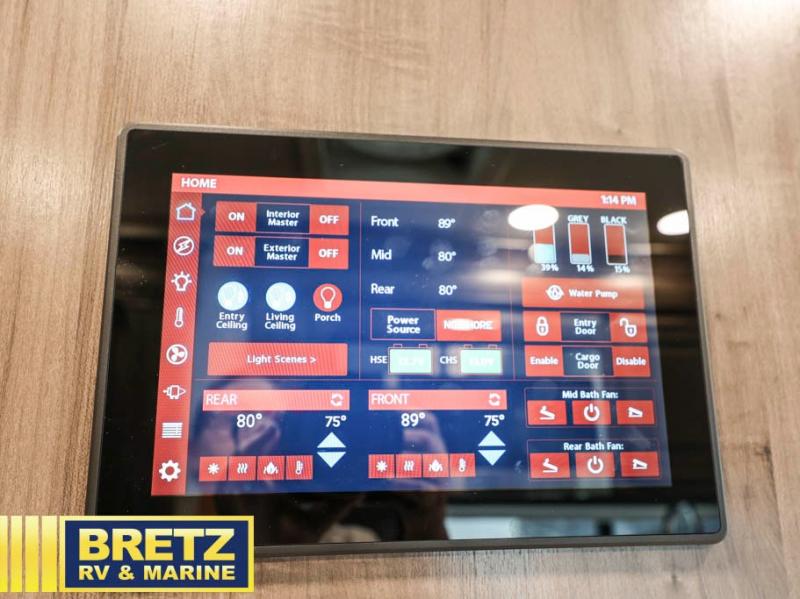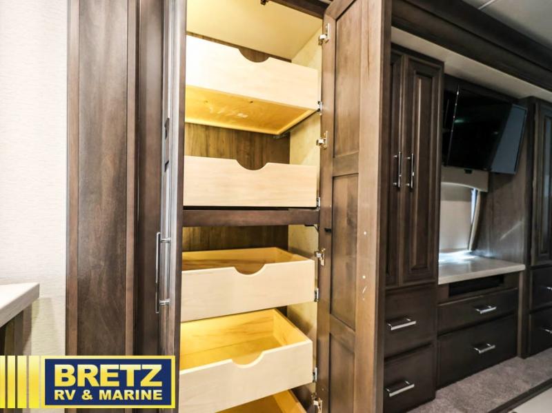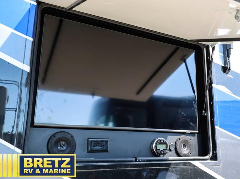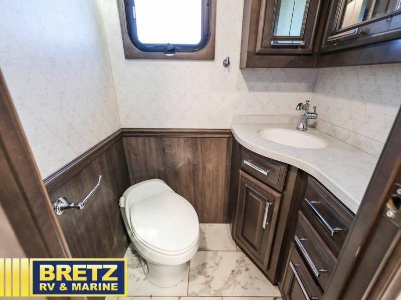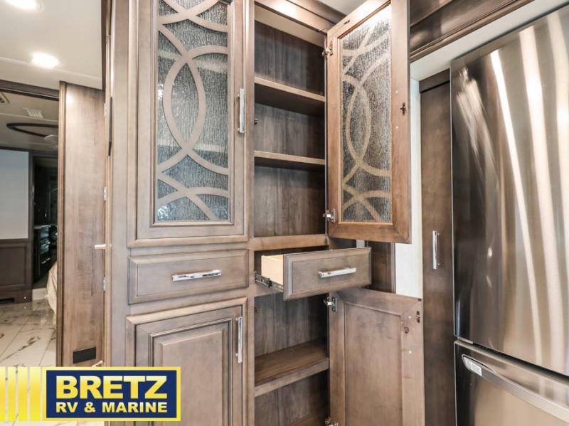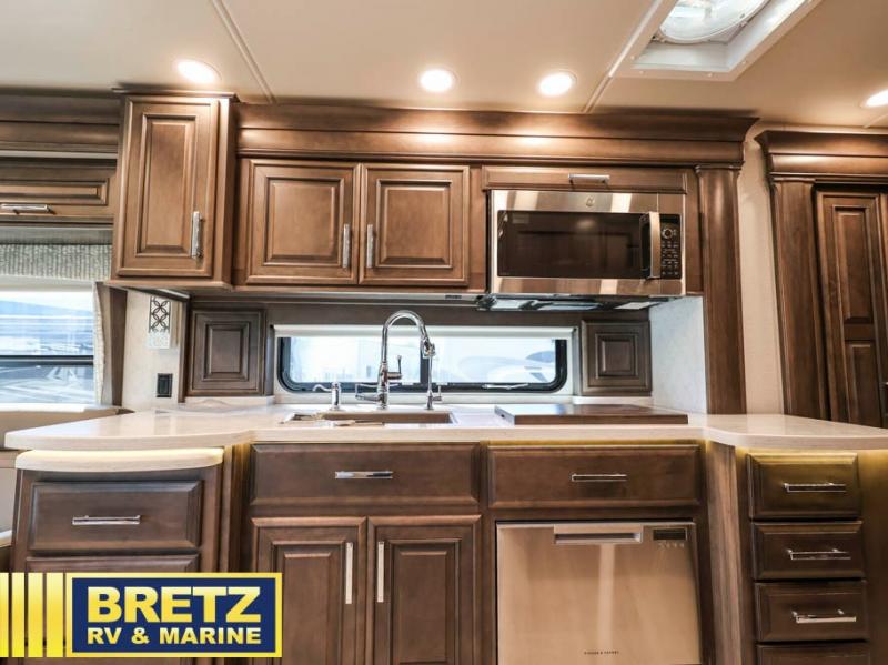 With any Anthem Class A diesel motorhome by Entegra Coach, setting up camp has never been easier with the 15-inch digital dash displaying an integrated 360-degree surround view system with fourteen smart radar sensors and six HD cameras plus the Valid air leveling system. Each roof is constructed with arched aluminum trusses filled with batt insulation and reflective Flexfoil topped with plywood decking then one-piece fiberglass, exterior walls with Aluma-Tru welded tubular aluminum studs, insulated front and rear caps, and X-Bridge bracing welded into the chassis frame. The interior provides the Firefly multiplex system with 10-inch VegaTouch touchscreen for complete integration of the coach controls with remote monitoring and control from the available mobile app, a decorative ceiling feature with integrated accent lighting, powered solar day and blackout night shades, a central vacuum system, and Aire-Secure travel locks for all pocket doors to mention a few luxury, stylish and convenient features. So why not experience the best trip each and every time, choose an Anthem today!