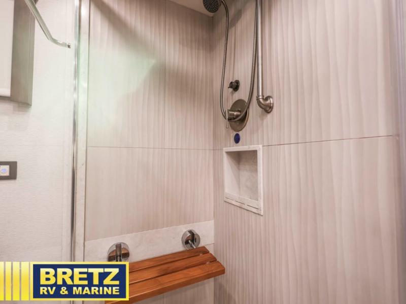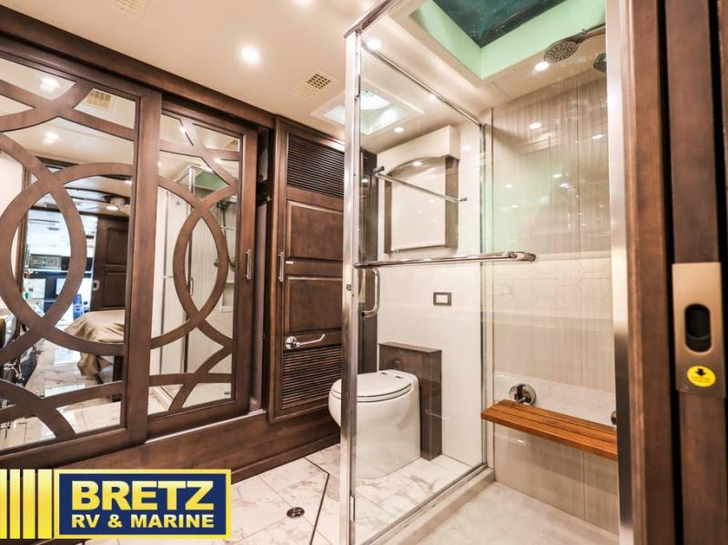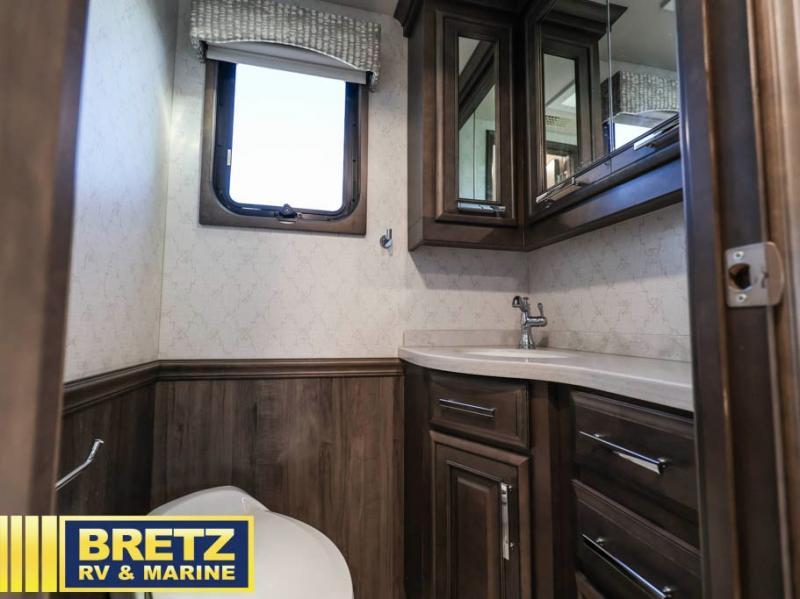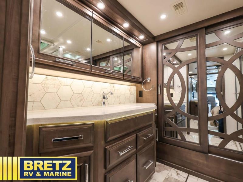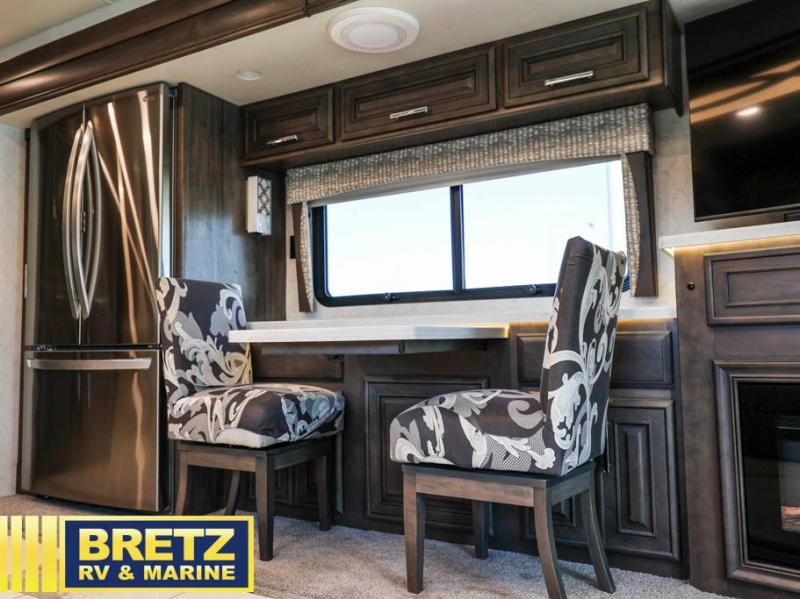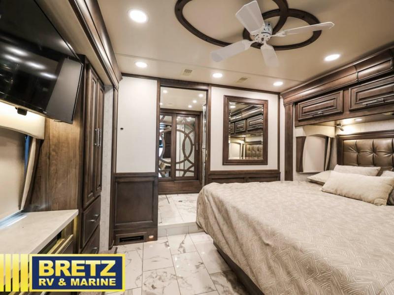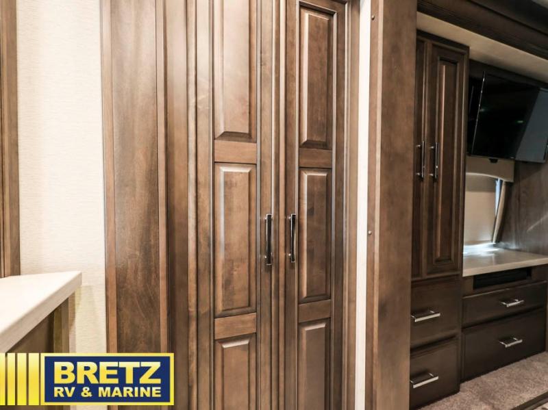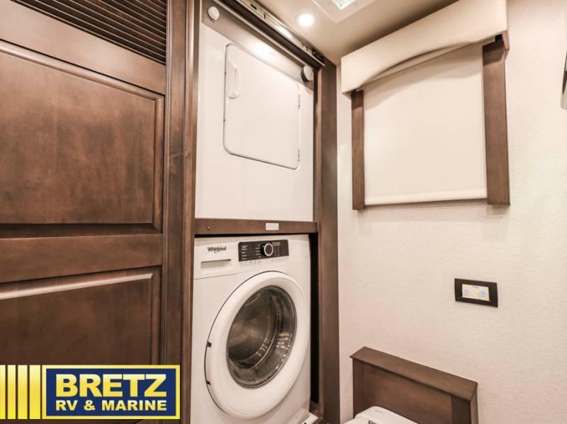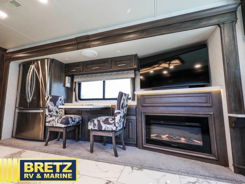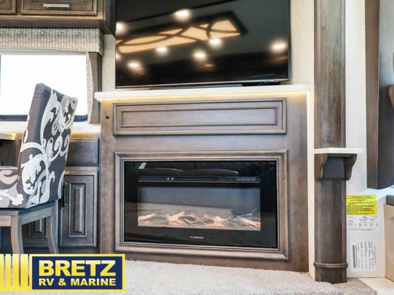 Whether you travel for work, to see family or explore the country side, this coach offers the power you want and the luxury you desire! Not only is the drive comfortable but the inside furniture and bedding. Once at your destination, easily set up and relax on the three-seat power reclining sofa or choose the hide-a-bed sofa option, or eat a snack at the table. The 50" Smart TV and fireplace add coziness, the broom closet offers tidiness, and the kitchen allows you to cook like at home. There is a 32" Smart TV over the cab to watch as well, and a mid-coach half bath for convenience. The master suite offers a slide out king bed, sliding doors for privacy, wardrobes, and a 32" Smart TV to watch before bedtime. And the rear full bathroom offers a shower, and a large wardrobe, plus a washer and dryer.