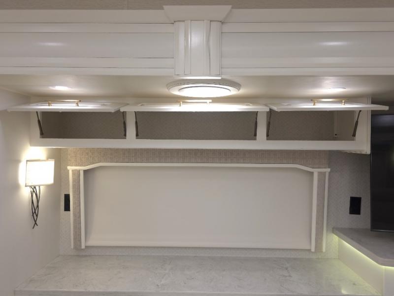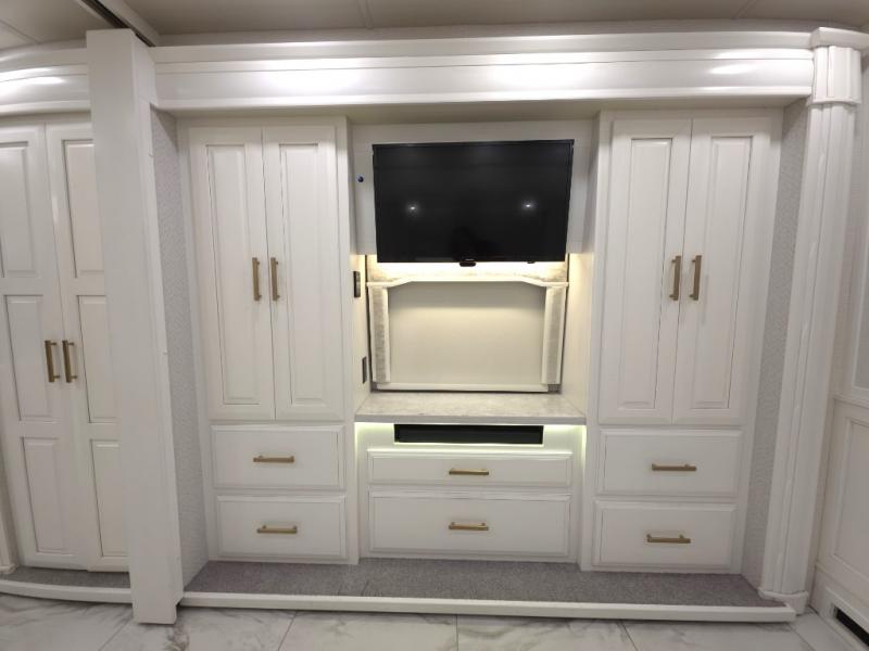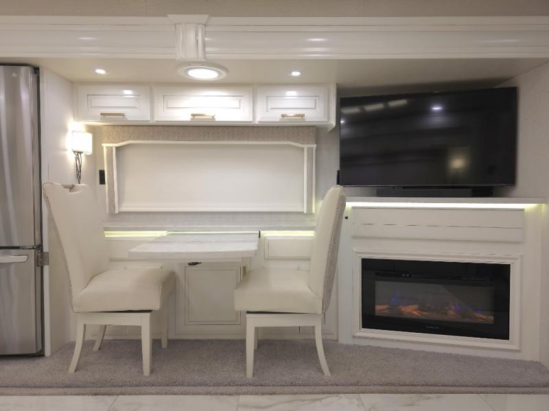 The living area fireplace brings warmth and ambiance, making this coach feel truly like home.