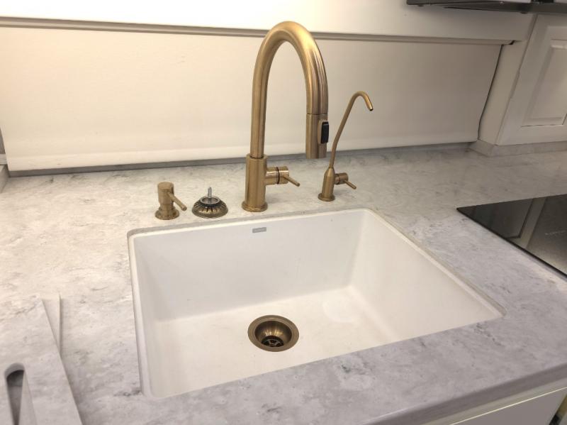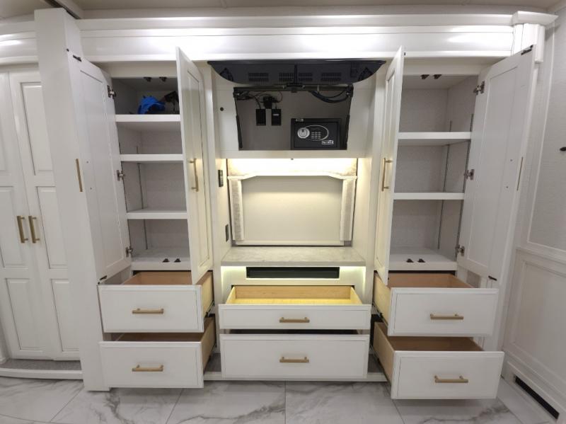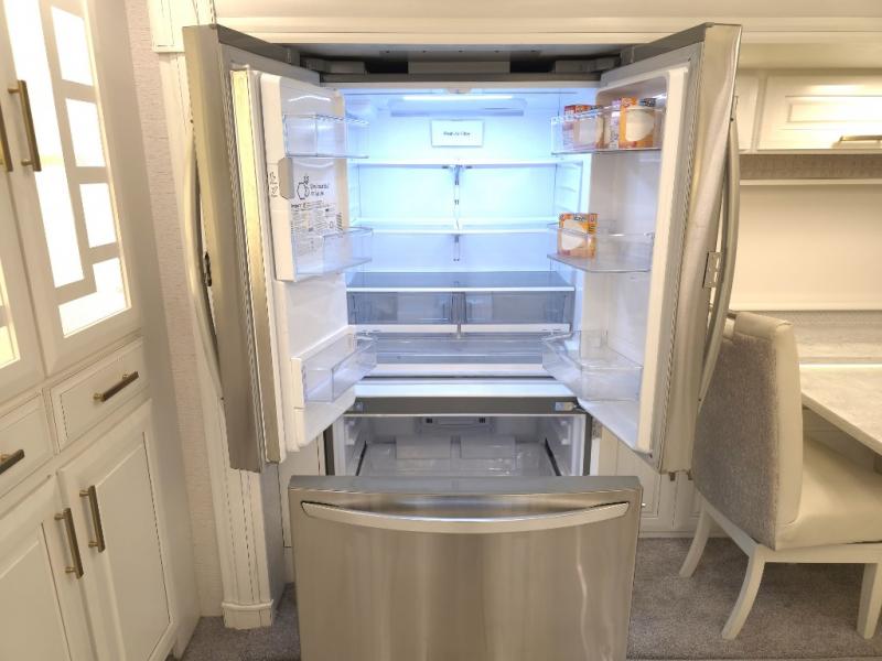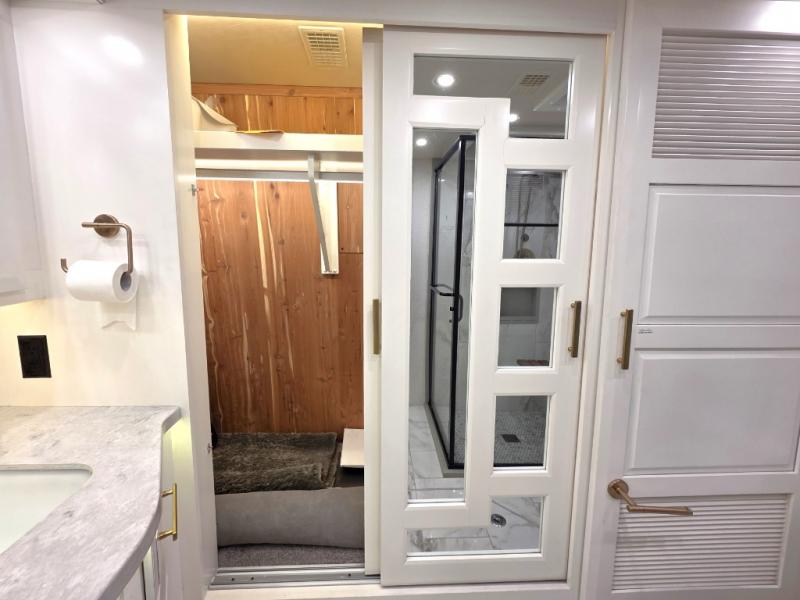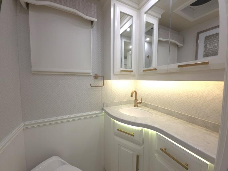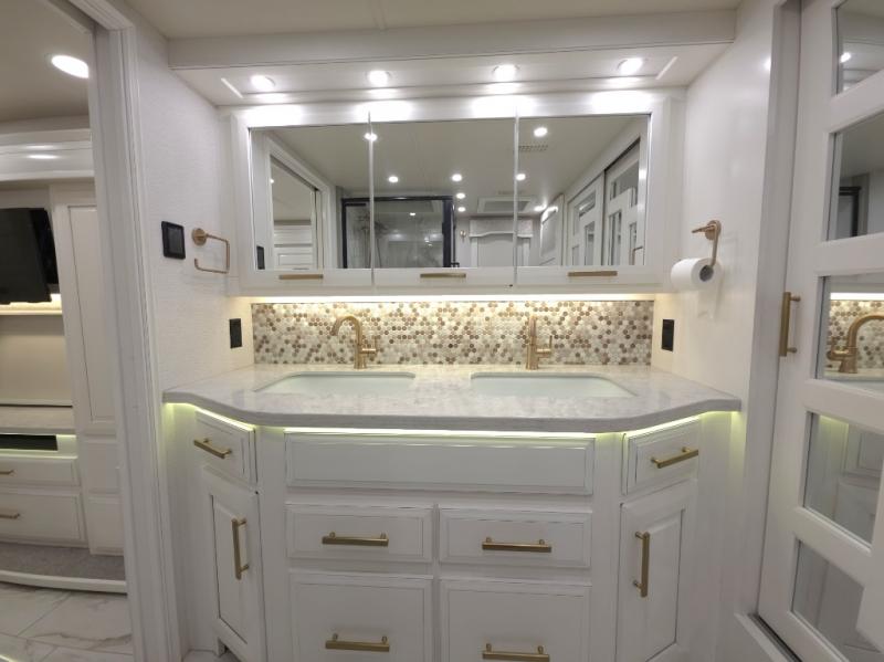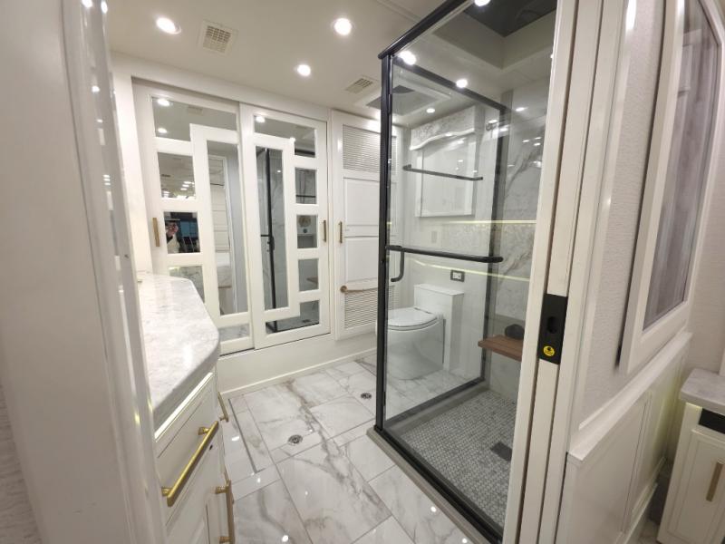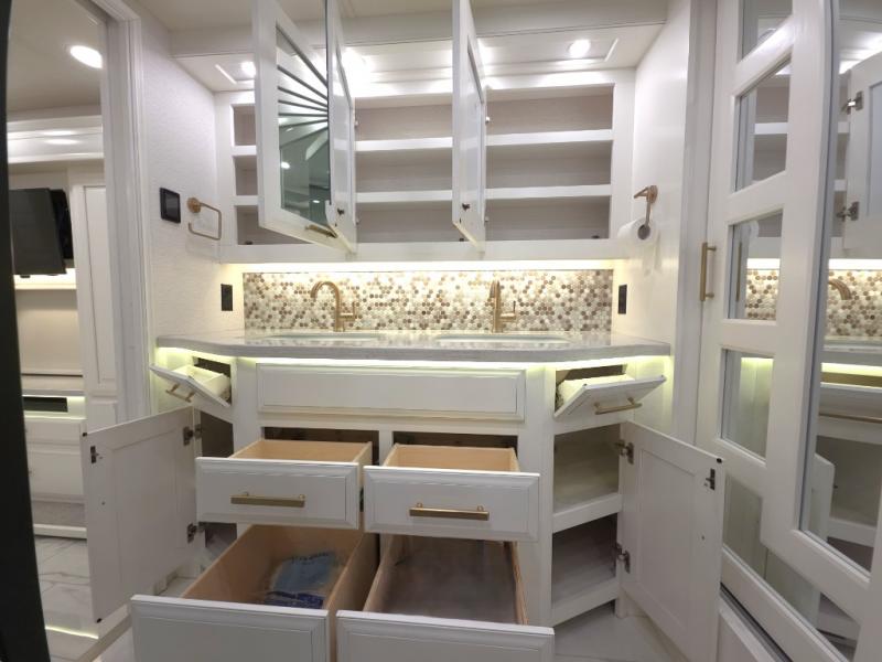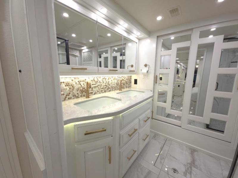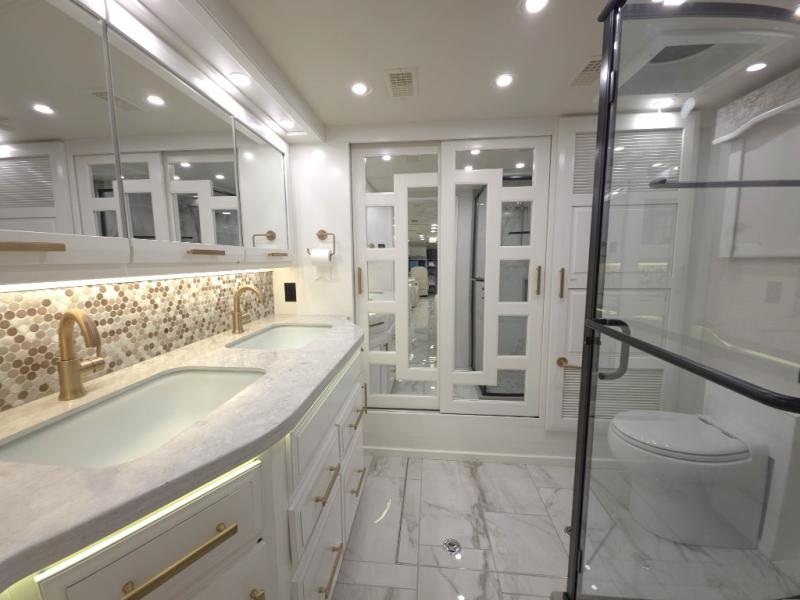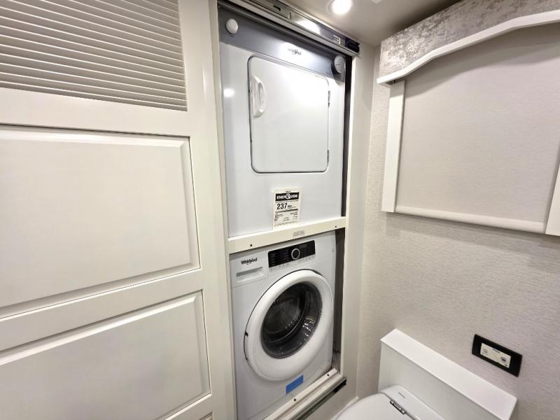 Traveling with friends or family is easier with a bath and a half. The full rear bath includes dual vanities, a wardrobe, and a separate washer and dryer for ultimate convenience.