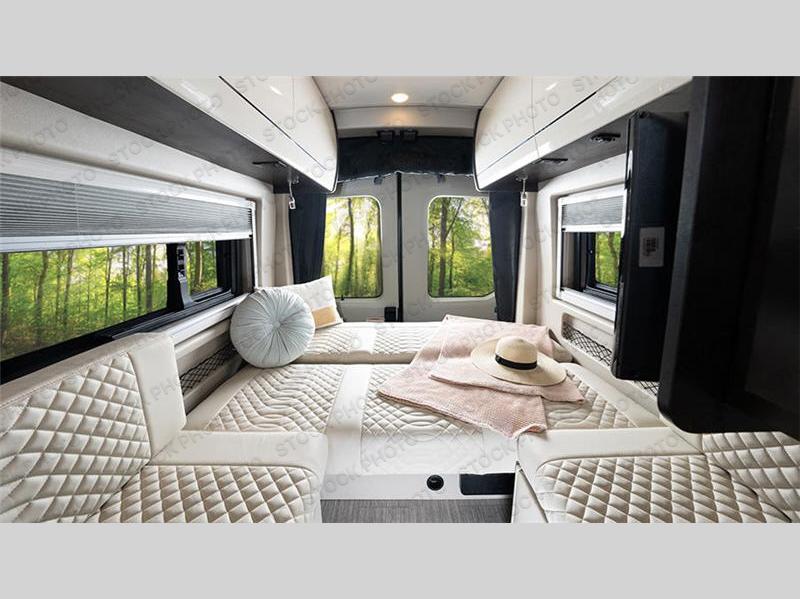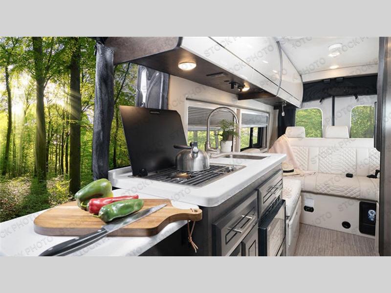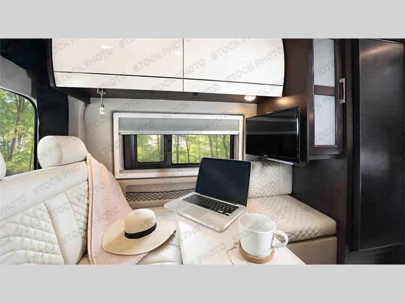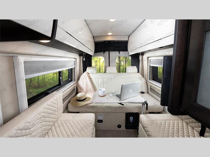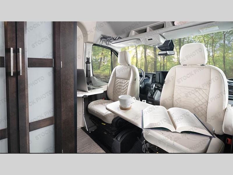 The Expanse brings you luxury, comfort, and safety all in an easy-to-drive Class B size. The rear 68" wide power sofa has plenty of space to stretch out, and two additional jump seats and a table mount make it comfortable enough for a few people to eat dinner or watch the 24" LED HD TV. You could also enjoy meals up front, where the driver and passenger seats can be swiveled around to access the table there. Conveniently, the kitchen is in the middle so no matter where you decide to eat, the table is only a few steps away! The wet bath is also centrally located, with a 25" x 46 3/4" shower, foot flush toilet, and Aqua View® SHOWERMI$ER™ water management system. Thoughtful design includes styling elements like the Tecnoform® European-style high-gloss cabinetry, residential vinyl flooring, and a removable privacy shade for the sliding door window.