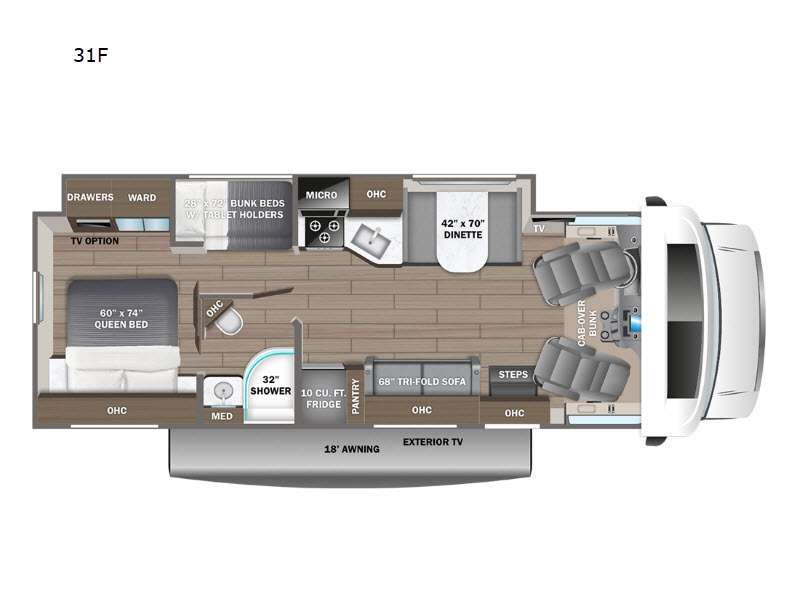 Gather your family and load up for travel games, camping games and all around comfort and luxury! The full-wall slide provides extra floor space from just behind the swivel captains chairs all the way back to the private rear bedroom with a queen bed and clothing storage. The bunk beds are across from the main entry to the bathroom, and your kids or grandkids will love this space as well as the front cab-over bunk. You even have more sleeping space provided by the booth dinette and sofa once easily set up for bedtime. And the cook will have a residential-size microwave, a Furrion all-in-one cooktop and oven, plus an 8 cu. ft. refrigerator to keep everyone fed, and the pantry will hold the snacks. Everyone can also enjoy the 18' electric awning while at the campsite either day or night thanks to the LED lights, and the exterior TV will allow you to watch the big game in the great outdoors.