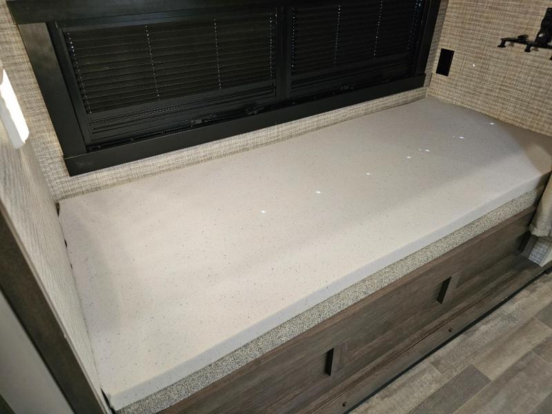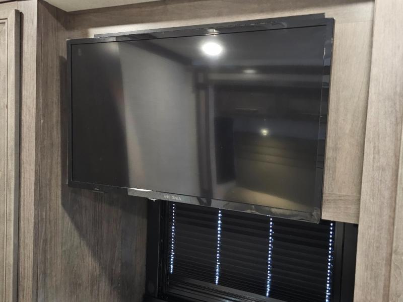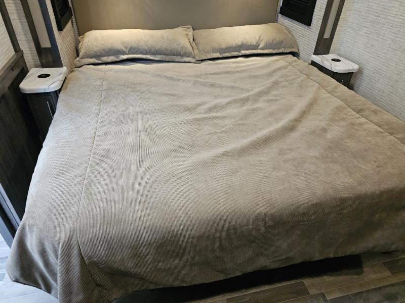 Rear master suite with king-size bed slide, LED HD Smart TV, and storage