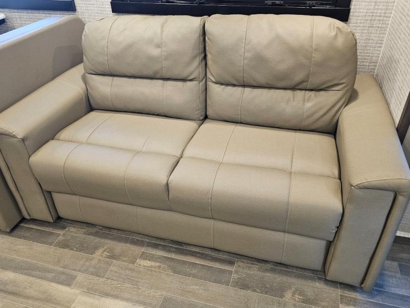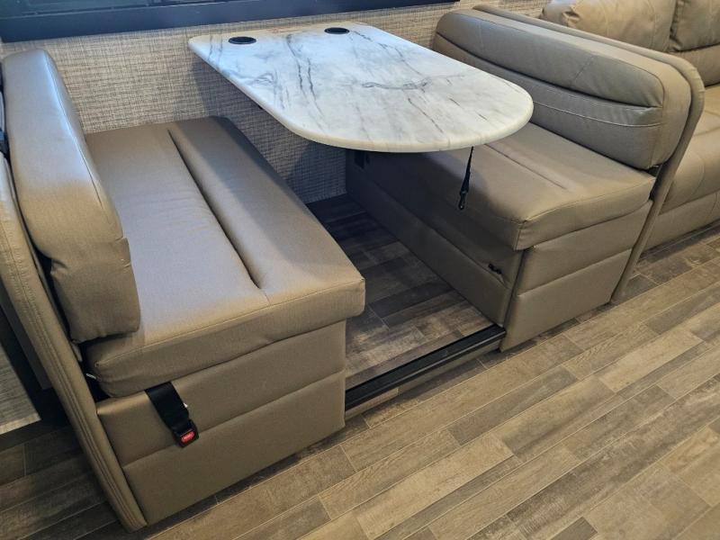 Tri-fold sofa and dinette provide seating for meals, games, or relaxation
