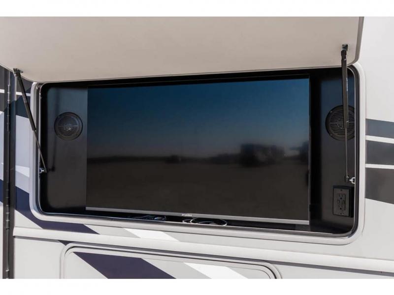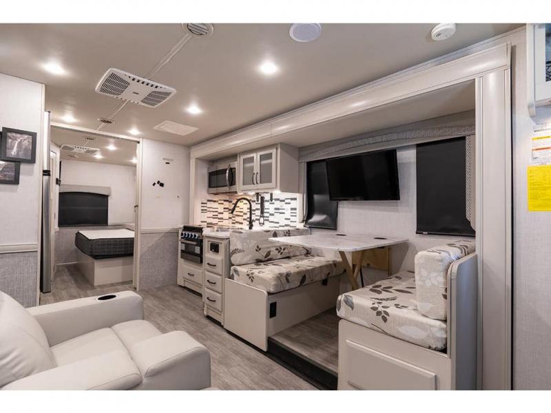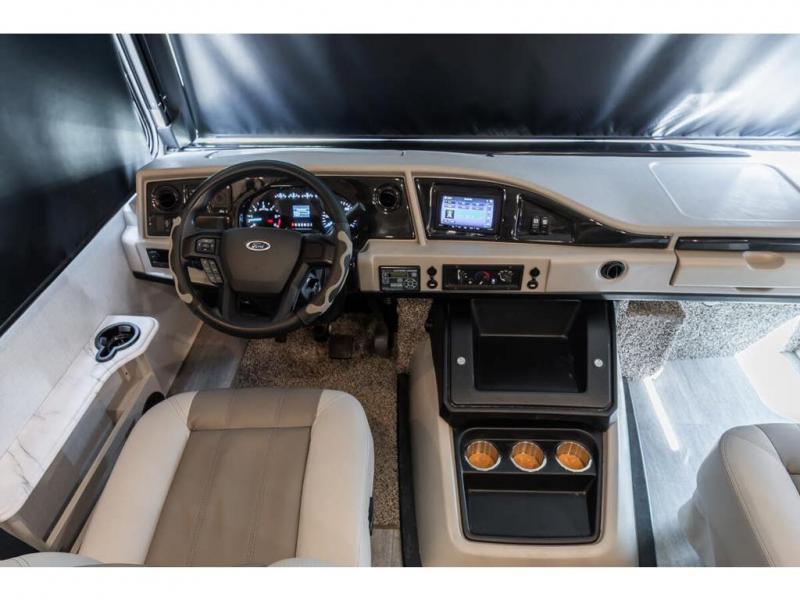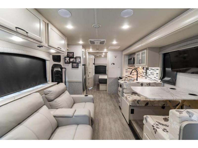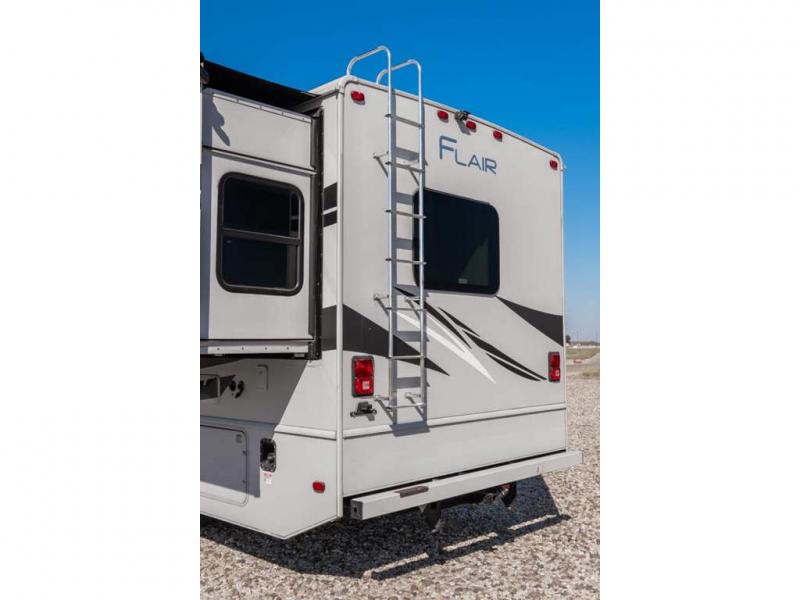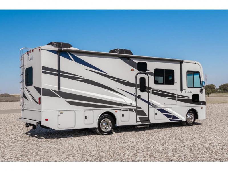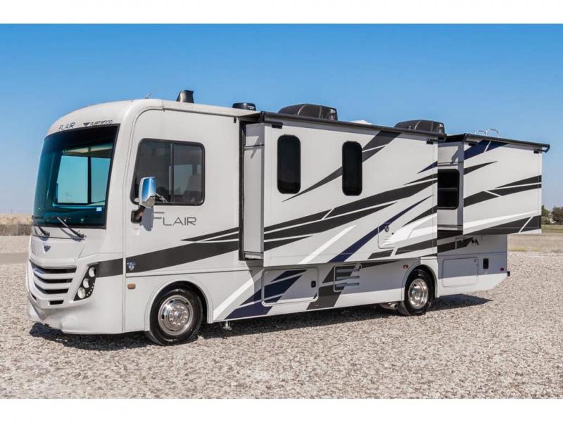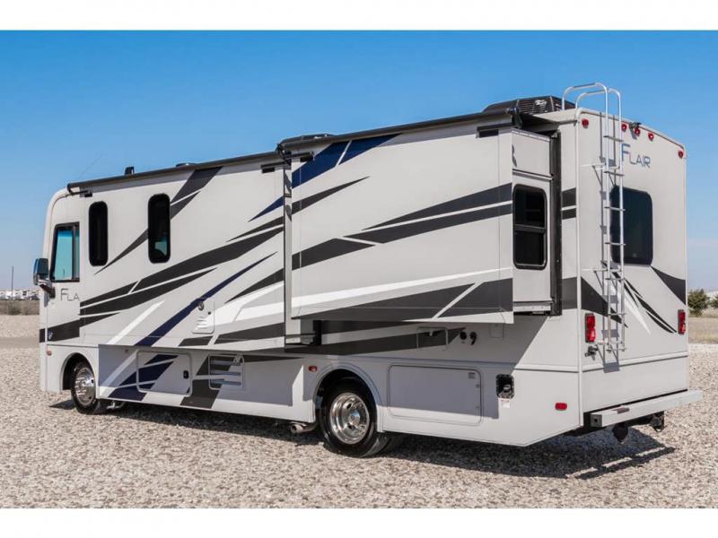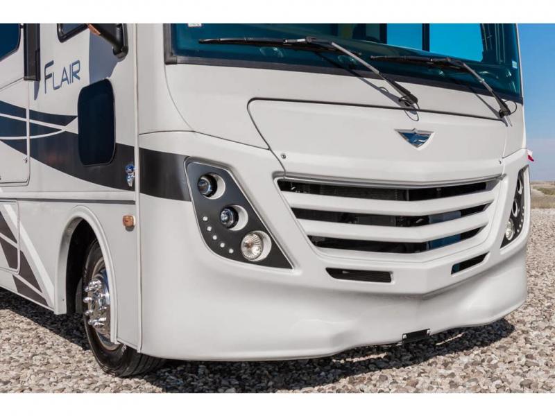 Step up your camping game by adding the Fleetwood Flair Class A gas motorhome to the line-up! The 7.3L 350HP engine with 468 LB/FT of torque forms the base, and the 8,000-LB towing capacity gives you the chance to bring a car with your coach. On the exterior you'll find an automotive, bonded one-piece windshield, exterior-mounted sideview cameras, and an exterior LED TV. The interior is decked out with a Sony dash radio, an all-new electronic instrument panel, a digital dash, and reclining/swivel cab chairs. There is also a workstation at the automotive-style dash, and the Bluetooth coach system in the bedroom has exterior speakers for fun party nights.