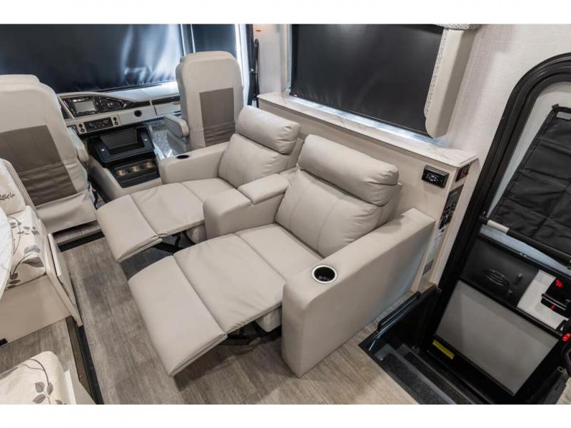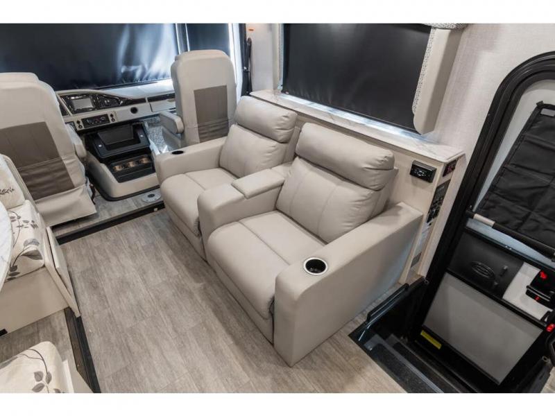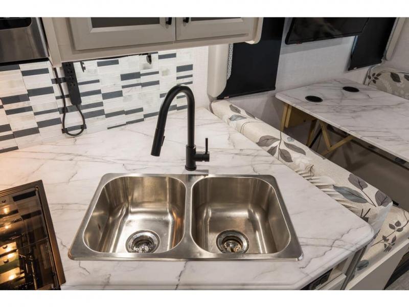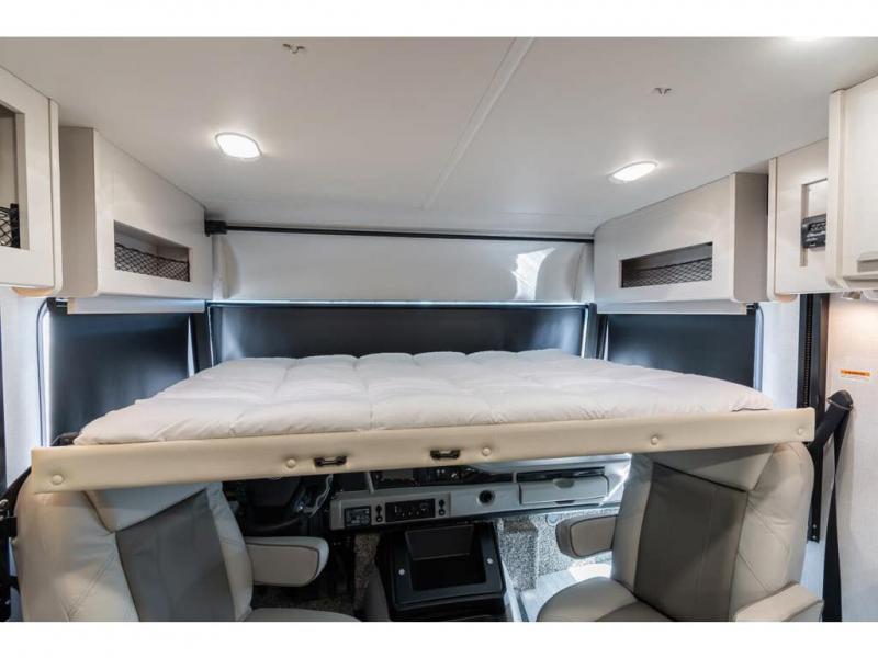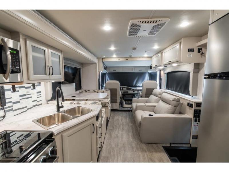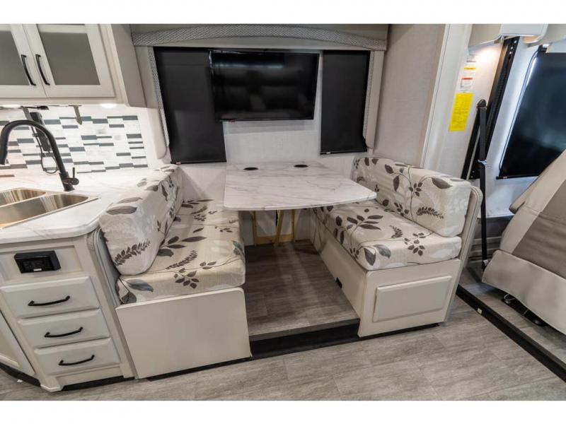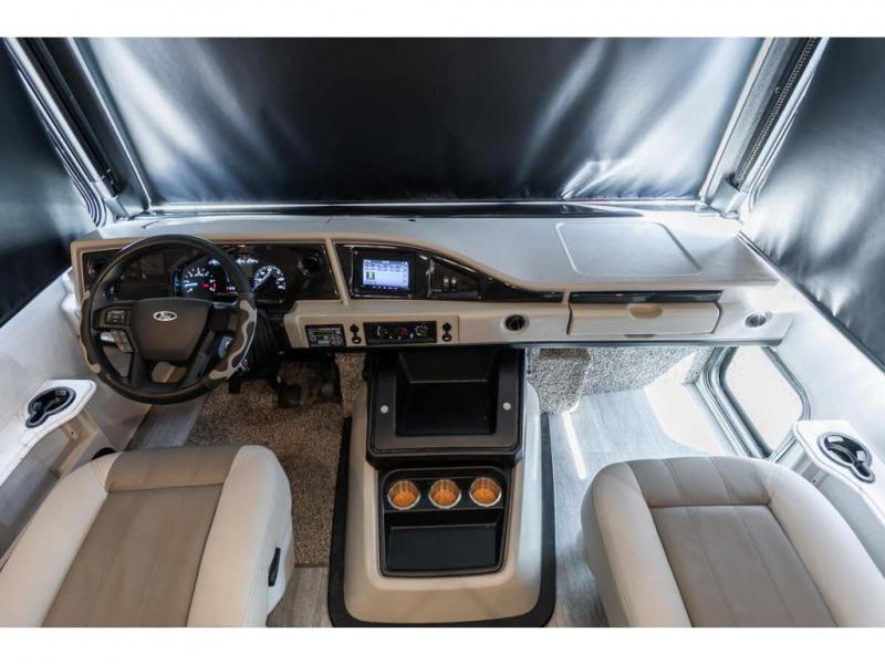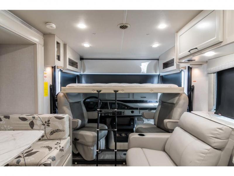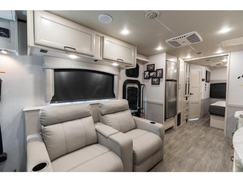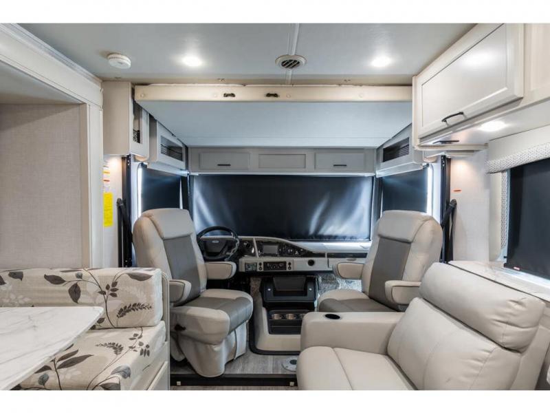 Step up your camping game by adding the Fleetwood Flair Class A gas motorhome to the line-up! The 7.3L 350HP engine with 468 LB/FT of torque forms the base, and the 8,000-LB towing capacity gives you the chance to bring a car with your coach. On the exterior you'll find an automotive, bonded one-piece windshield, exterior-mounted sideview cameras, and an exterior LED TV. The interior is decked out with a Sony dash radio, an all-new electronic instrument panel, a digital dash, and reclining/swivel cab chairs. There is also a workstation at the automotive-style dash, and the Bluetooth coach system in the bedroom has exterior speakers for fun party nights.