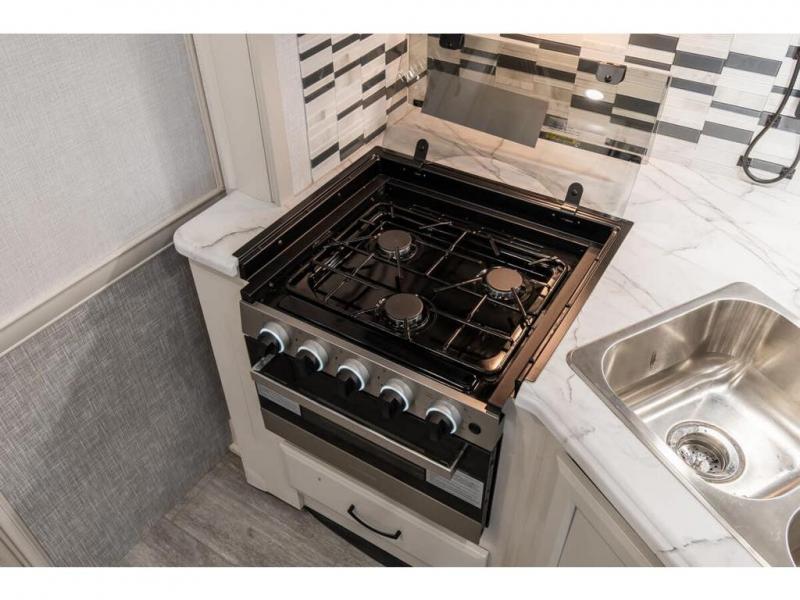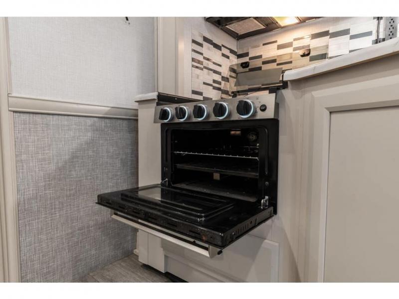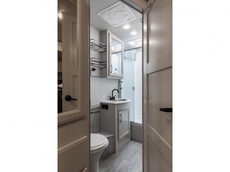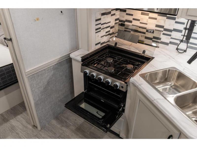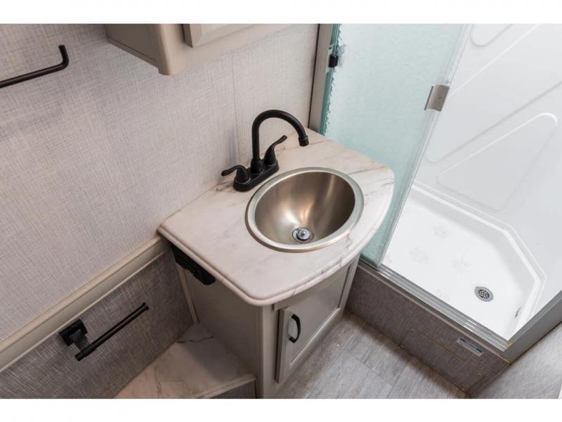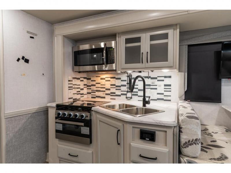 If you're hoping for a luxurious getaway, look no further than this Flair Class A gas motorhome! You can sleep in peace in your own private bedroom, and the full bathroom with shower skylight is directly connected to the bedroom for easy morning routines. Next to the residential refrigerator is a pantry, so you have great kitchen storage, and you also have a three-burner range to cook those foods on. A jackknife sofa gives you lounging and sleeping space, and you have a Wi-Fi Ranger Sky4 to keep connected to the modern world.