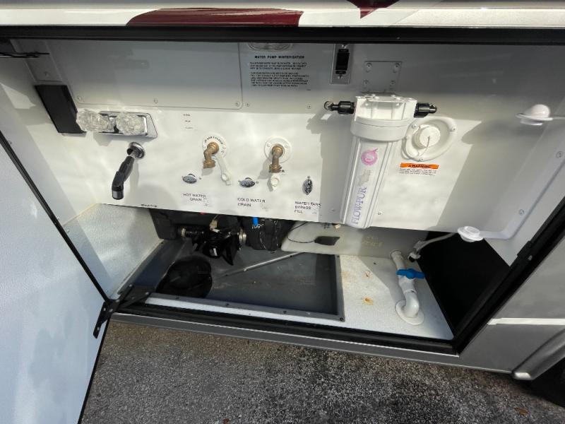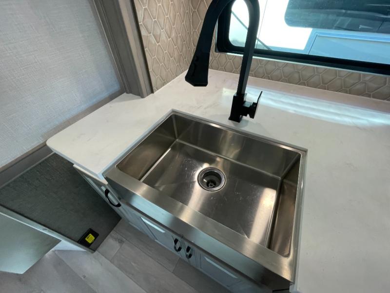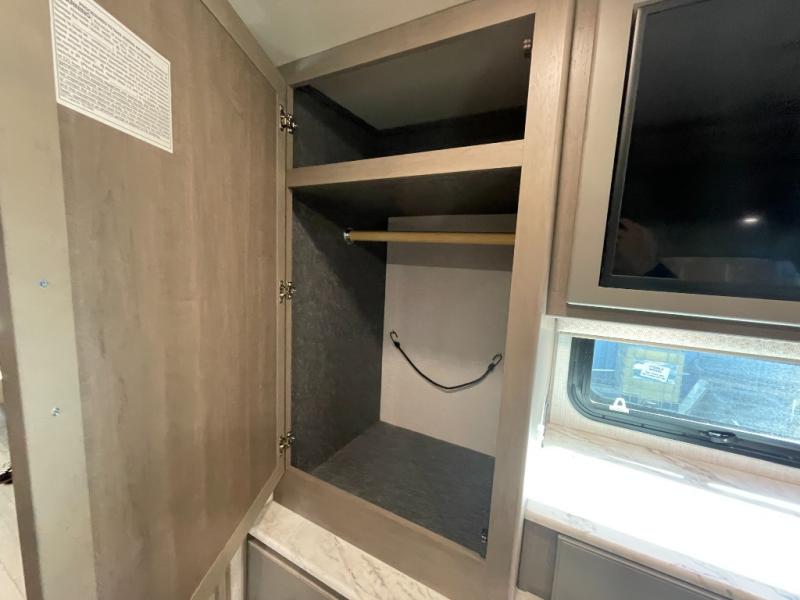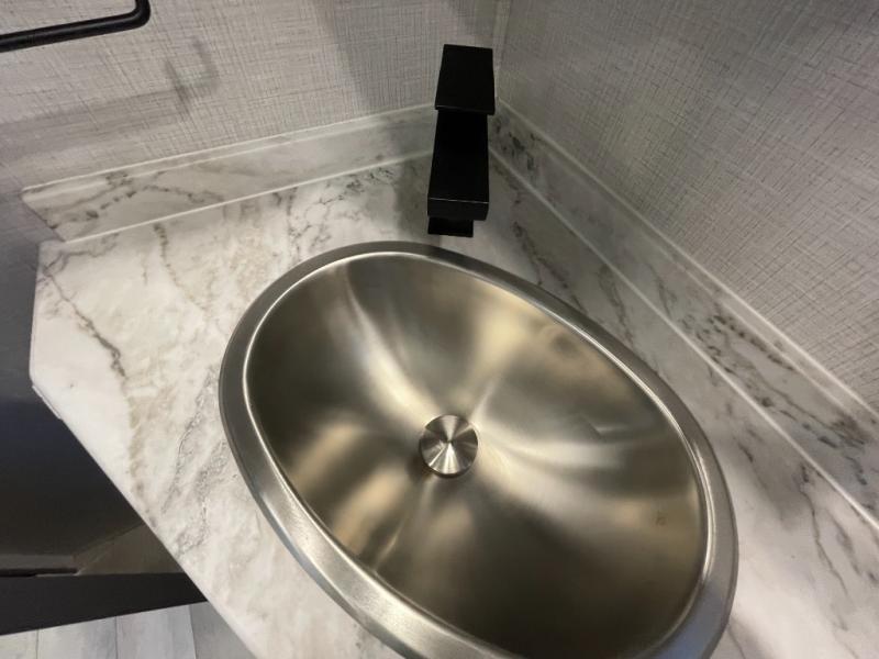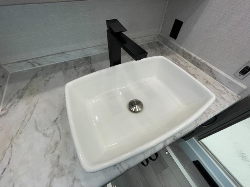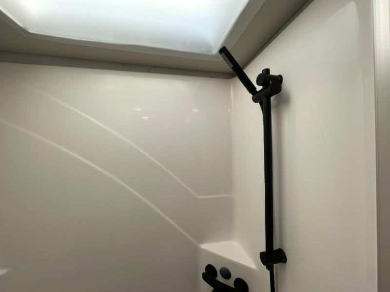 Retreat to the front master suite, where a comfortable queen bed and generous storage help you rest and recharge. The adjacent bathroom features quality fixtures, a spacious shower, and plenty of practical storage for travel essentials—bringing all the comforts of home along for the journey.