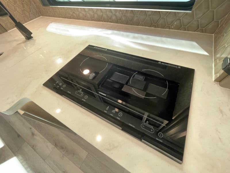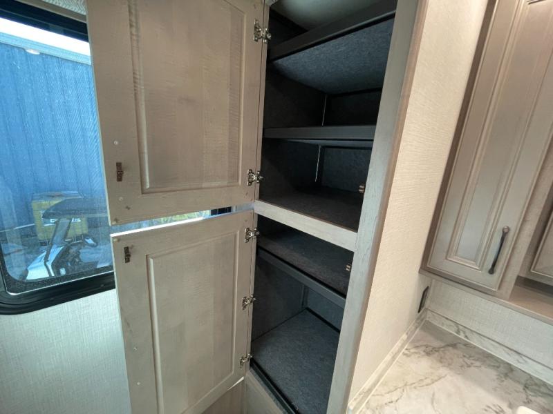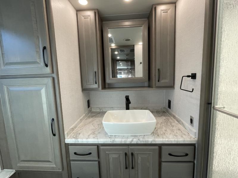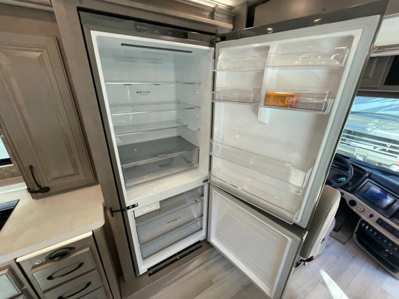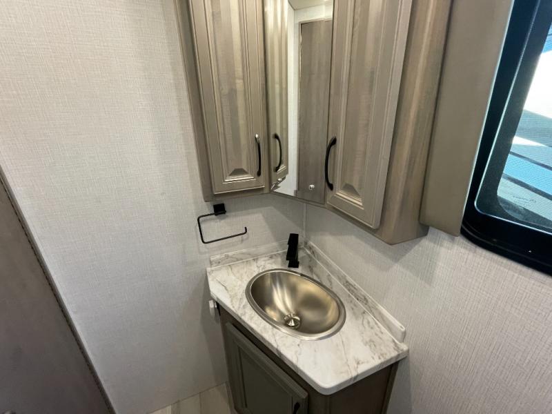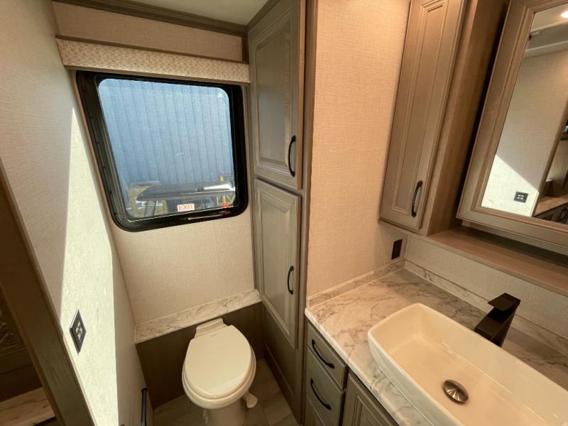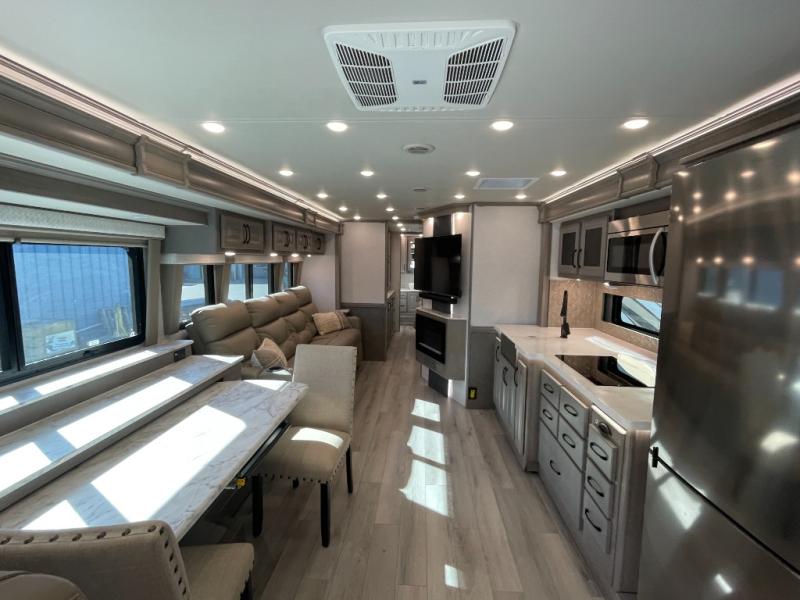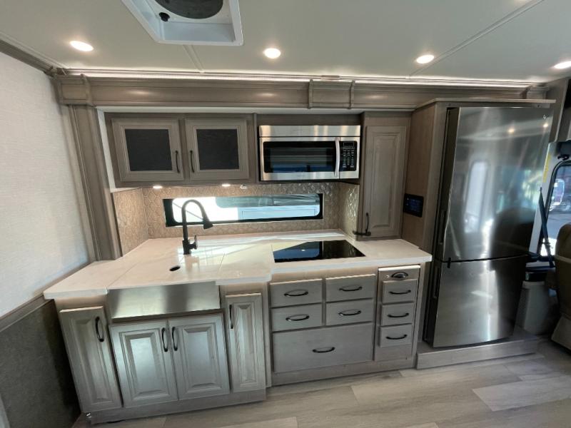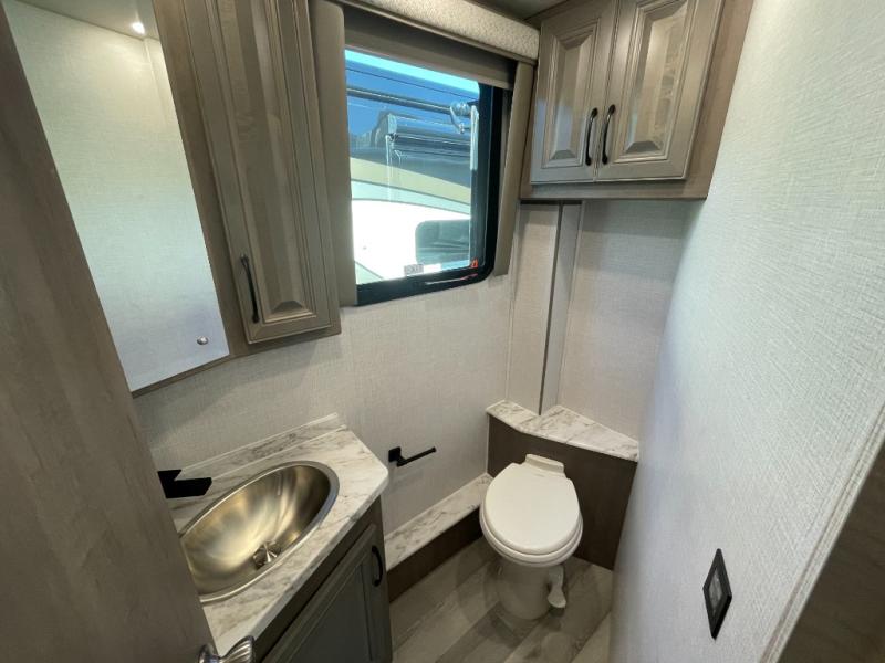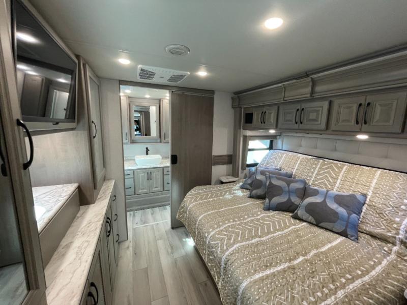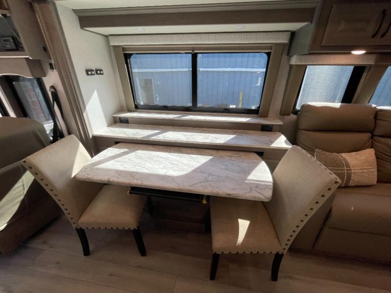 The heart of this motorhome is its fully functional kitchen, where meal prep and cooking are both effortless and enjoyable. Featuring a residential-style refrigerator, three-burner cooktop, oven, microwave, and ample counter space, this kitchen makes it easy to prepare everything from quick breakfasts to full dinners on the road. A large dinette provides a dedicated space for meals, games, or planning your next adventure.