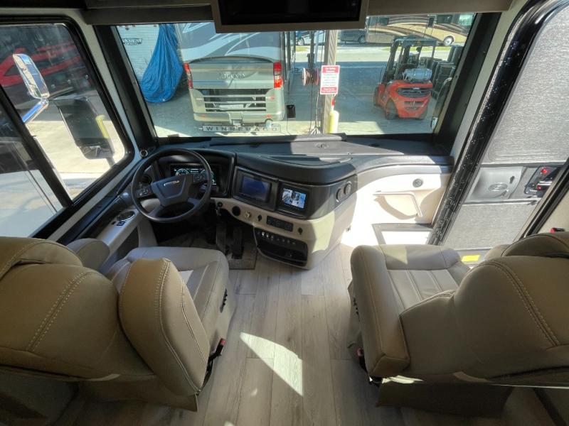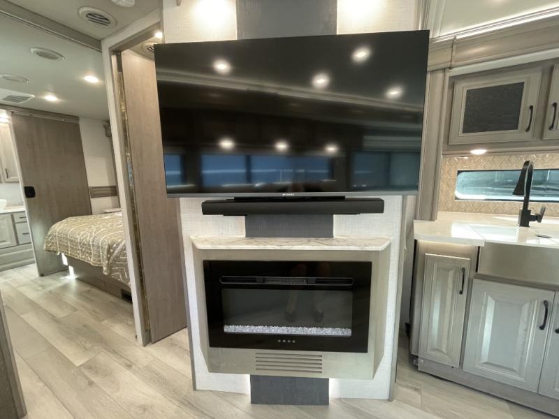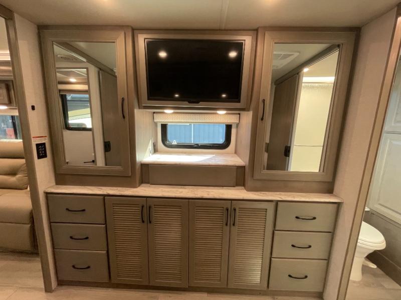Step inside and discover a thoughtfully designed interior that feels open, bright, and ready for memorable moments. The 36SS floorplan offers abundant living space, with a rear lounge area that’s ideal for relaxing with family or entertaining guests. Comfortable seating options, including a convertible sofa and theater seating, are arranged around an entertainment center with TV and storage—perfect for cozy movie nights or unwinding after a day of exploring.