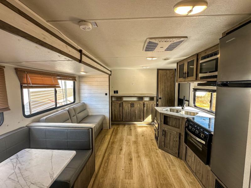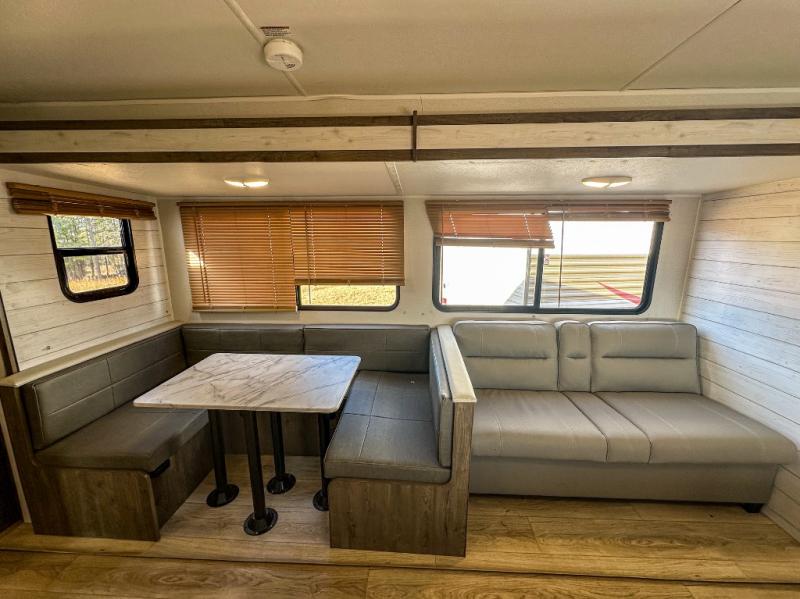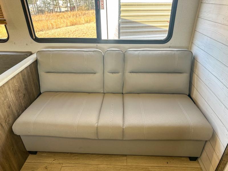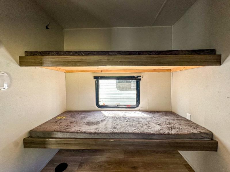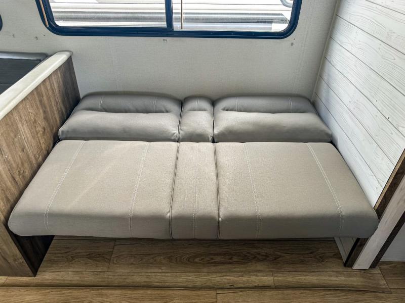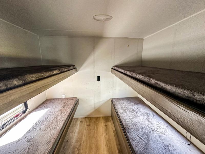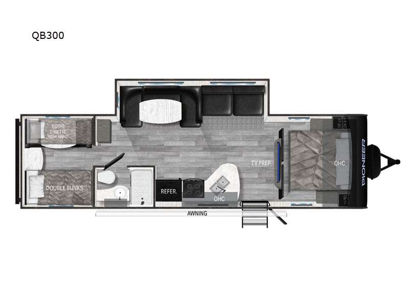When you enjoy camping for the outdoor adventures and staying in your own trailer each night, get ready to enjoy this Pioneer with your group! The main living and kitchen area is spacious thanks to the U-shaped dinette and sofa slide out, and the galley kitchen offers a three-burner cooktop and microwave oven as well as a 12V refrigerator. The front bedroom allows you your own side of the bed and your own storage, while the rear bunkhouse has a single entry and includes triple bunks, plus a kiddie dinette that doubles as sleeping space. The 15' power awning offers shade over the entry door plus along the side of the trailer giving you some protection from the elements. Just grab your camping chairs from the pass-through storage and relax.