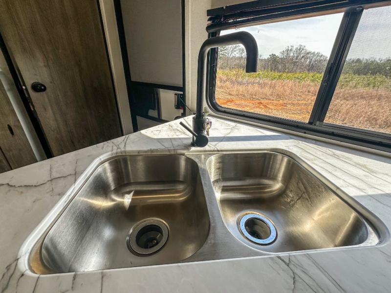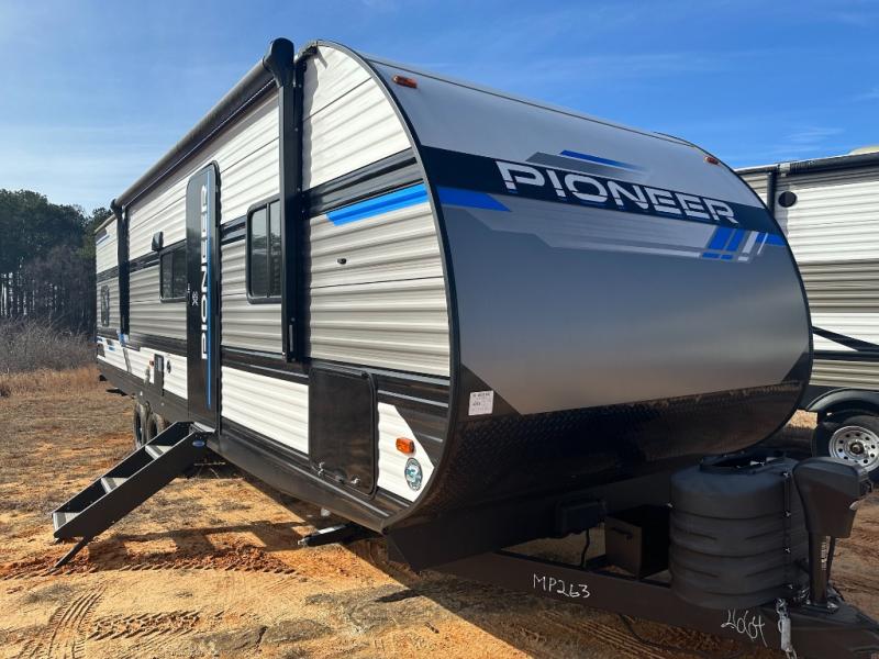 With any Pioneer travel trailer by Heartland, there is a hybrid aluminum front profile with an aerodynamic radius front cage structure for better wind and water deflection, adding strength and reducing tongue weight. The E-Z lube axles help provide smooth towing and the electric awning with LED lights will extend your outdoor living space. Since each model is carpet-free, you can easily clean up after a weekend at the lake, and the extra large crossflow windows allow fresh air to move through your trailer. There are also ball bearing drawer guides and a residential style (50/50) sink in the kitchen, a power vent in the bath, plus an innerspring mattress and TV hookups in the bedroom for added convenience.