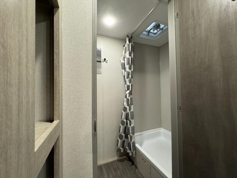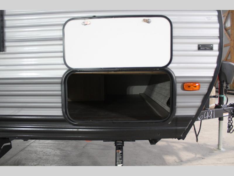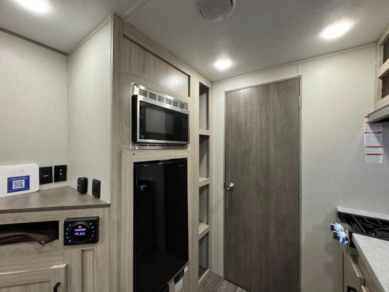 This value price point Aurora Light allows you versatility as you camp! You can sleep comfortably each night on the Murphy bed up front, then fold it away in the morning to relax on the sofa. There are dual nightstands for your things, plus overhead storage. This Aurora kitchen includes a 12V 3.3 cu. ft. refrigerator, a two burner cooktop, plus a microwave oven to easily make meals each day, and the full rear bath will come in handy after a day at the lake. After dinner, relax on the sofa, or head outdoors to relax under the 10' awning!