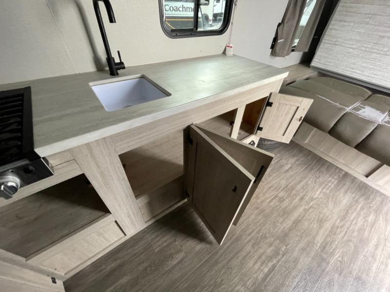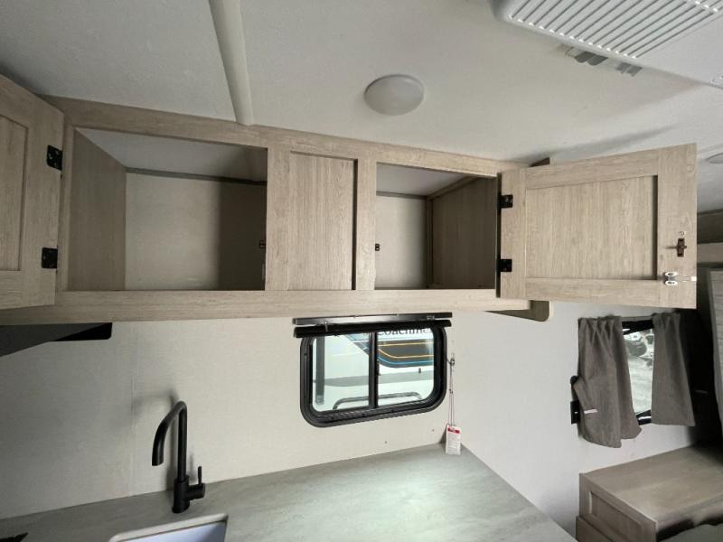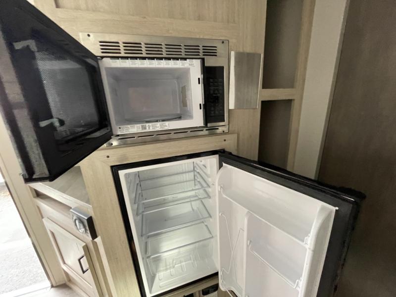 This value price point Aurora Light allows you versatility as you camp! You can sleep comfortably each night on the Murphy bed up front, then fold it away in the morning to relax on the sofa. There are dual nightstands for your things, plus overhead storage. This Aurora kitchen includes a 12V 3.3 cu. ft. refrigerator, a two burner cooktop, plus a microwave oven to easily make meals each day, and the full rear bath will come in handy after a day at the lake. After dinner, relax on the sofa, or head outdoors to relax under the 10' awning!