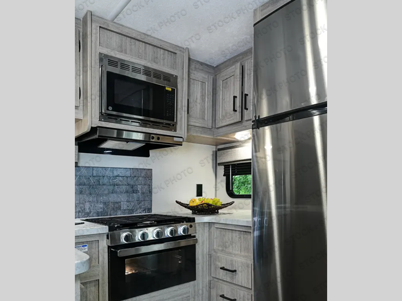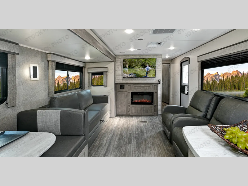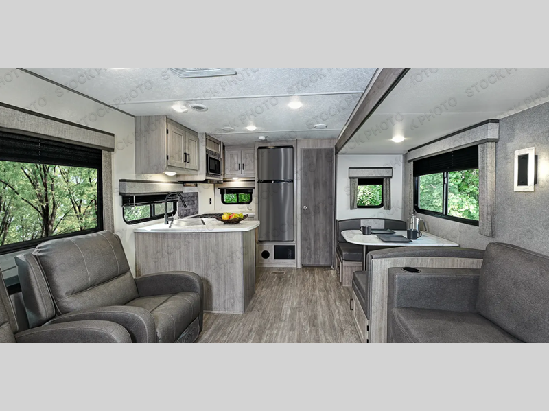 The chef will love cooking in the rear kitchen of this travel trailer! You will feel right at home in the front private bedroom with the 60" x 74" queen bed slide across from a dresser and a front closet that has an area prepped for an optional washer and dryer. There is an optional fireplace and entertainment center in the living area in by the two recliner lounge chairs and the 68" sofa next to the 45" booth dinette. Stay clean and fresh with the 36" x 30" shower pan with a skylight above for natural lighting as you get ready in the full bathroom. The 21' electric awning has multicolor lights for you to choose your favorite color as you enjoy a refreshing beverage from the mini fridge!