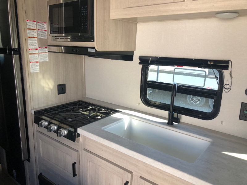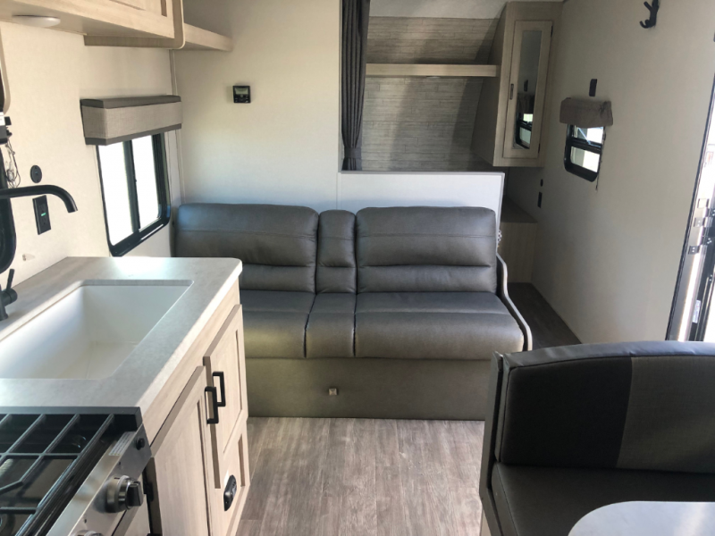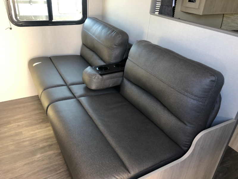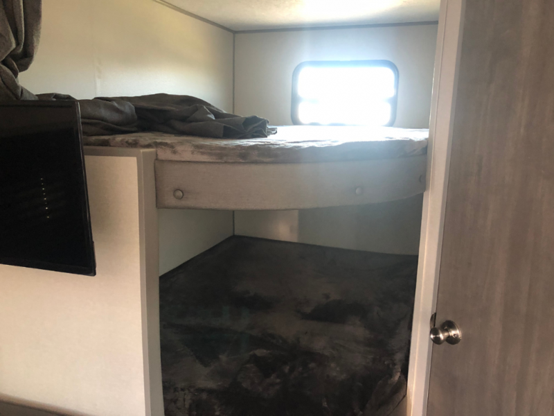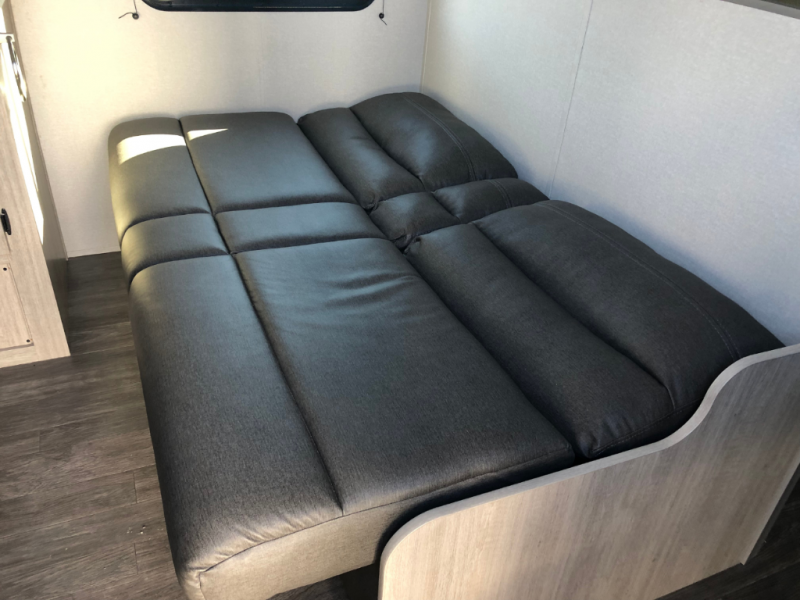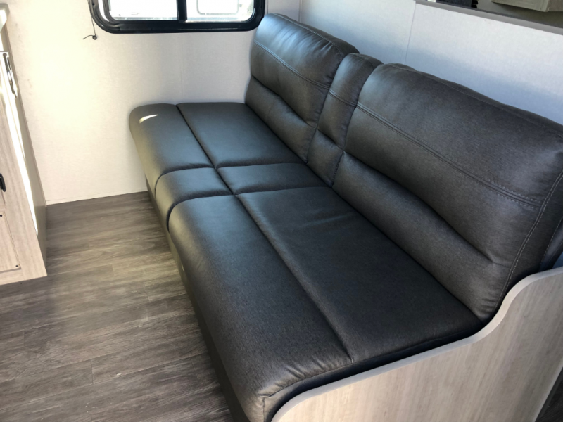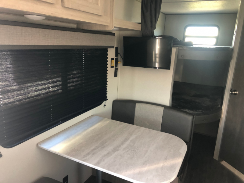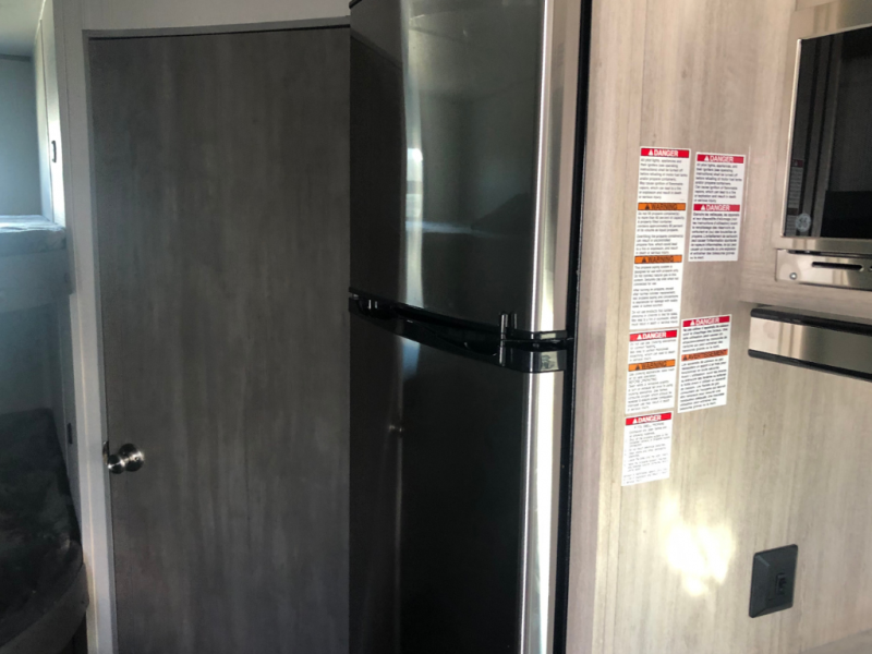Pack your bags and head out on a fun weekend camping trip with this travel trailer! Whether you have a small family or a few guests wanting to come along, there will be enough sleeping spaces between the double sized bunk beds, the 60" x 74" queen bed in the front semi-private bedroom, the sofa when you don't have the arm rest/cupholders down, and even the booth dinette. The chef can prepare meals indoors using the three burner cooktop or microwave oven, and there is a 12V 10.7 cu. ft. refrigerator for perishables . There is plenty of storage throughout with the overhead cabinets and wardrobes, as well as outside with the front pass-through storage area!