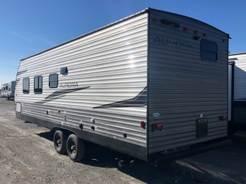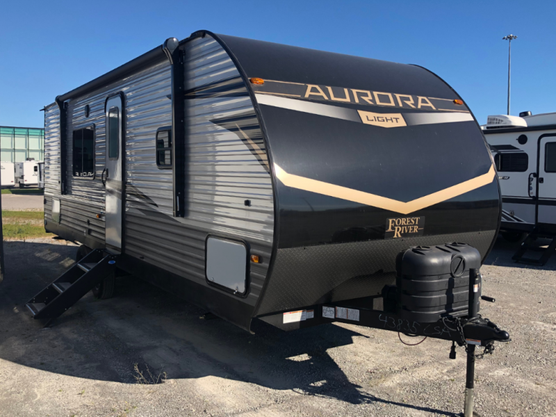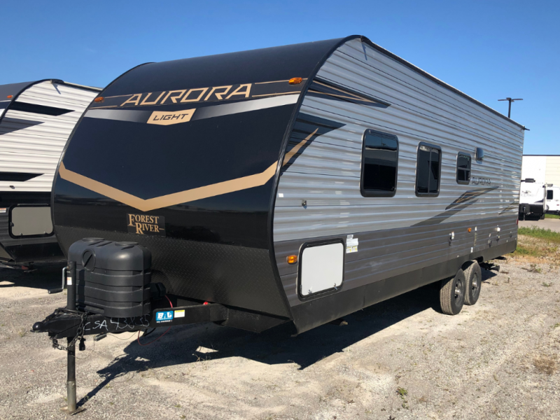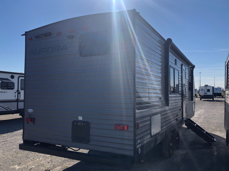 Comfortability, usability, and quality is what you will find in each one of these Forest River Aurora travel trailers, toy haulers or destination trailers! They are designed with a superior build and packed full with industry leading, functional, and distinctive standard features. SolidStep entrance steps and a Safe-T rail door assist on main entry door to help you safely enter and exit the unit. The diamond plate rock guard will protect your unit from road debris and the nitrogen filled radial tires, which keep their pressure longer, offer better fuel economy. You will also find upgraded JBL Elite exterior speakers outside, an electric awning with multicolor lights and remote, plus flush mount baggage doors for easy packing. The interiors are beautifully designed with a deep undermount farm style sink, stainless steel appliances, and linoleum flooring throughout which will be easy to clean. Come find your favorite model today!