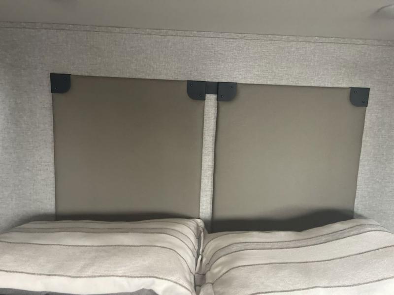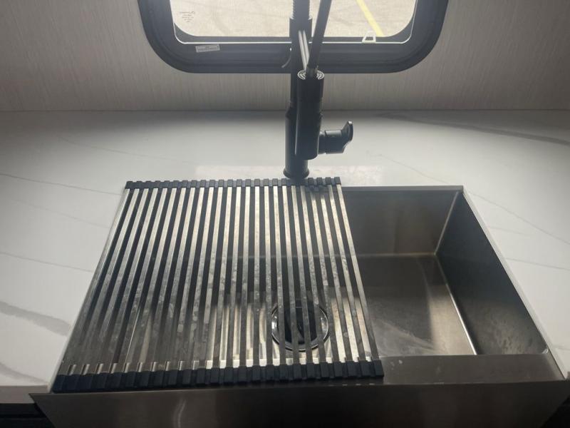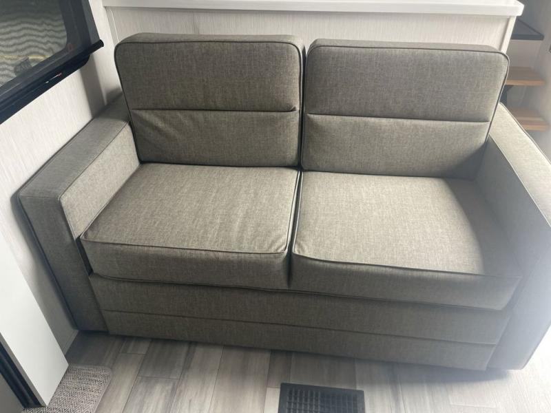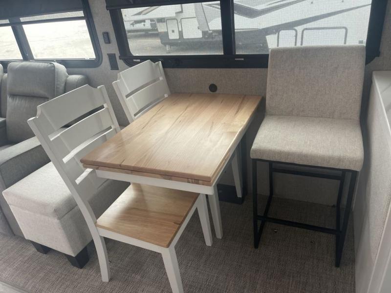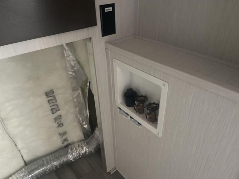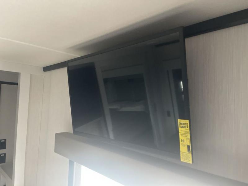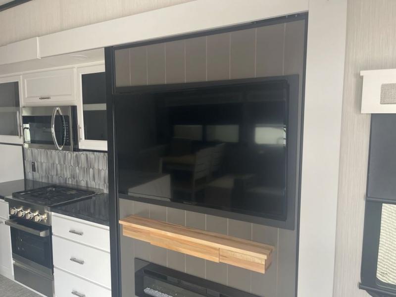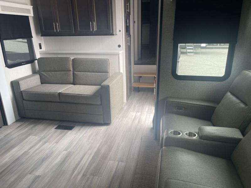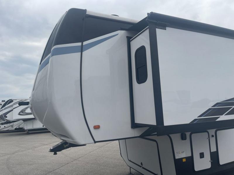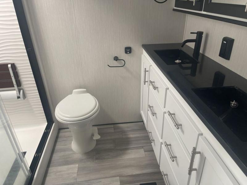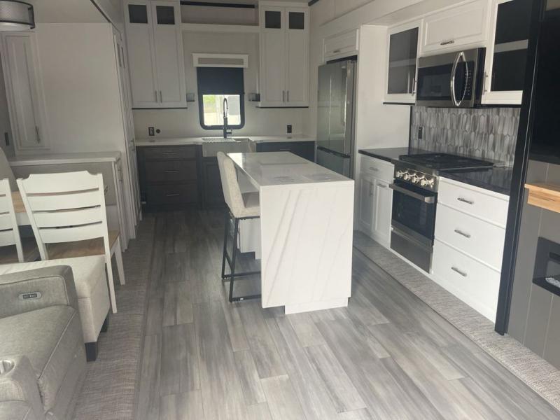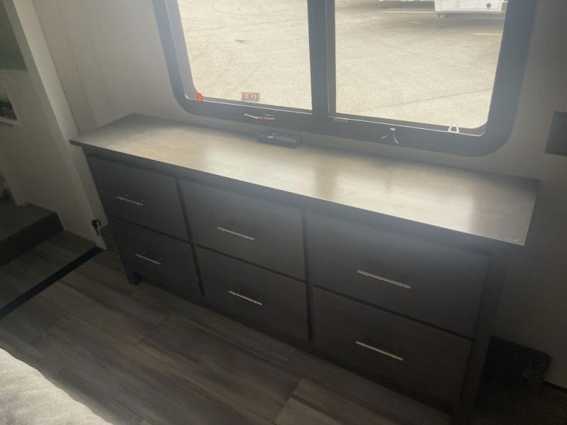 It will feel like coming home each time you take this fifth wheel out! The dual opposing slides in the main living area make your space open, and the waterfall island with two stools will be the perfect place to prep meals, dine together, or set out snacks for movie night! You will also love the rear counter space with a large sink to clean up each day and there is a dishwasher option if you want the option to make the process even easier. A tri-fold sofa in the main living area will provide a place for a guest or two to sleep, and the Murphy pantry hidden behind the entertainment center and fireplace will keep snacks stocked up. The full bath includes a shower with a seat, dual bath sinks, plus a linen closet to keep towels tidy. What could make this fifth wheel better than a king bed slide out in the front bedroom?! How about a large wardrobe with washer/dryer prep, a dresser with a TV above, and overhead storage for belongings!