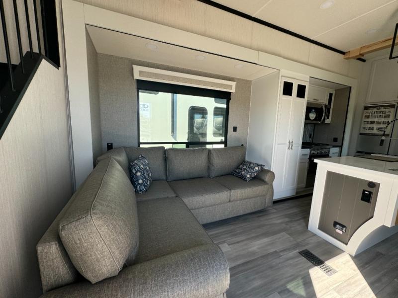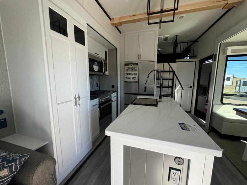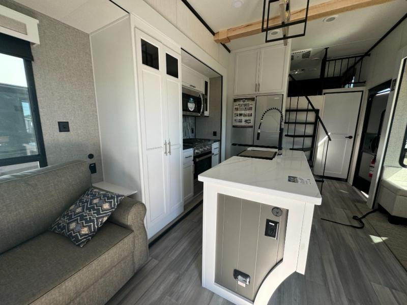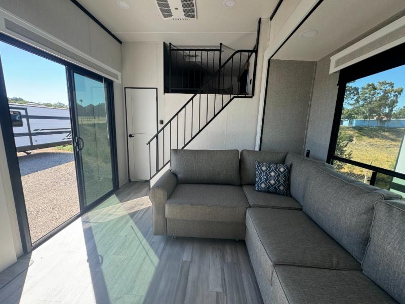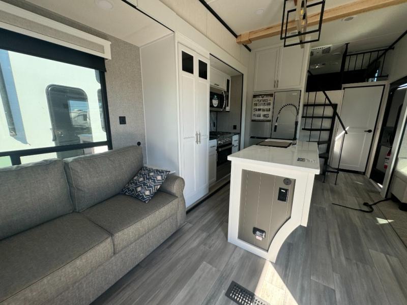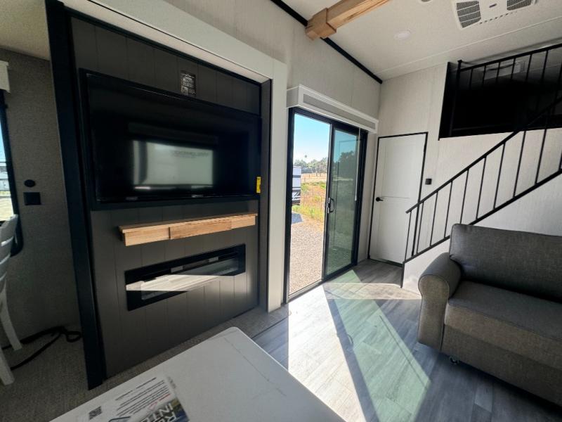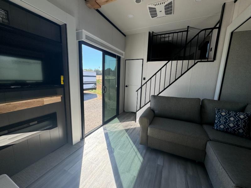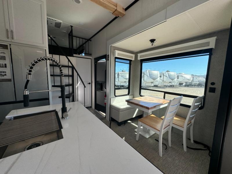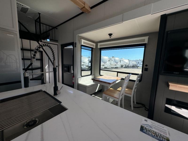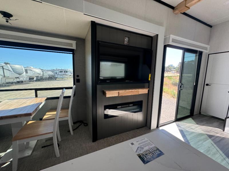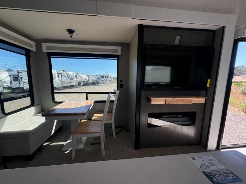 A front and rear loft plus master bedroom offer three different sleeping spaces that you and your family or guests will enjoy. The front master offers a king bed slide, plus two dressers and a wardrobe for clothing. There is also a 32" TV as well. The main combined living and kitchen area features a large L-shaped sectional sofa opposite a swivel mount Smart TV and fireplace mounted on the exterior door that hides a Murphy pantry. The kitchen is fully equipped for all of your cooking needs with stainless steel GE appliances and an island with fold-down breakfast counter. There is also a free standing dinette with extension.