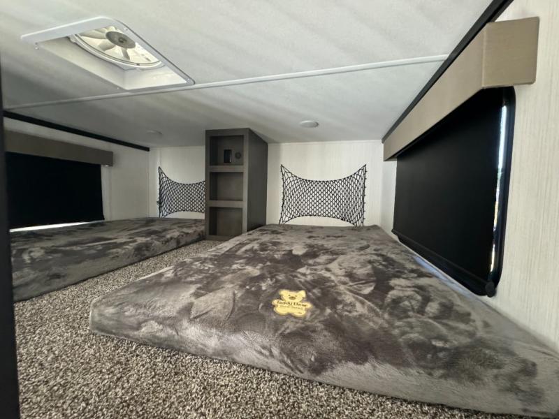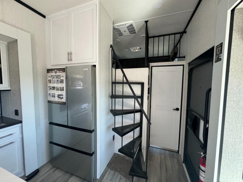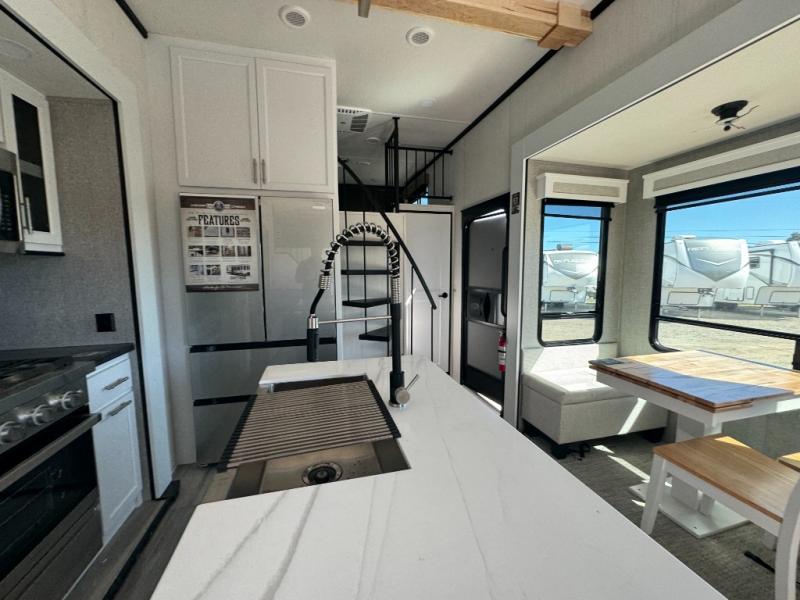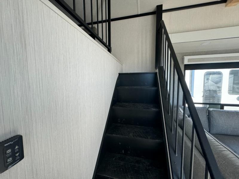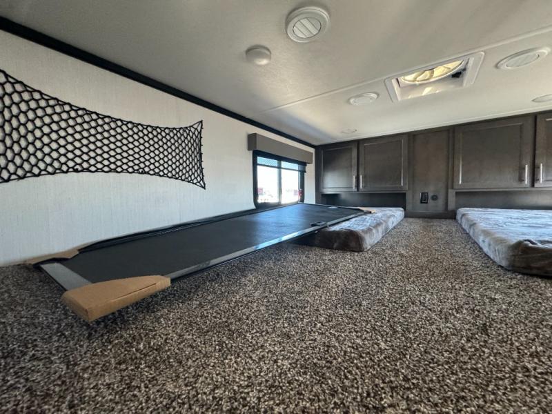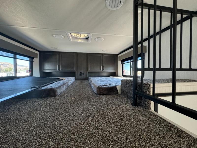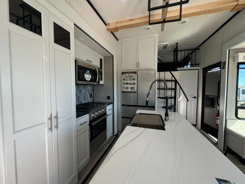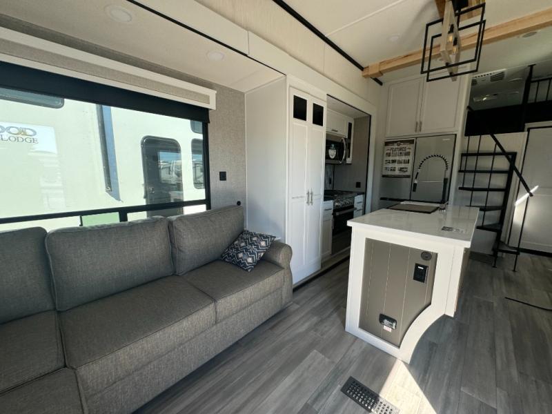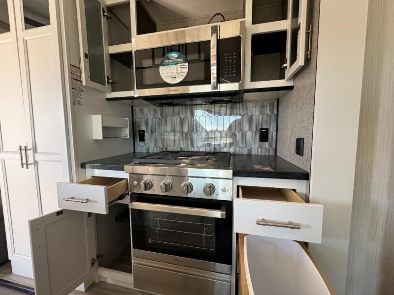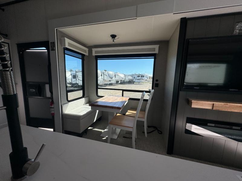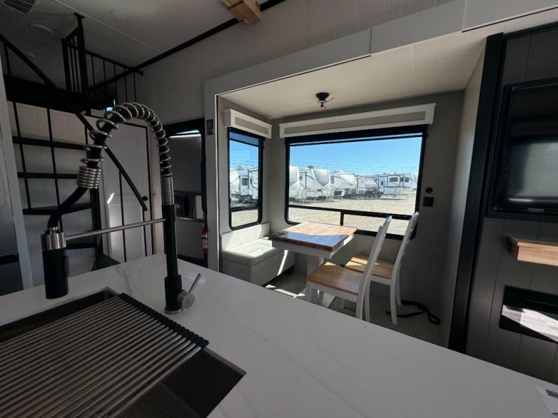 A front and rear loft plus master bedroom offer three different sleeping spaces that you and your family or guests will enjoy. The front master offers a king bed slide, plus two dressers and a wardrobe for clothing. There is also a 32" TV as well. The main combined living and kitchen area features a large L-shaped sectional sofa opposite a swivel mount Smart TV and fireplace mounted on the exterior door that hides a Murphy pantry. The kitchen is fully equipped for all of your cooking needs with stainless steel GE appliances and an island with fold-down breakfast counter. There is also a free standing dinette with extension.