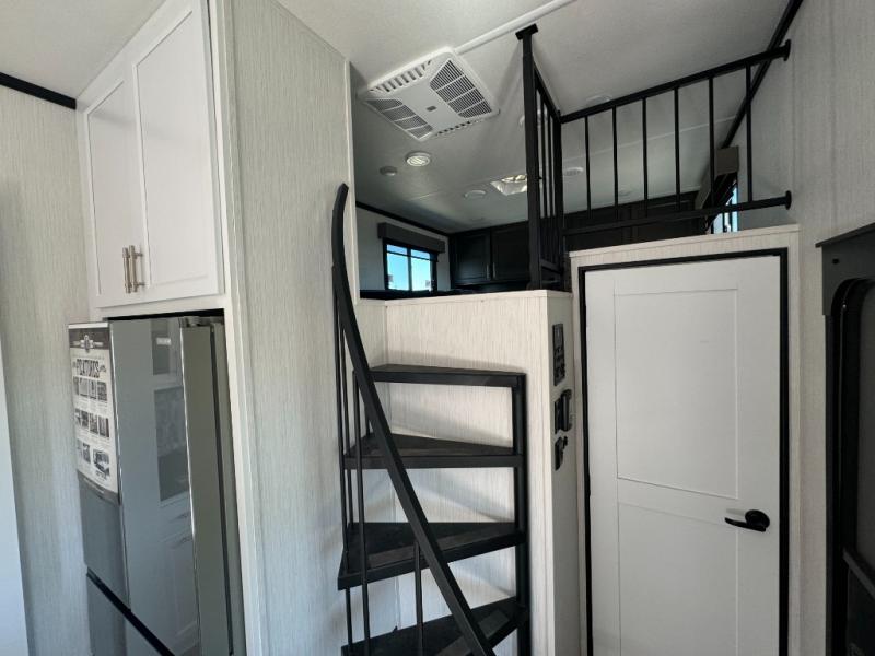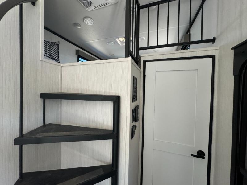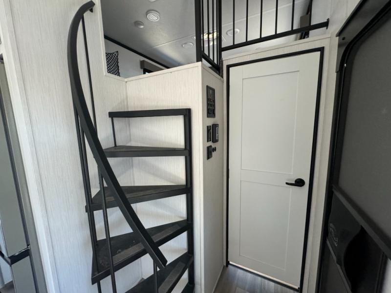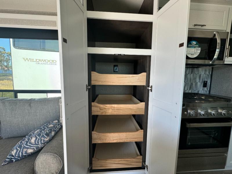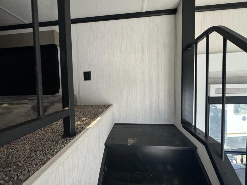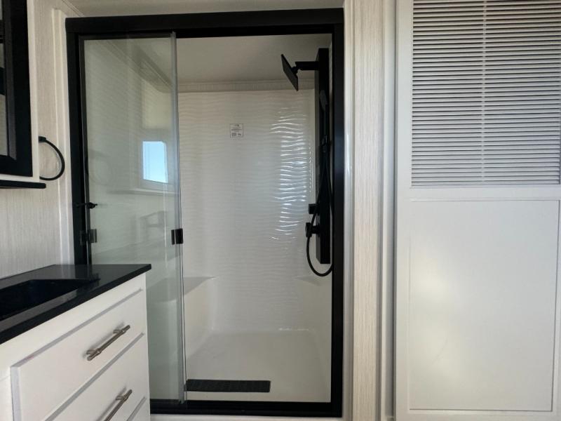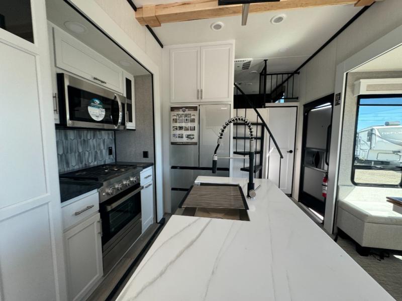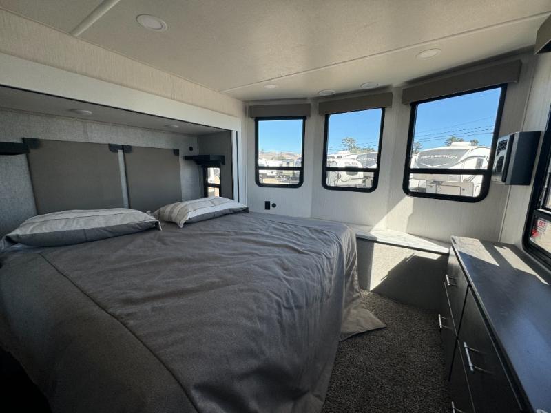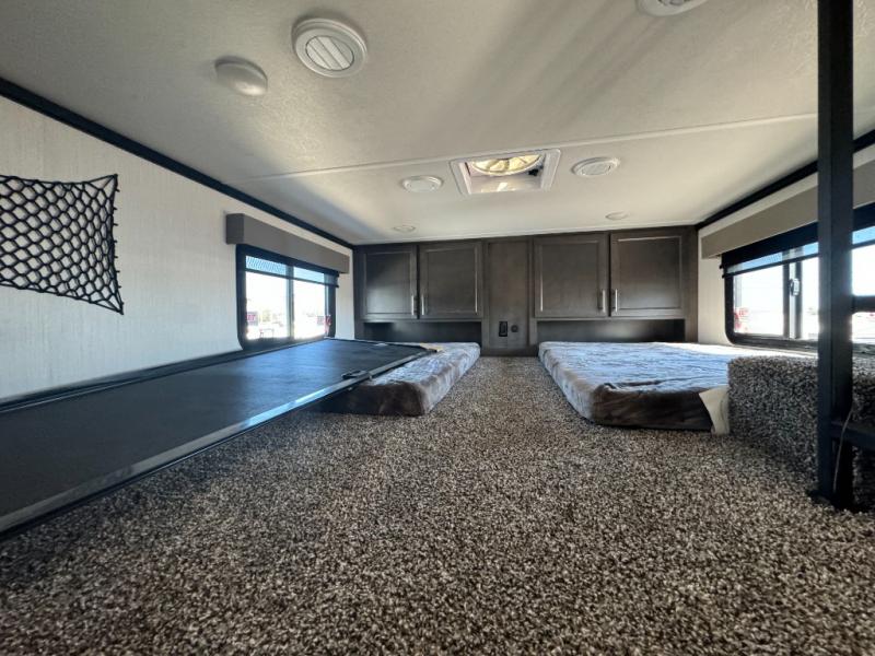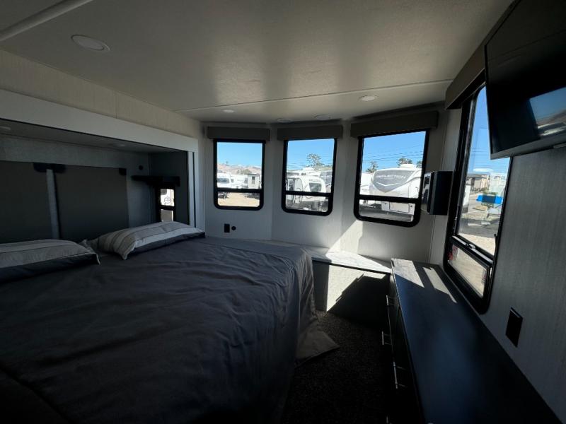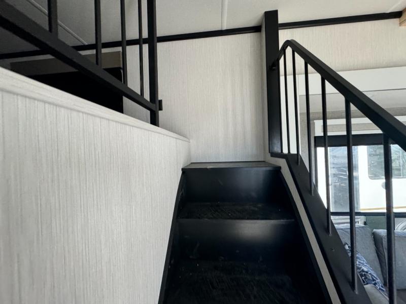 A front and rear loft plus master bedroom offer three different sleeping spaces that you and your family or guests will enjoy. The front master offers a king bed slide, plus two dressers and a wardrobe for clothing. There is also a 32" TV as well. The main combined living and kitchen area features a large L-shaped sectional sofa opposite a swivel mount Smart TV and fireplace mounted on the exterior door that hides a Murphy pantry. The kitchen is fully equipped for all of your cooking needs with stainless steel GE appliances and an island with fold-down breakfast counter. There is also a free standing dinette with extension.