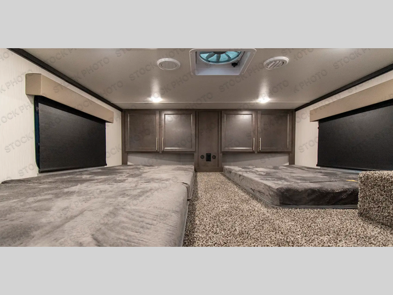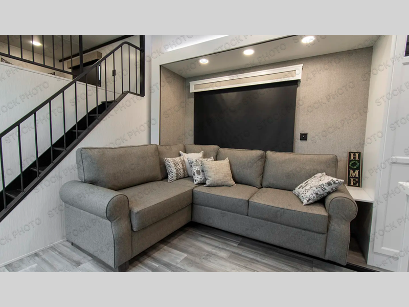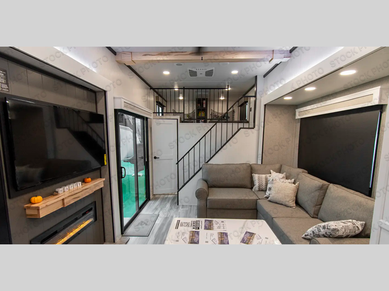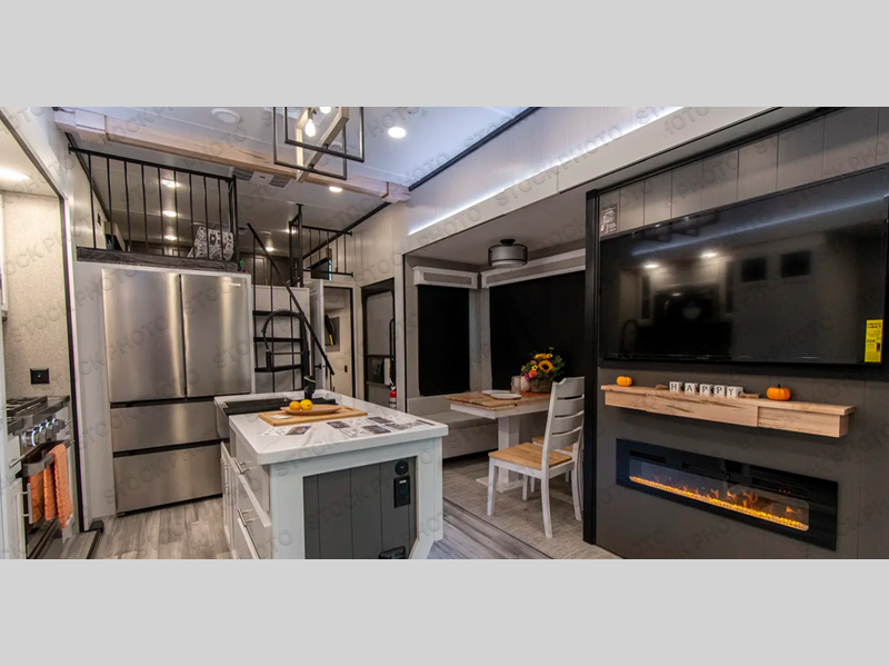A front and rear loft plus master bedroom offer three different sleeping spaces that you and your family or guests will enjoy. The front master offers a king bed slide, plus two dressers and a wardrobe for clothing. There is also a 32" TV as well. The main combined living and kitchen area features a large L-shaped sectional sofa opposite a swivel mount Smart TV and fireplace mounted on the exterior door that hides a Murphy pantry. The kitchen is fully equipped for all of your cooking needs with a 30" stainless steel microwave, a 12V 20 cu. ft. refrigerator, an island with fold-down breakfast counter. There is also a free standing dinette with an extension and an ottoman.