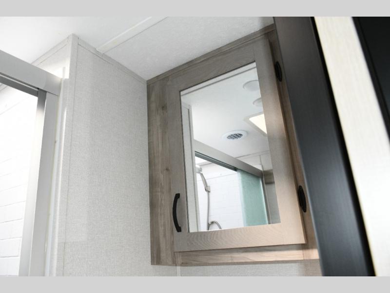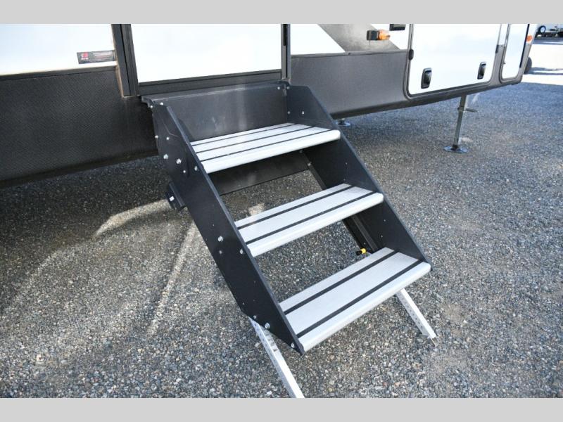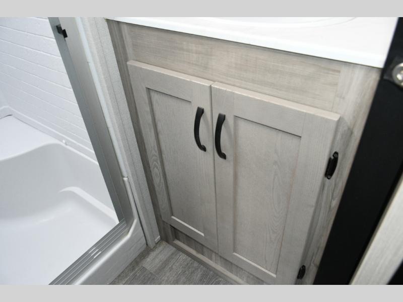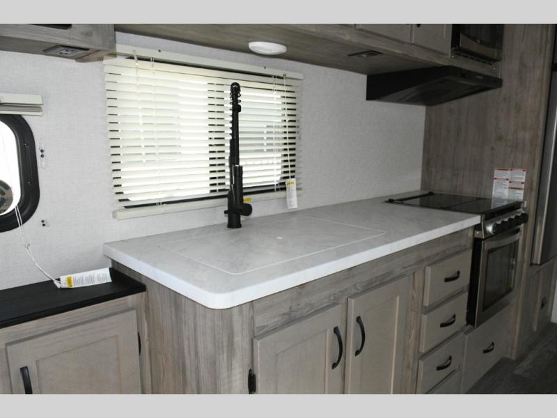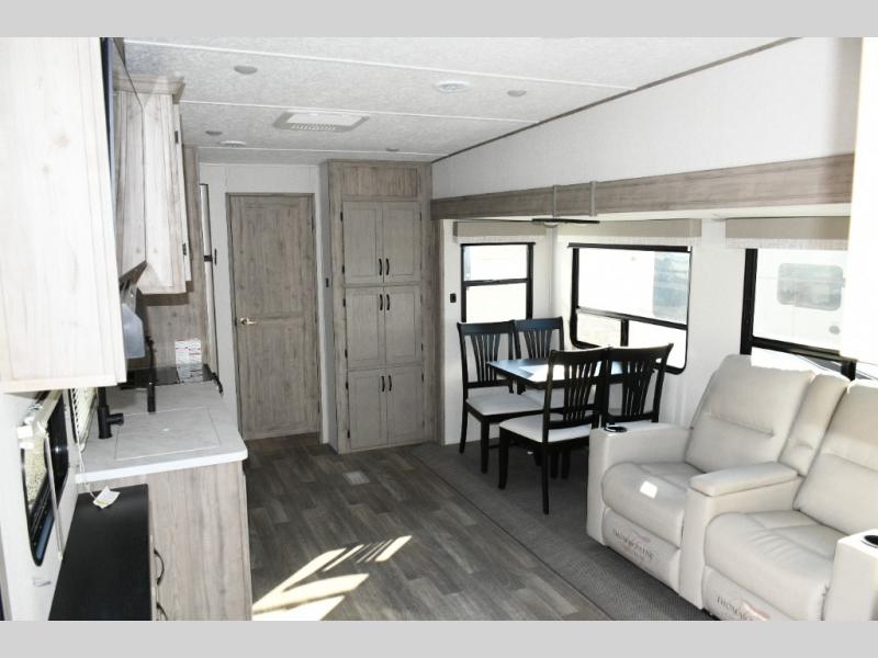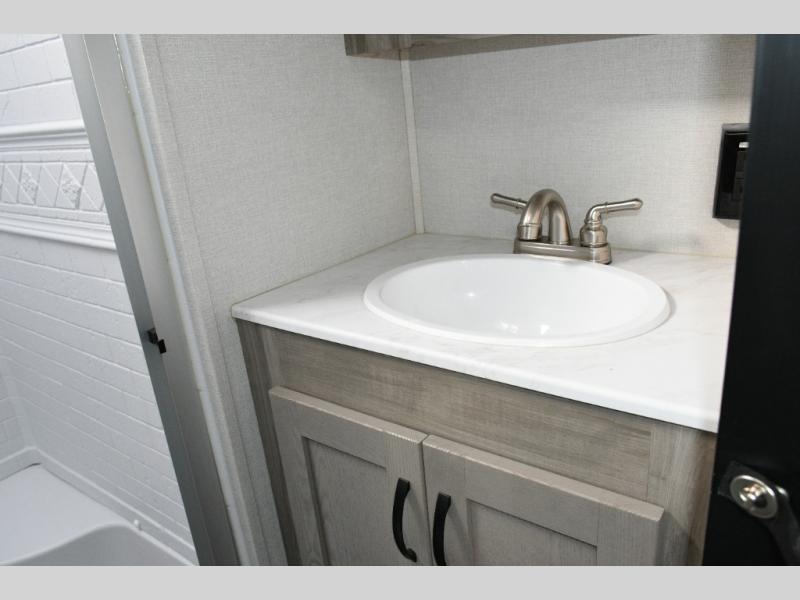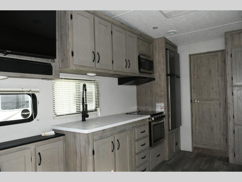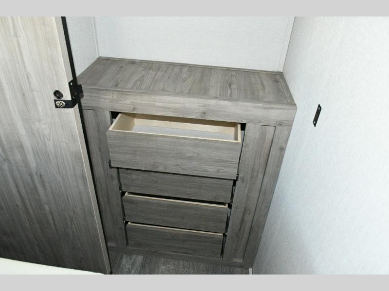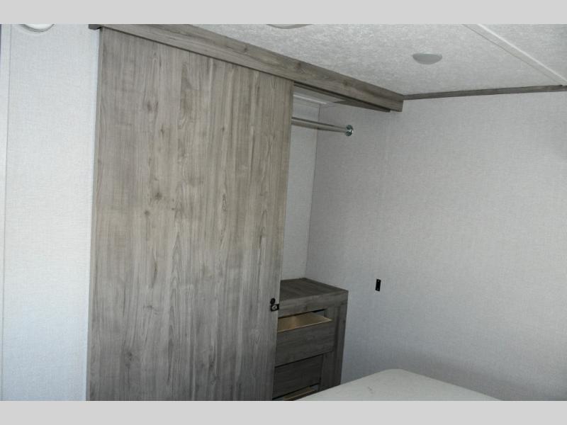 The kids will love having their own retreat in the private rear bunkhouse, featuring two sets of 30" x 74" bunks and plenty of wardrobe storage. Best of all, the bunkhouse includes its own full bathroom with an exterior entry door — perfect for keeping muddy feet and outdoor messes out of the main living space.