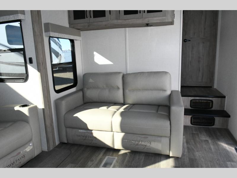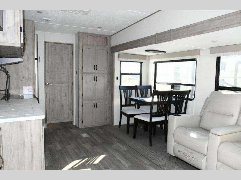 The open-concept living space invites relaxation and togetherness. The tri-fold hide-a-bed sofa adds extra sleeping capacity for guests, while the free-standing dinette offers the perfect spot for meals or game nights. A modern sound bar with stereo and a high BTU electric fireplace make it easy to unwind in comfort.