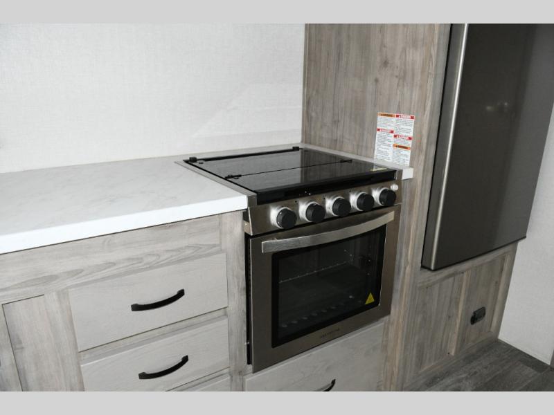 Whip up your favorite meals in the fully equipped kitchen featuring a 21" stainless steel oven, residential cooktop, and solid-surface countertops. When the weather’s nice, take the cooking outside to the outdoor kitchen, complete with a fridge and cooktop under the 18' electric awning with LED lighting — ideal for hosting and relaxing outdoors.