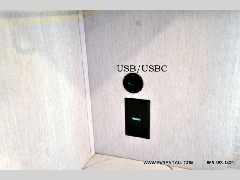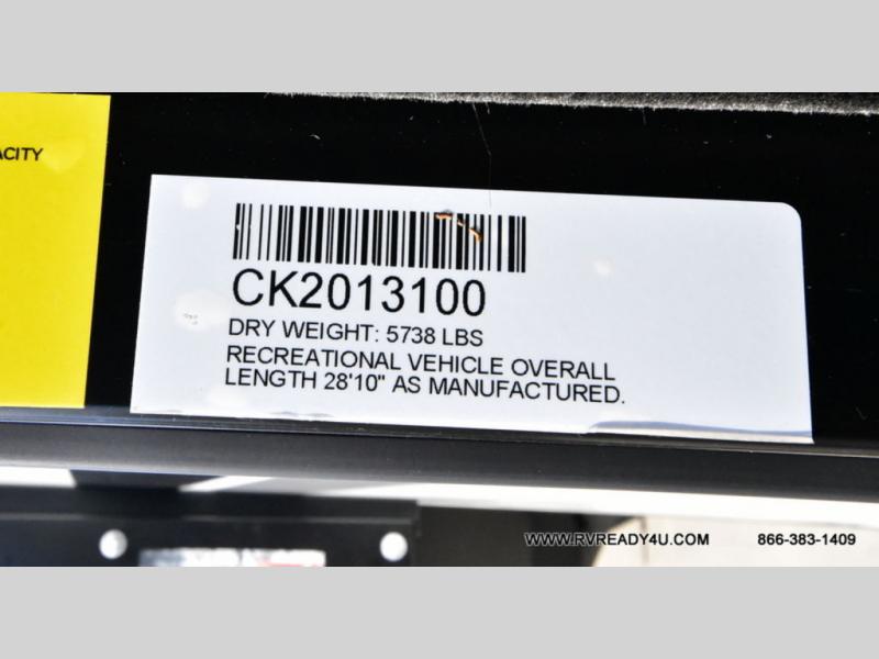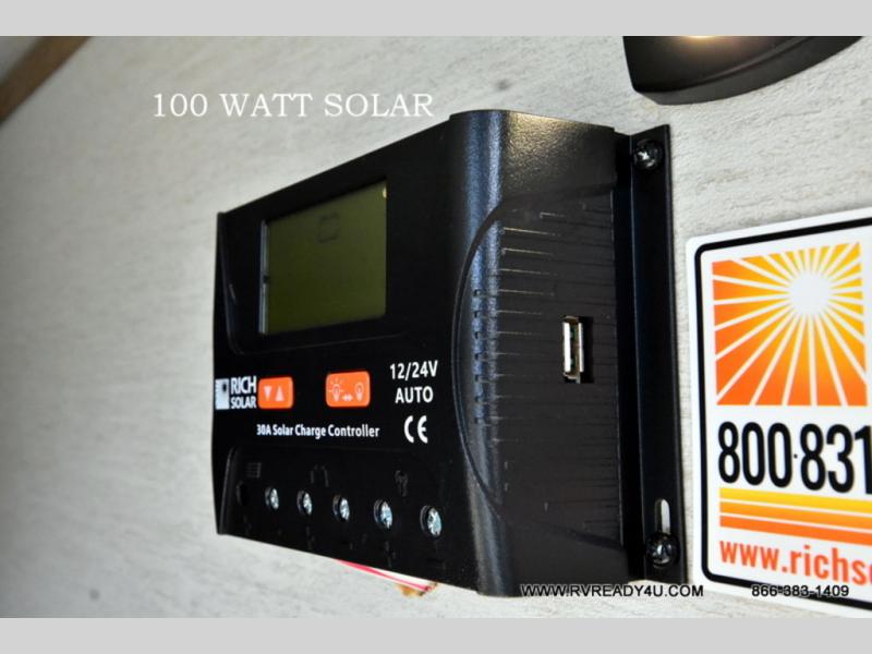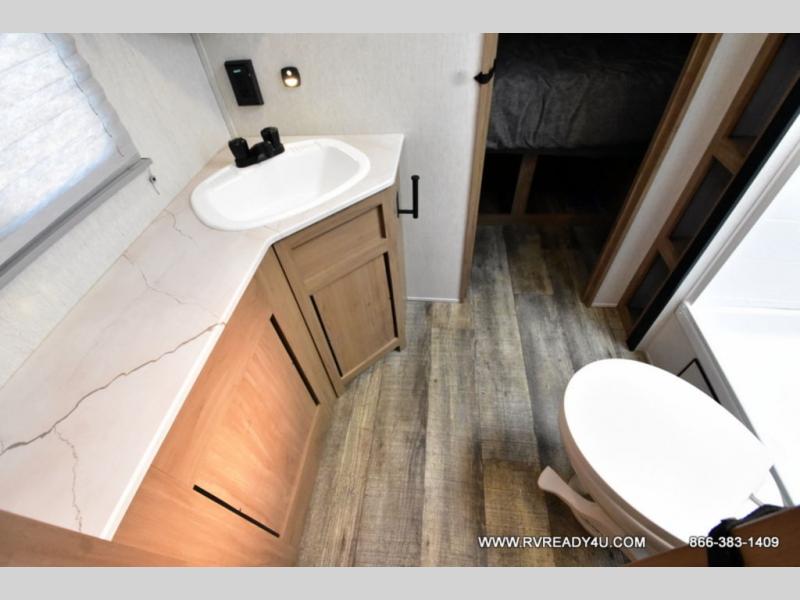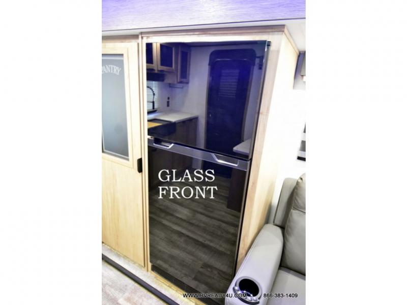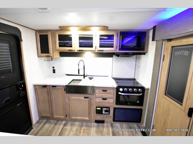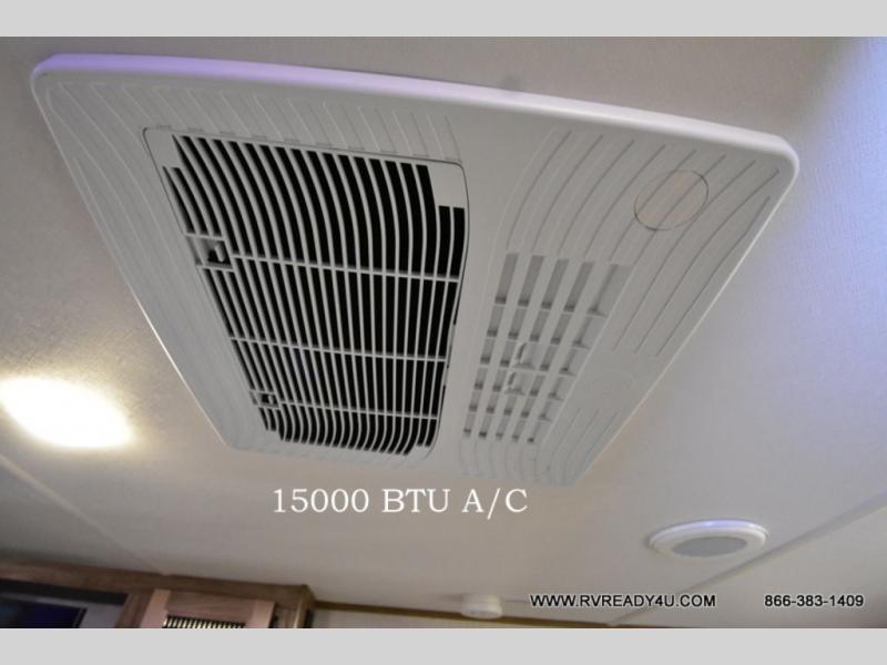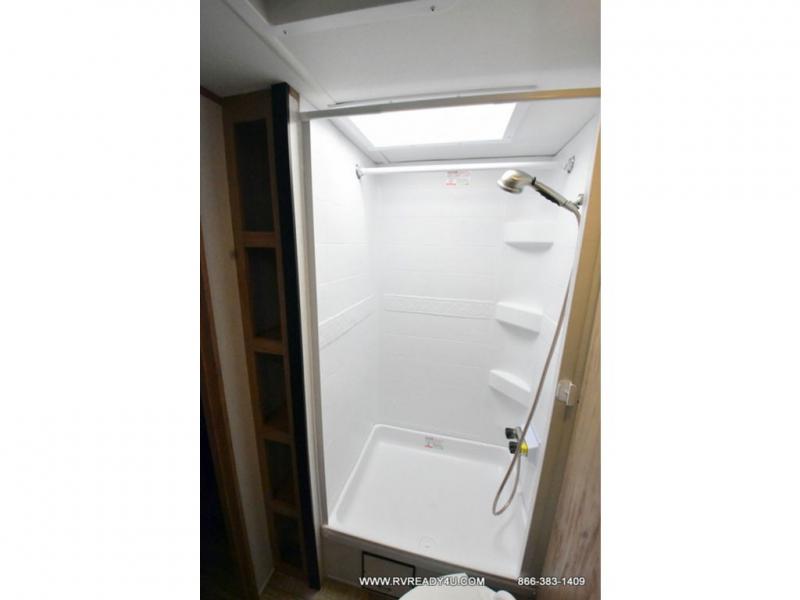 You and your spouse will have a comfortable time camping in this travel trailer! The front private bedroom has a queen bed with wardrobes on either side of it, plus one of the dual entry doors to the unit. As you leave the bedroom, you will enter the walk-through bathroom which has a shower with a skylight above and a removable clothes hanging rod to dry off your swimsuit after swimming in the lake. The chef can prepare their best home cooked meals in the rear kitchen, and you can enjoy them at the booth dinette before storing any leftovers in the 12V refrigerator. The theater seating has cupholders so you can enjoy a beverage while you read your favorite book!
