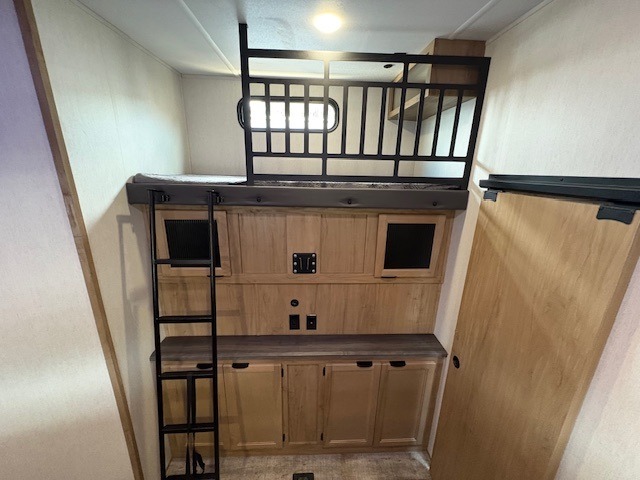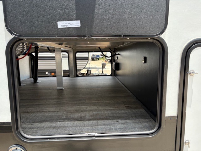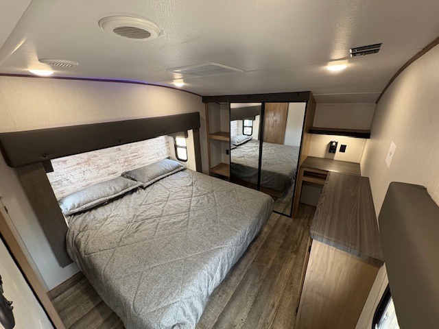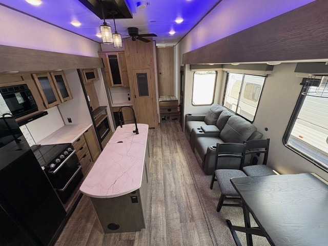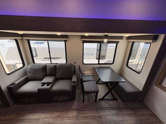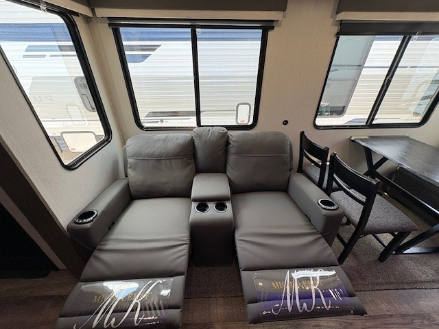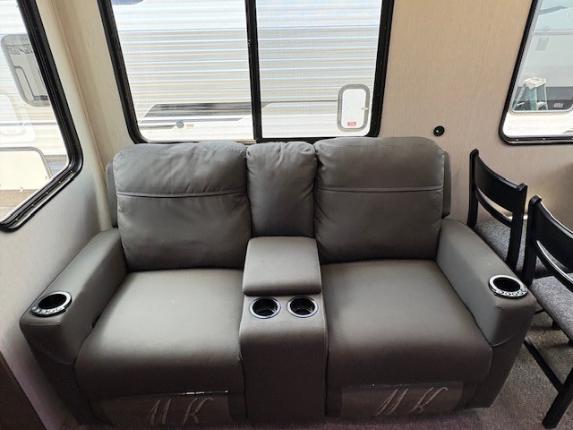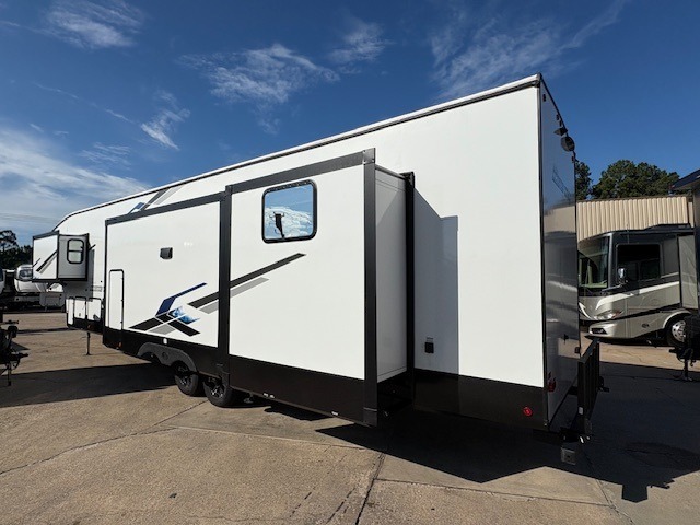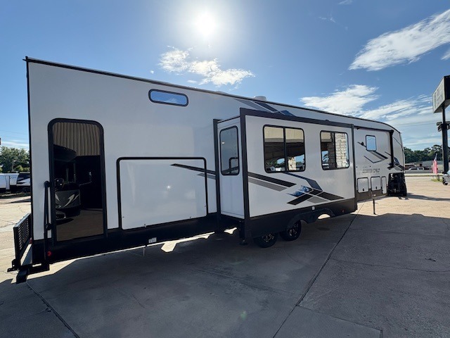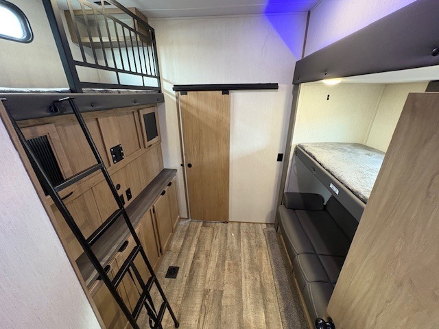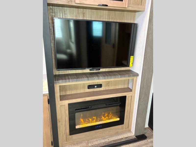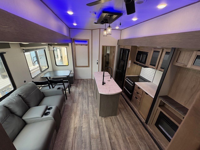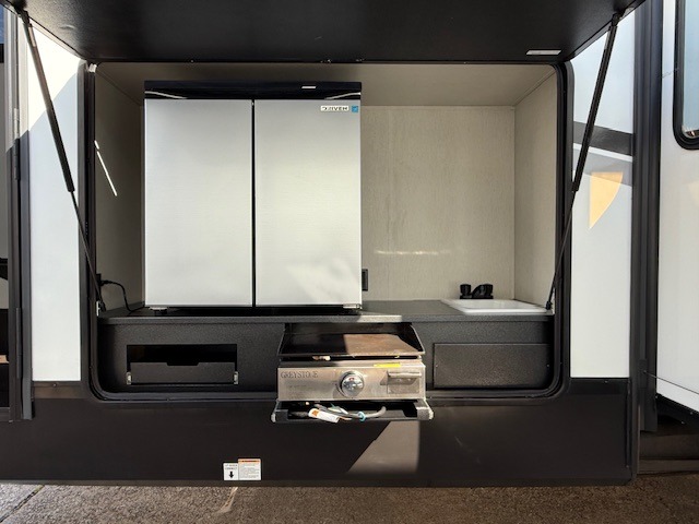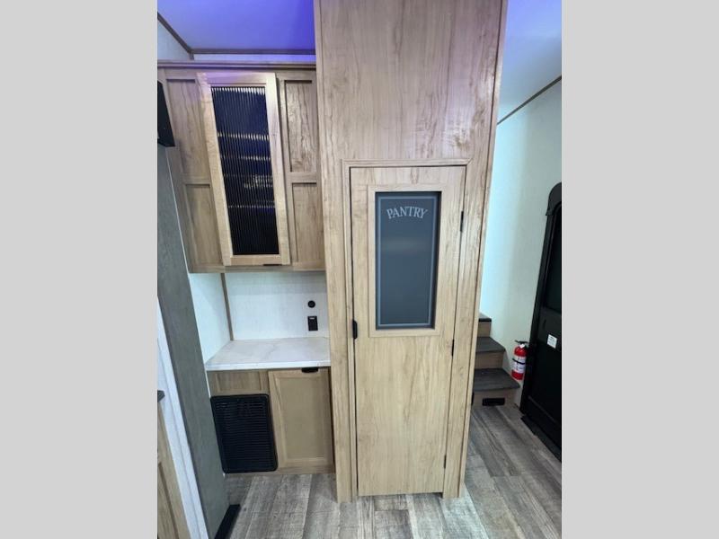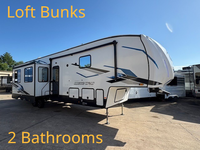 You can't beat this dual entry fifth wheel packed with luxury amenities! Your guests will love the rear private bunkhouse with their own full bath and exterior entry door, plus a jackknife sofa with drawers and a bunk above. There is even a 28" x 72" loft with overhead storage for more sleeping space! The main kitchen and living area includes dual opposing slides, theater seating across from the fireplace, and a free-standing table with chairs and a storage ottoman seat. The kitchen includes a 16 cu. ft. 12V residential refrigerator, a hutch, and a pantry for storage as well. You'll find the second full bath to be super convenient when traveling with friends and family, and the front private bedroom will feel just like home. Here, you'll find a king bed slide out, a wardrobe, shelves, and a desk area if you're working remotely. Head outdoors to enjoy the exterior griddle and two exterior refrigerators, plus the 15' power awning and pass-through storage!