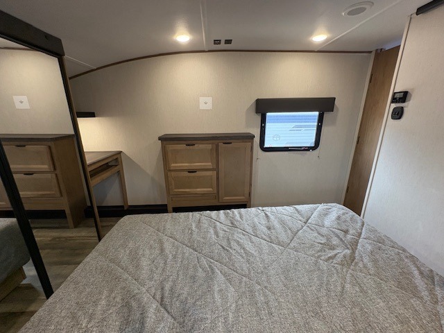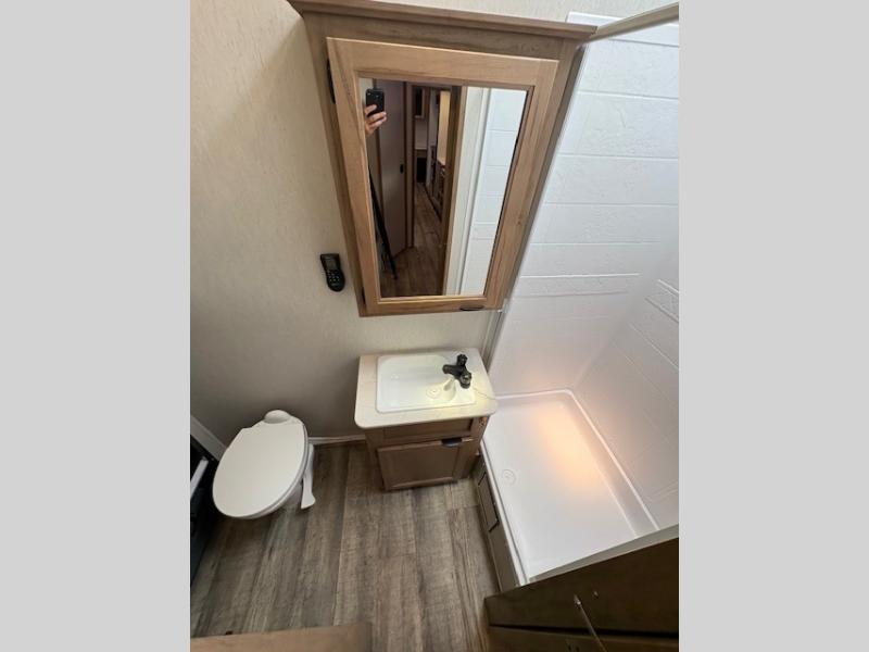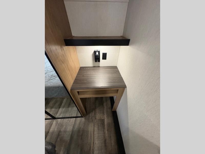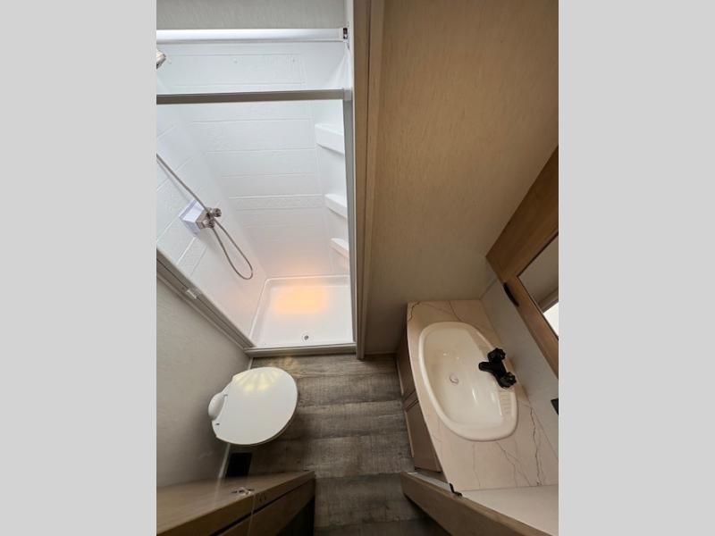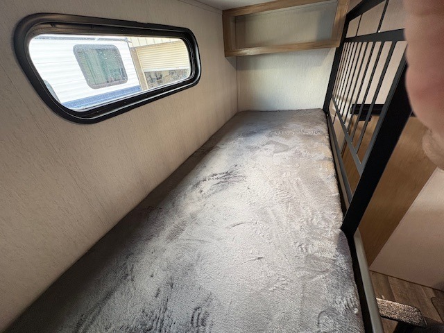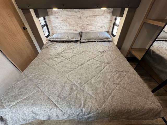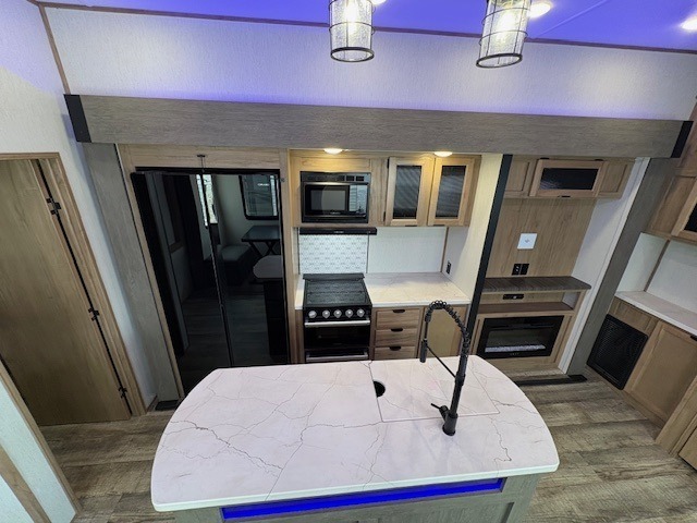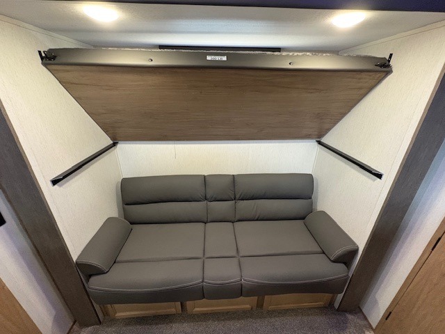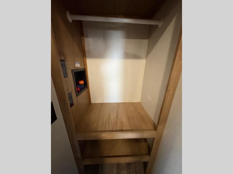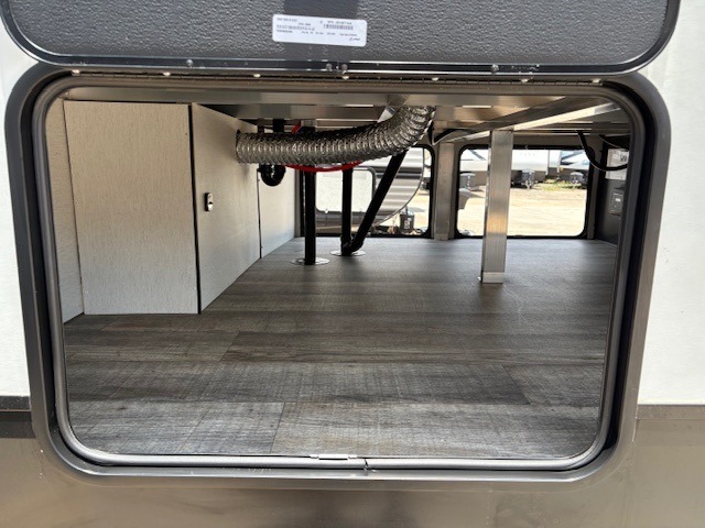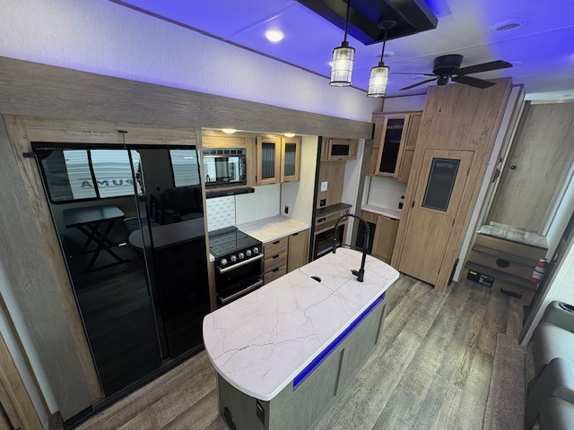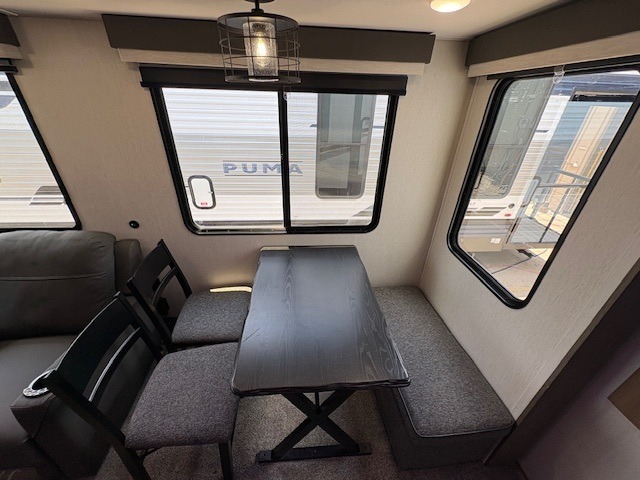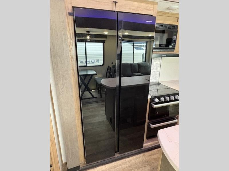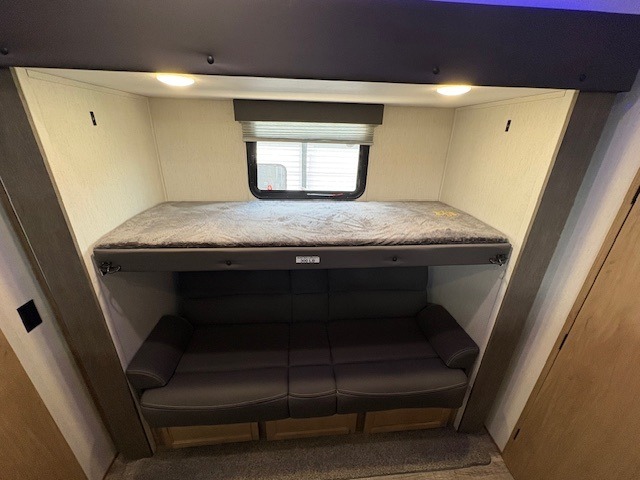 You can't beat this dual entry fifth wheel packed with luxury amenities! Your guests will love the rear private bunkhouse with their own full bath and exterior entry door, plus a jackknife sofa with drawers and a bunk above. There is even a 28" x 72" loft with overhead storage for more sleeping space! The main kitchen and living area includes dual opposing slides, theater seating across from the fireplace, and a free-standing table with chairs and a storage ottoman seat. The kitchen includes a 16 cu. ft. 12V residential refrigerator, a hutch, and a pantry for storage as well. You'll find the second full bath to be super convenient when traveling with friends and family, and the front private bedroom will feel just like home. Here, you'll find a king bed slide out, a wardrobe, shelves, and a desk area if you're working remotely. Head outdoors to enjoy the exterior griddle and two exterior refrigerators, plus the 15' power awning and pass-through storage!