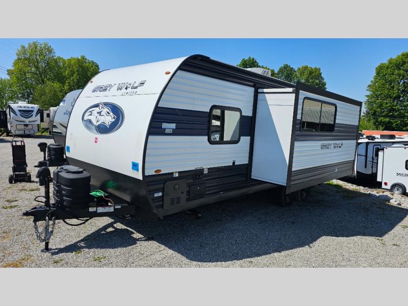 Whether it's a journey that will take you to new locations or a tried-and-true getaway to that favorite and memorable destination, the Forest River Cherokee Grey Wolf travel trailers and toy haulers are going to make the trip worth it every single time! You can travel in confidence with the premium wheel package, seamless roofing membrane with heat reflectivity, Power Gear frame technology with space-saver rail design, and Cherokee back-up camera system. The Cherokee Grey Wolf's interior is highly attractive with its stainless steel kitchen suite package and premium bedding ensemble and comforter, and 8" ceiling-mounted subwoofer with accent lighting. You will also find a black waste tank flush-out kit, an outside shower with hot and cold water, an armored underbelly tank enclosure, and an RV grill quick connect.