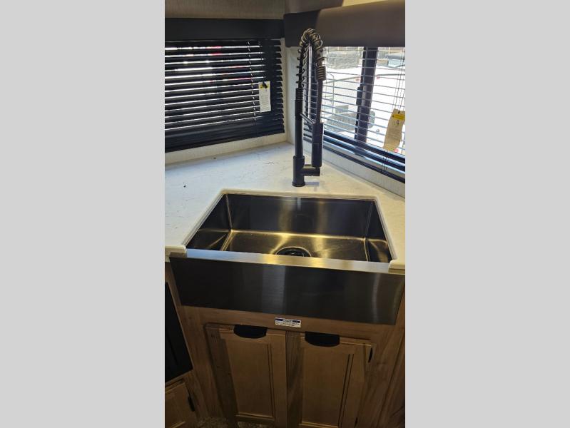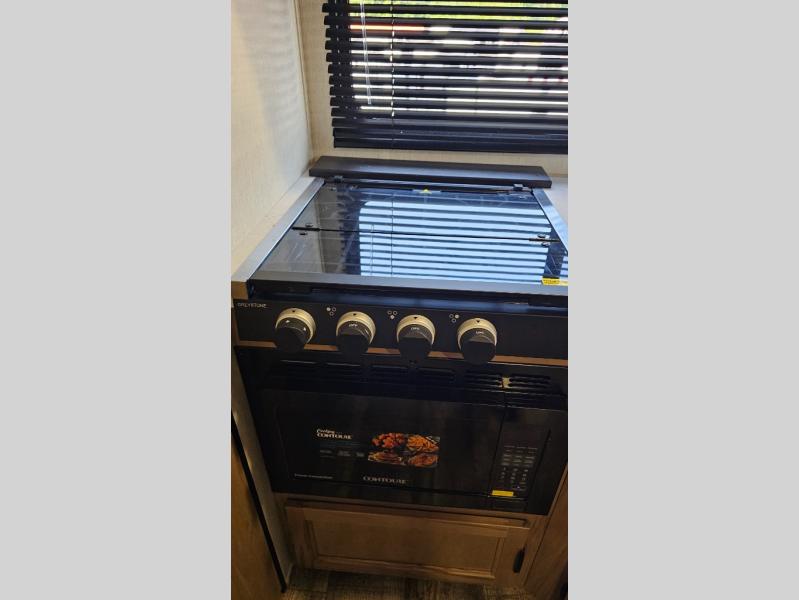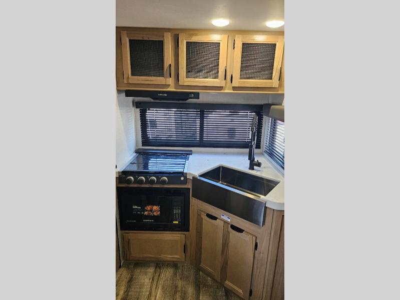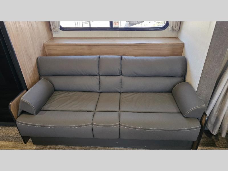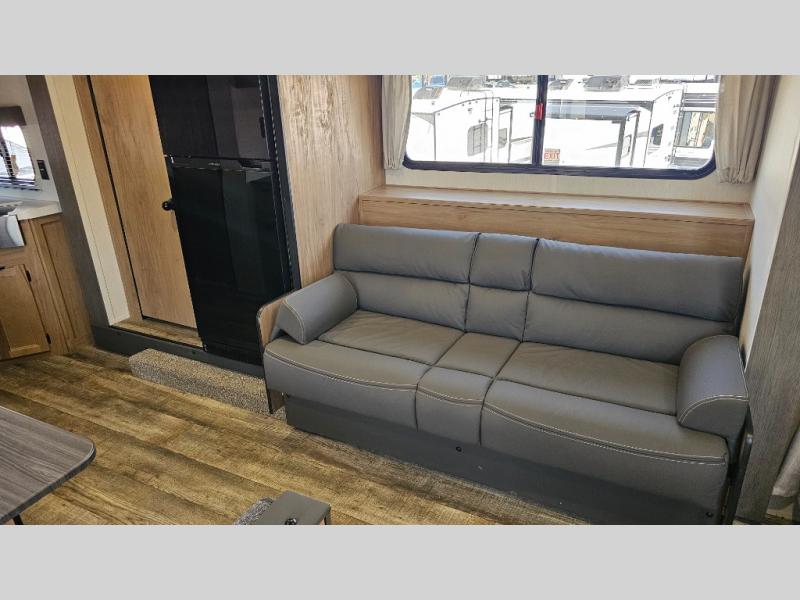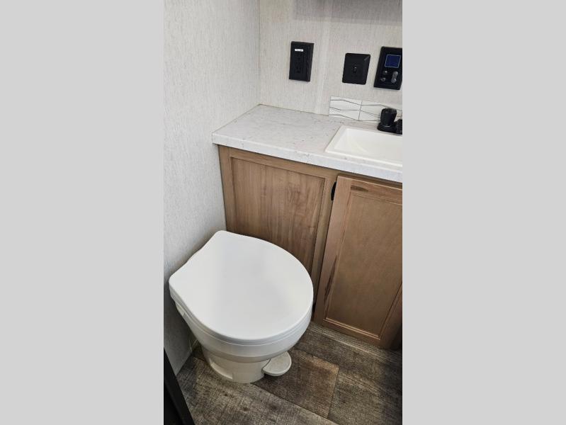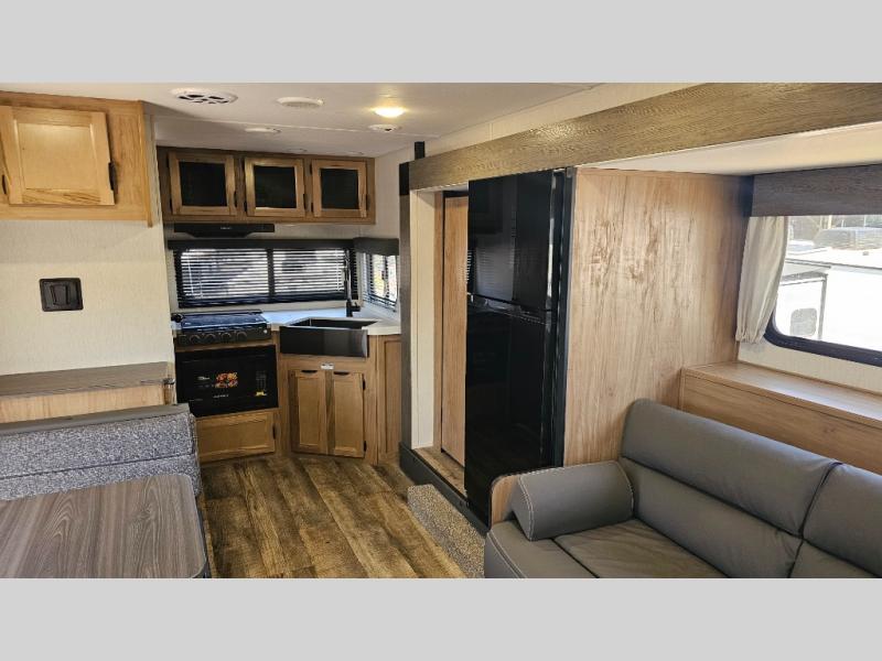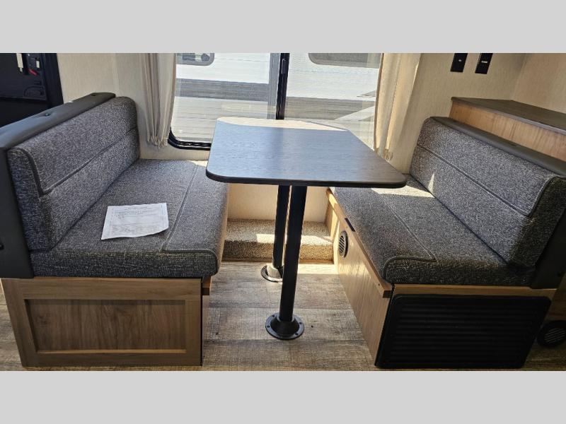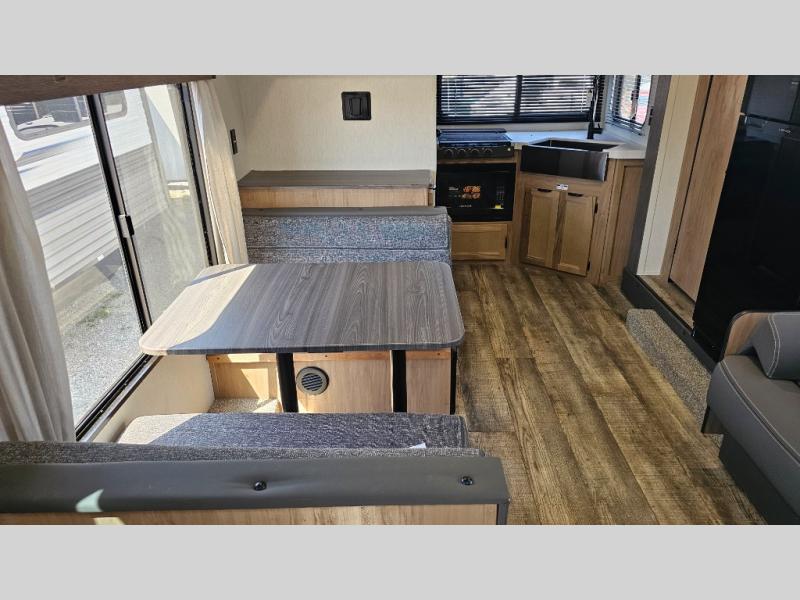 You will love traveling with this Cherokee Grey Wolf in tow. This is a great unit for a couple or family as the booth dinette and sofa can both be used for added sleeping for children or quests if needed. There is a comfortable queen bed up front that you will love for a great night's rest with storage space in nightstands and wardrobes for your clothing and things on either side of the bed. A two burner cooktop and air fryer is available for cooking inside, and the rear corner bath includes a tub/shower, toilet and sink. A nice 15' awning creates more outdoor living space to enjoy protected from the elements both day and night with an LED light strip for after dark. You can also add a TV on the exterior as it has an outside TV mount.