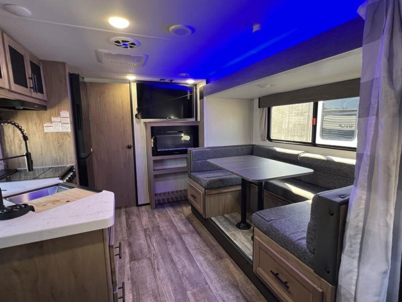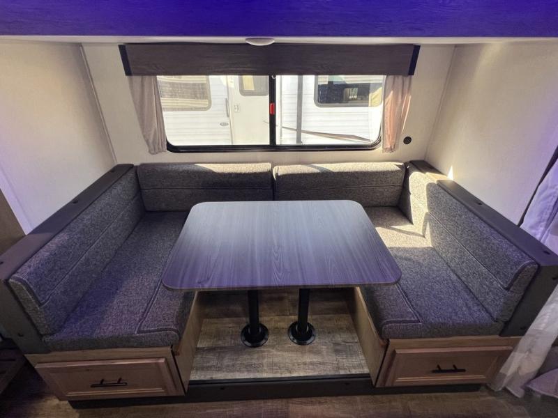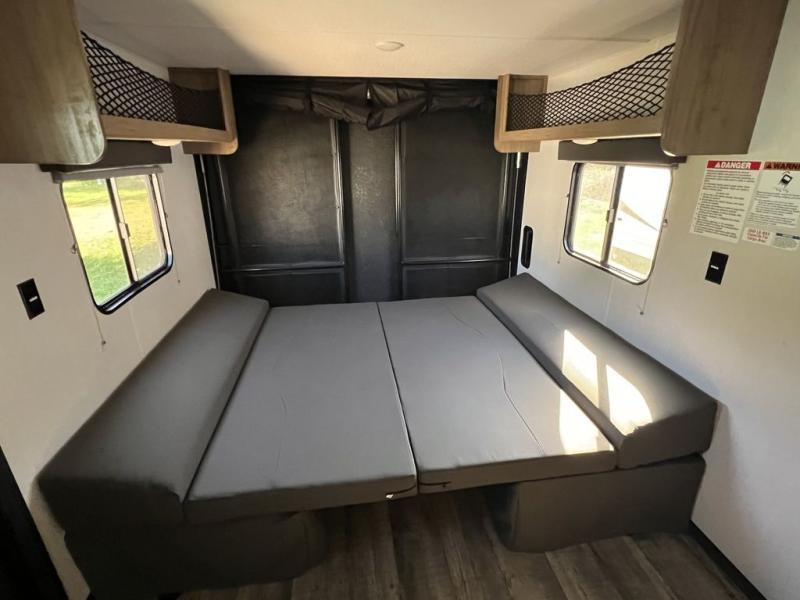 This Cherokee Grey Wolf toy hauler is perfect for those who are concerned about keeping the fuel smells and grime from entering the main living area. In this unit you can enjoy the separation with a door and the walk-though bath. In the cargo area, you will have plenty of space for hauling all of your favorite toys. This area also features dual fold-down sofas with a dinette table that is great for your thrill seekers to come in for a break from riding. It also allows quick access into the bathroom without having to wander through the entire main living area where you are likely to leave a trail behind. After a full day of playing hard, you can get cleaned up and head into the main kitchen area where you will enjoy a U-shaped dinette. A full kitchen allows you to refuel your body, and there is also a queen bed up front for a great night's rest!